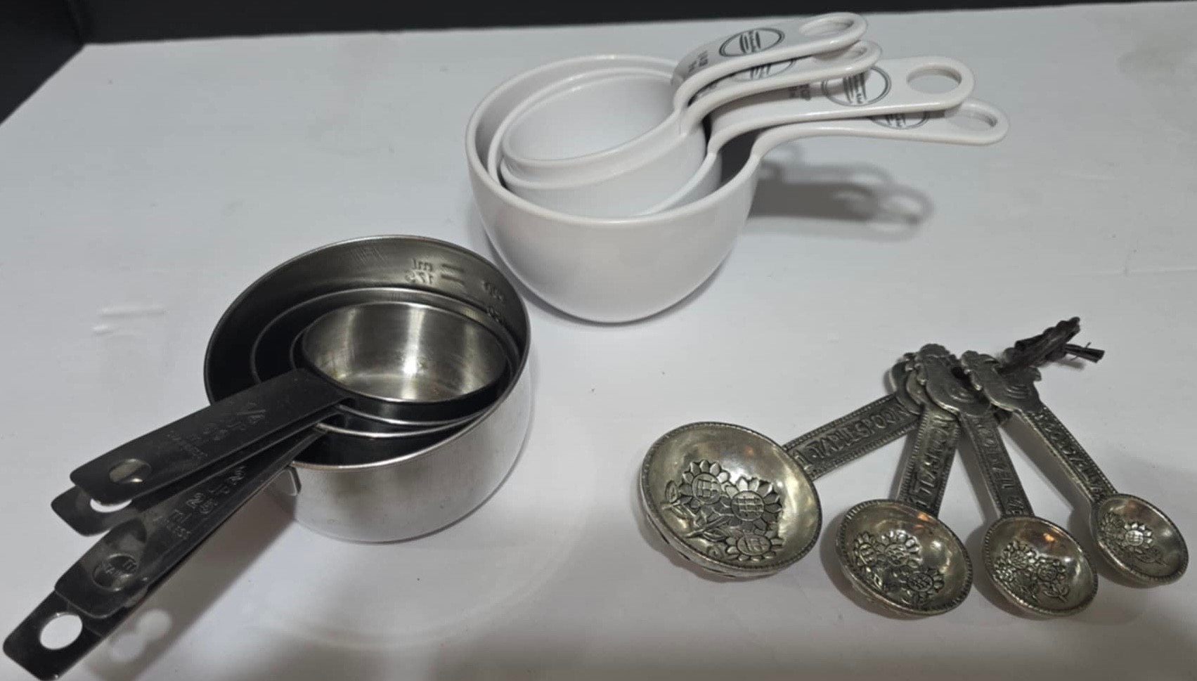 Ganz Measuring Spoons Set featuring a rooster, chickens, and sunflower embossed design and 2 sets of measuring cups.