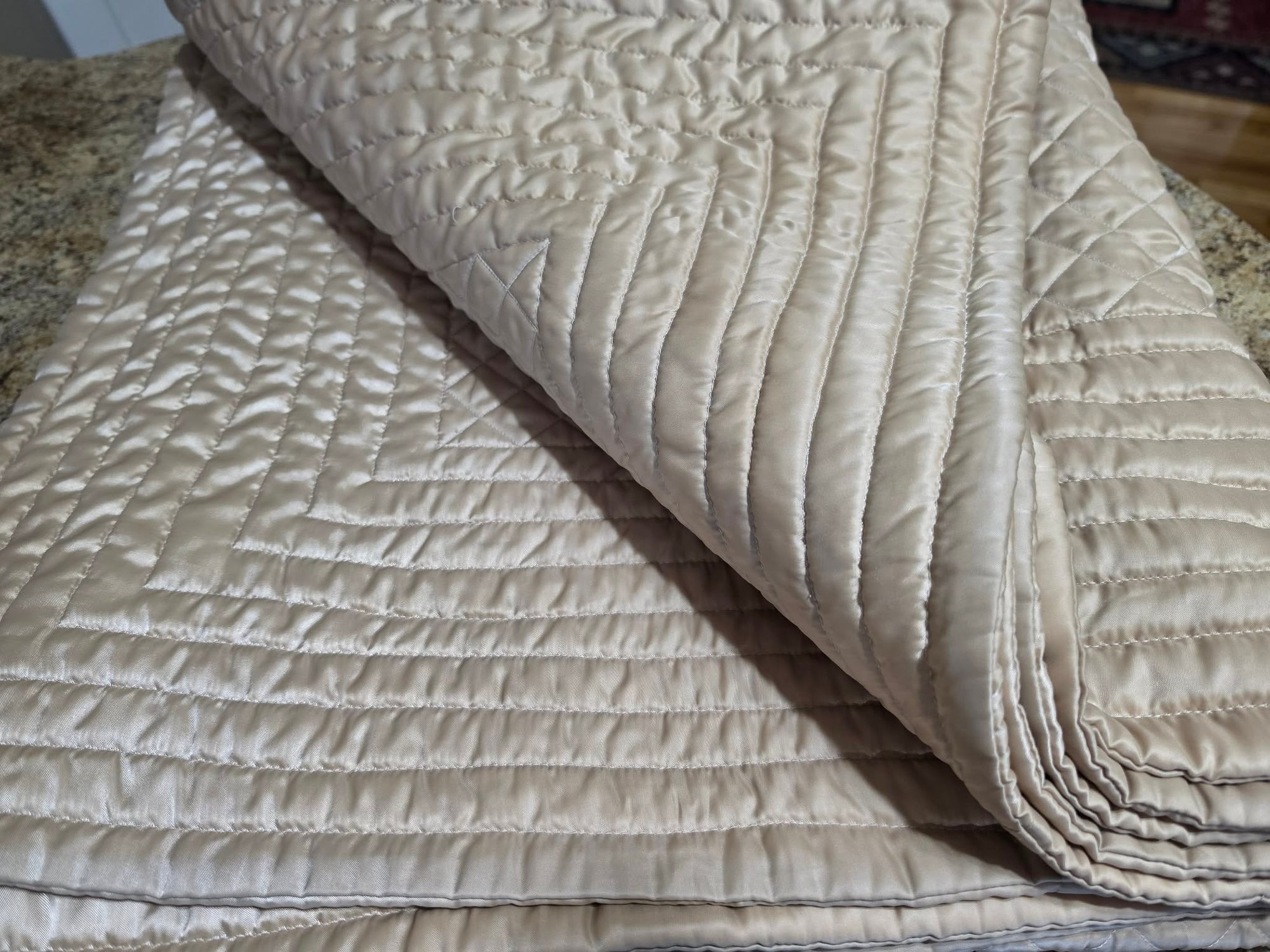 Appears to be a diamond quilted velvet coverlet, Measures approximately 92 x 88. Taupe in color. Very nice condition.