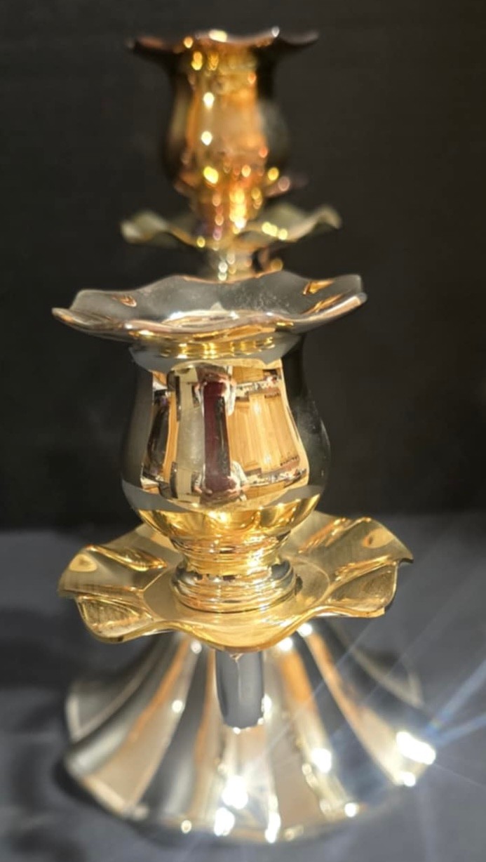 Appears to be a silverplate embossed three-arm candelabra candlestick holder. measures 14w x 5.5d x 9.25h.