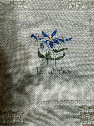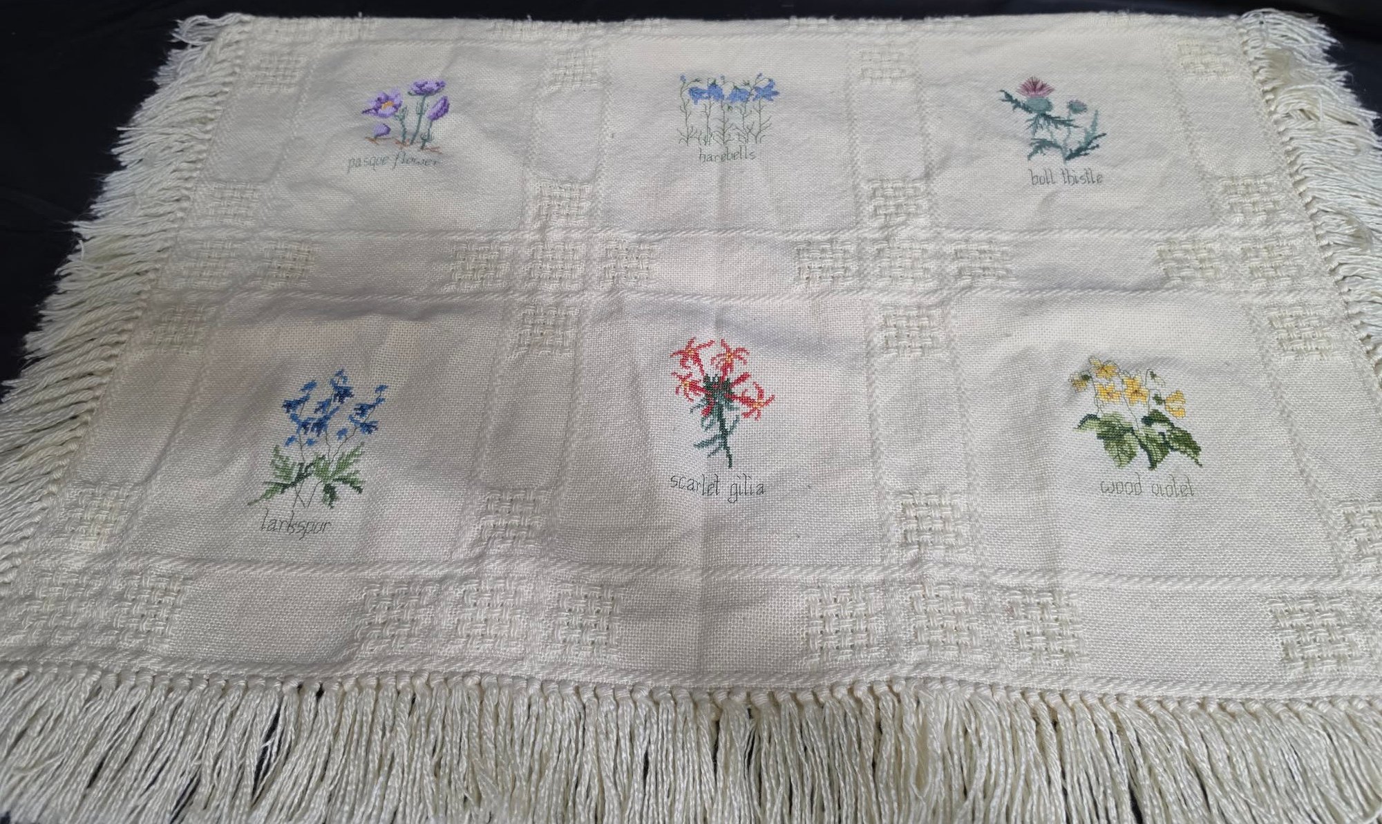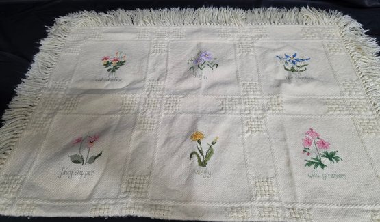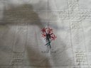Appears to be a vintage embroidered linen tablecloth. Measures 32 x 44 excluding the fringe.