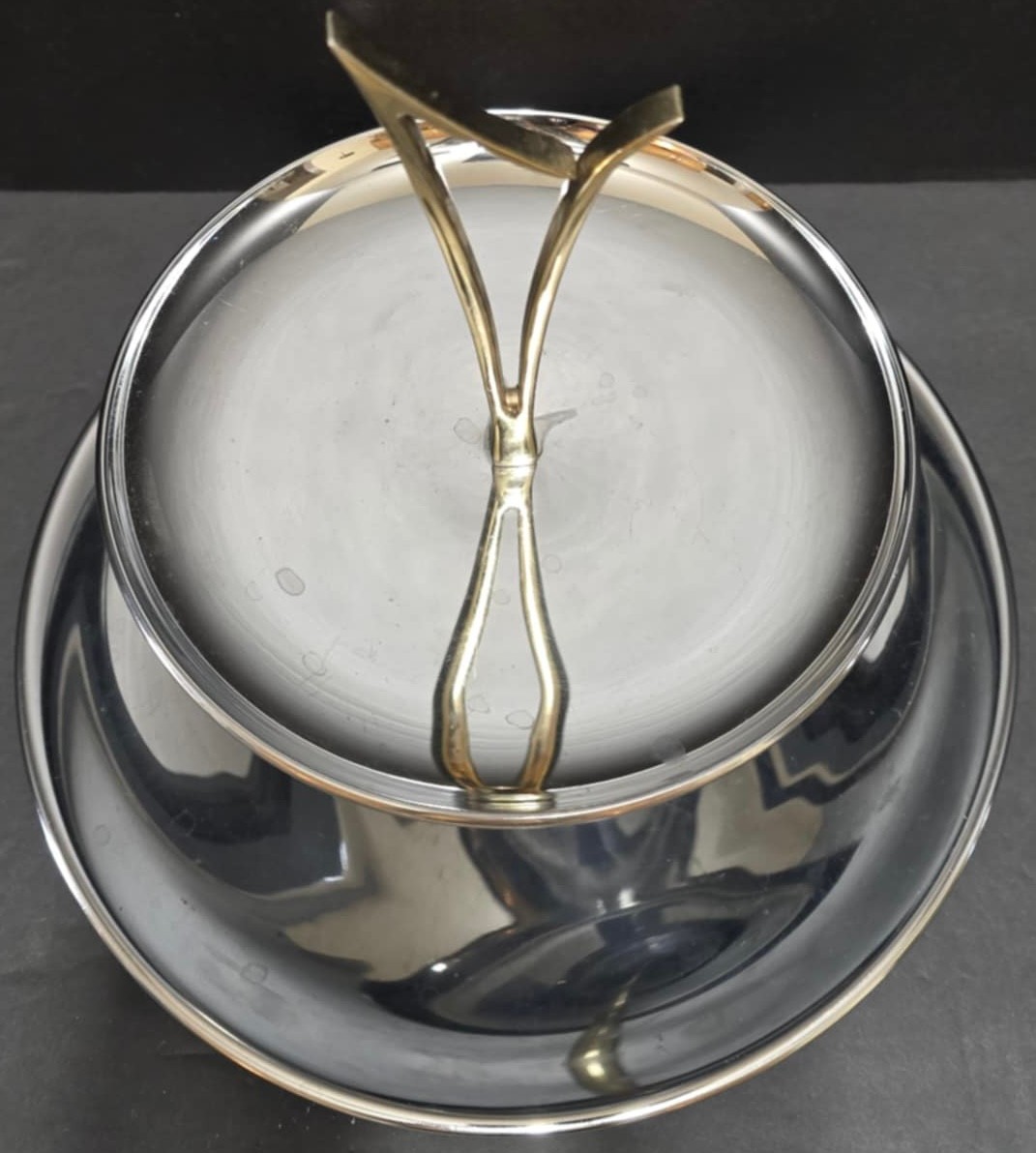 Appears to be vintage Kromex Mid-Century Modern 2-tier serving tray with a chrome finish and a gold-tone atomic handle. Measures 13 x 11. Small tray is 8.5.