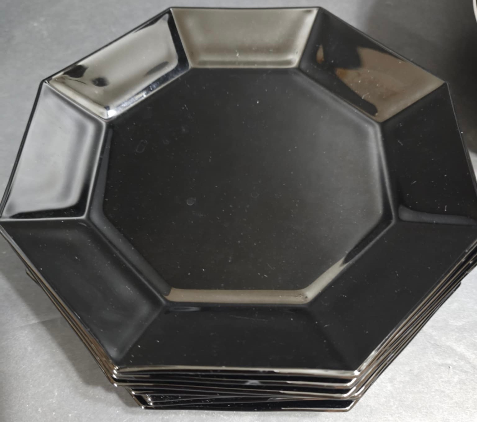 Partial Set of Black & White Dishes. Large Plate/Bowls are 9" (8)black plates (7) are 7.25, glasses are 3.75 (5) and cups are 4 x 3 not counting handle (8). There are few very small chips in the large bowls.