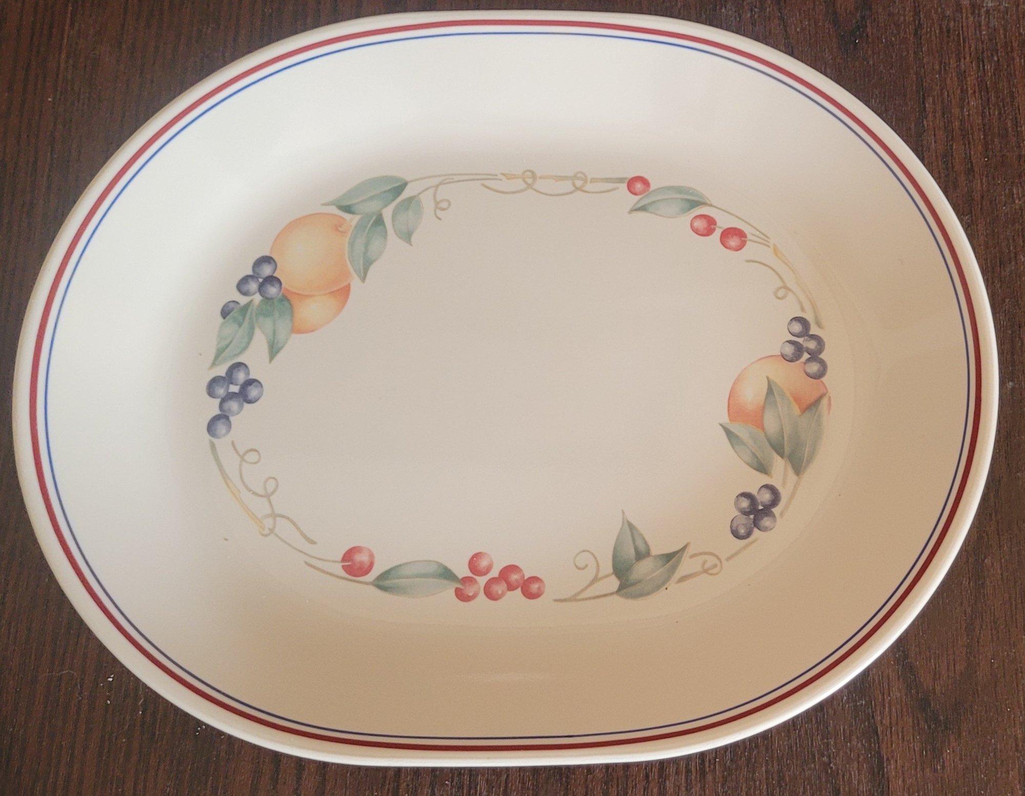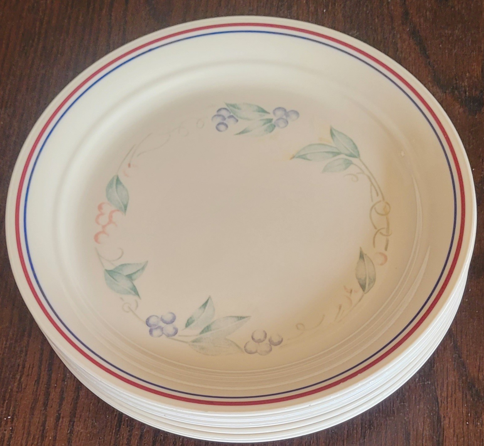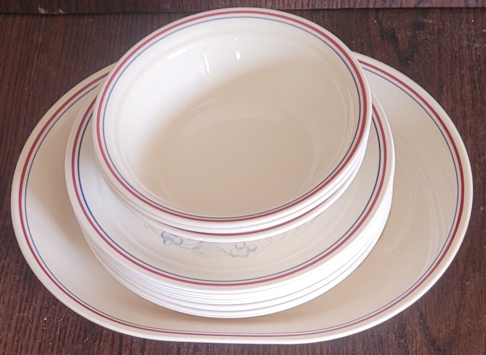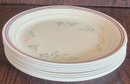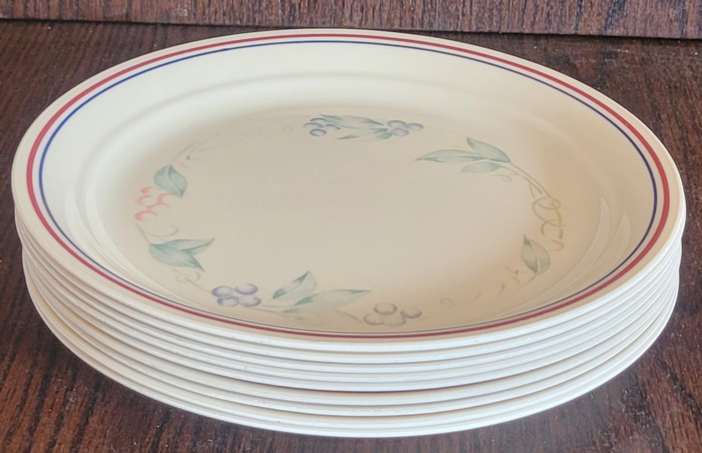 This lot comes with a platter that measures 12" long by 10" wide, 9 plates that measure 8.5" in diameter and 3 bowls that measure 1.75" tall by 6.75" in diameter. These have been used so some of the coloring has faded. See pictures for details.