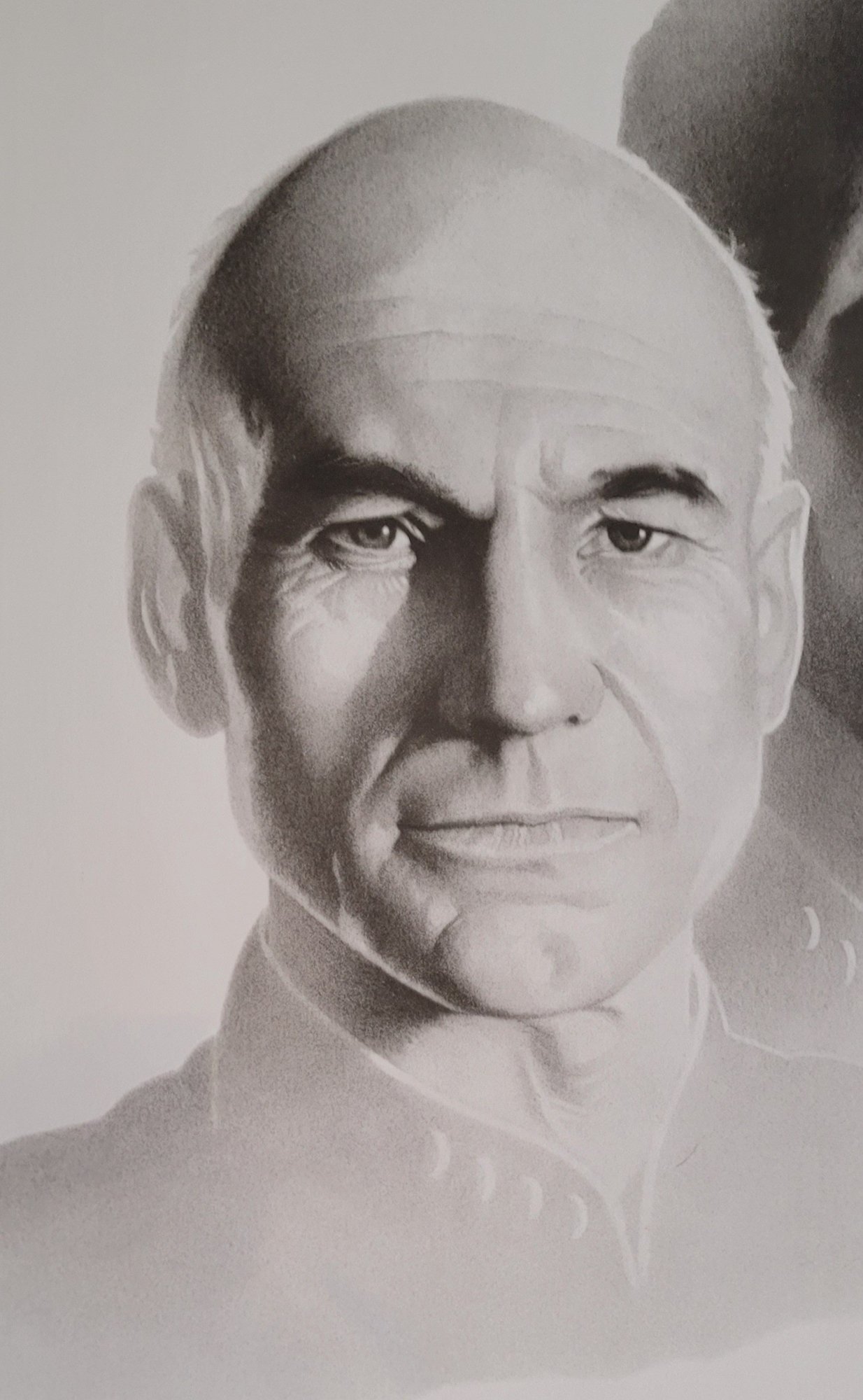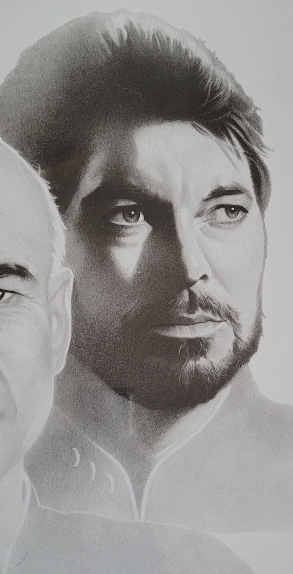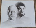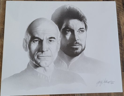 The product is a vintage 1992 Star Trek lithograph featuring characters Picard and Riker from The Next Generation series. This collectible item is signed by artist Gary Saderup and was produced for the Destination Star Trek convention. It is a unique and sought-after piece for fans of the Star Trek franchise, showcasing iconic characters in a science fiction and horror genre setting. Made in the United States, this lithograph is a must-have for any serious collector of Star Trek memorabilia.