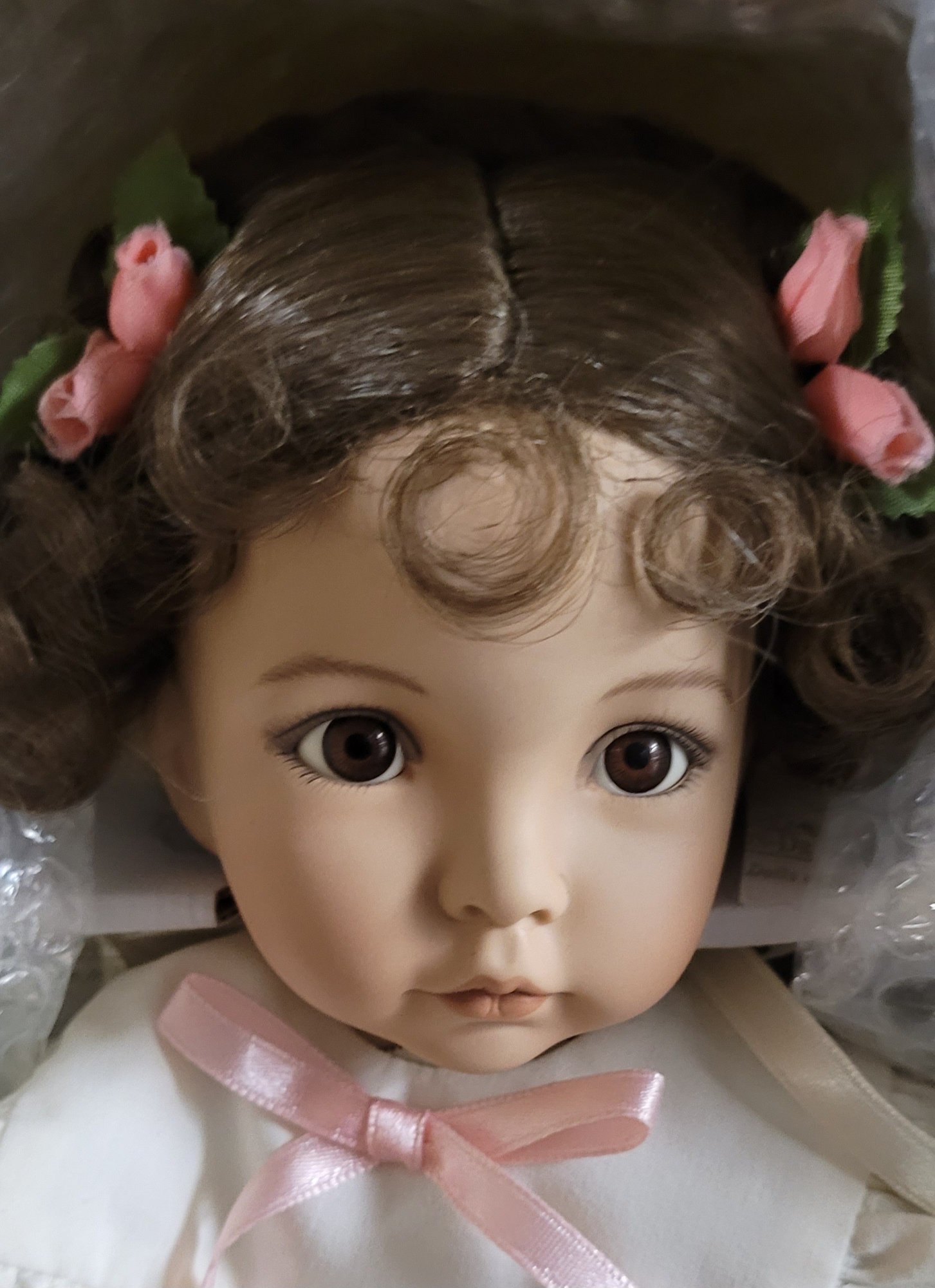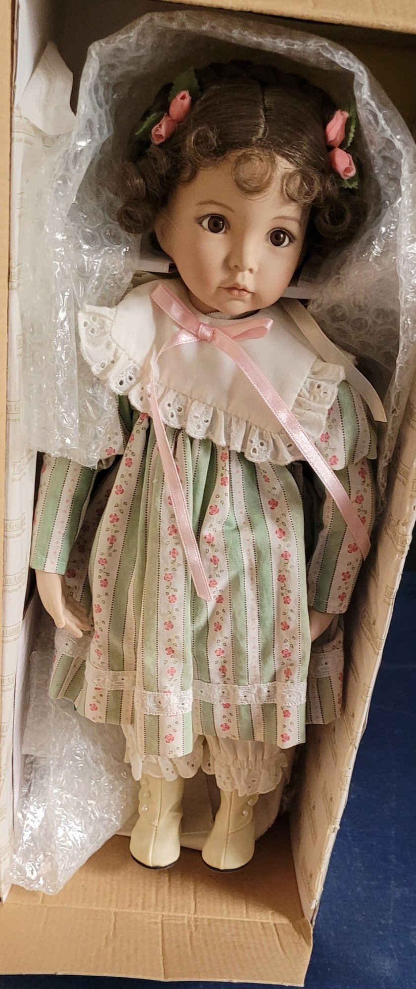 This measures 16" tall and is a porcelain doll. Comes in the original box. See pictures for details.