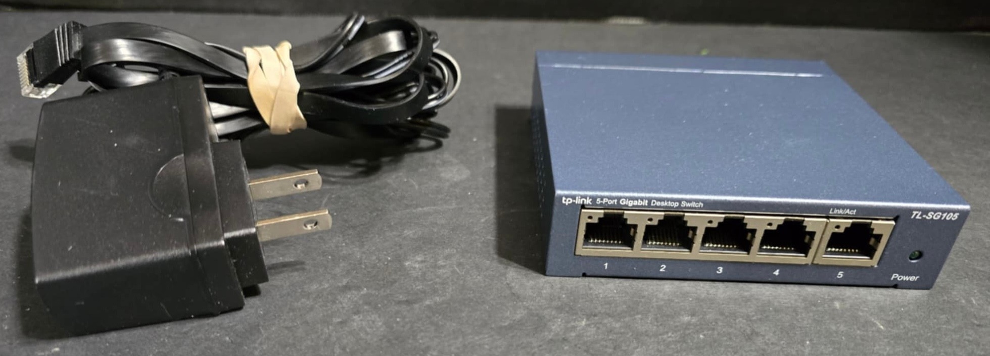 Assortment of computer networking and storage equipment, including an external floppy disk drive and a network switch. Untested.