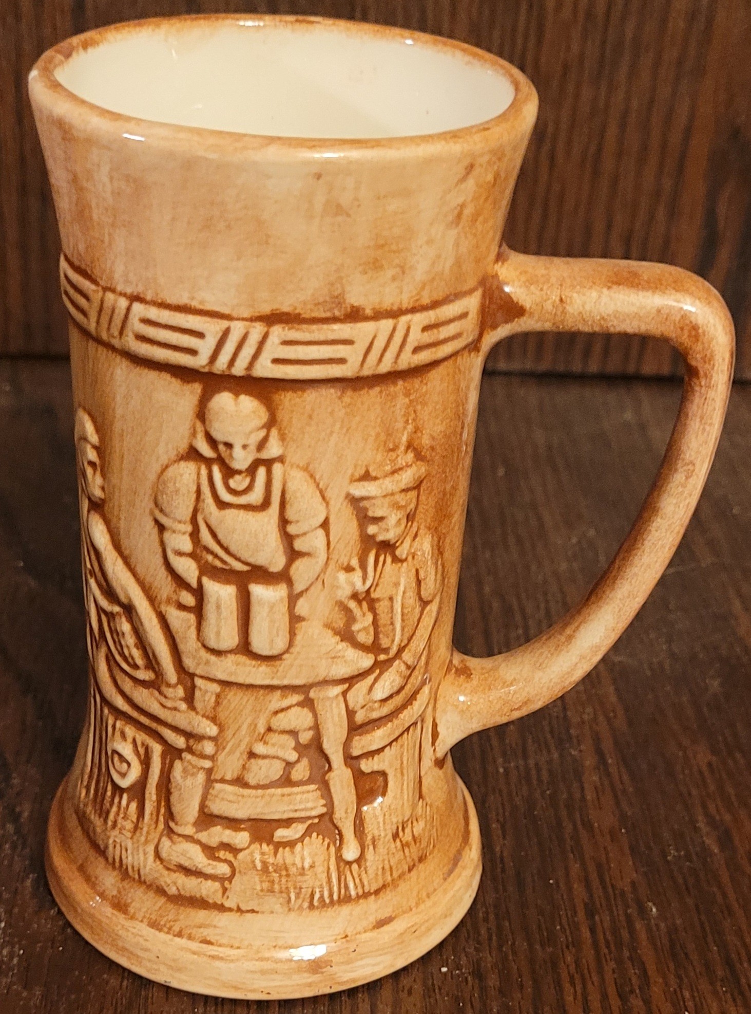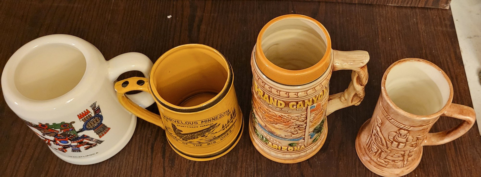 This lot comes with different mugs. These measure 5.75" tall, 4.75" tall, 5.25" tall, and 7.25" tall. One of them does have a chip on the handle. See pictures for details.
