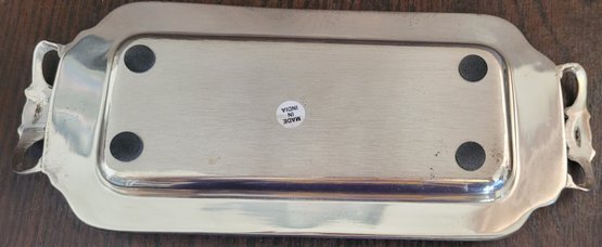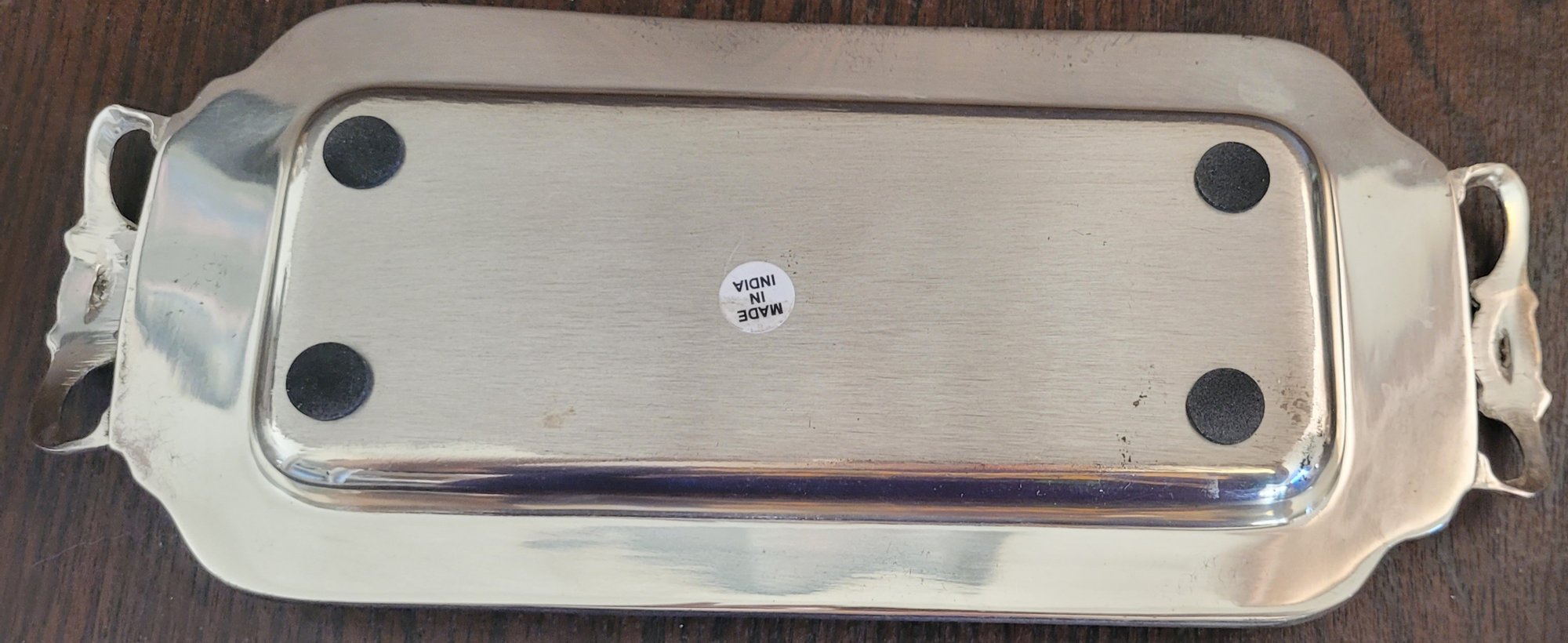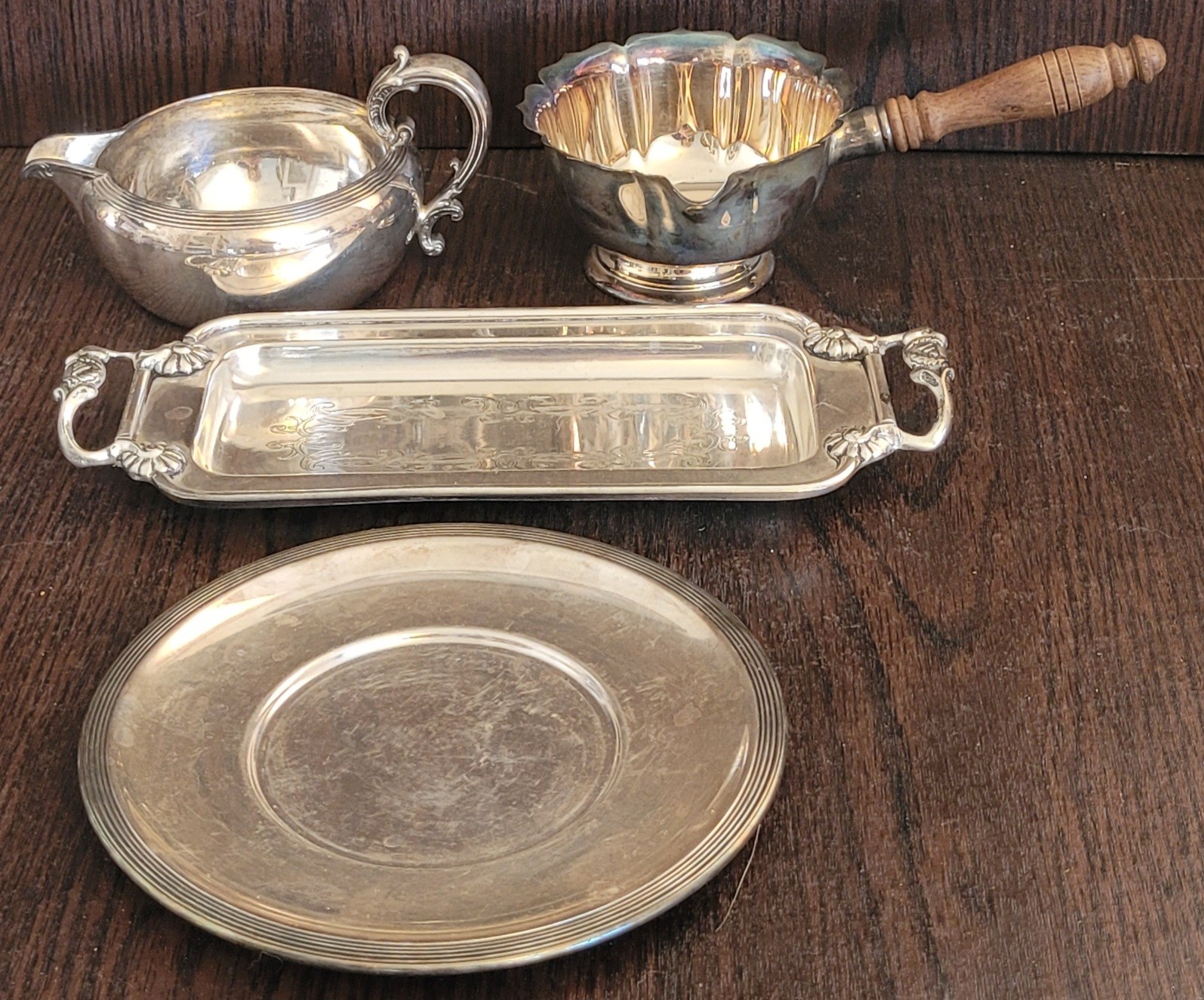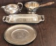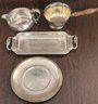 The plates measures 7" in diameter, the tray measures 11" long by 4.375" wide, the one with the wood handle measures 8.5" long by 5.125" wide by 2.5" tall and the last one measures 3.5" tall by 6.5" long by 4.5" wide. See pictures for details.