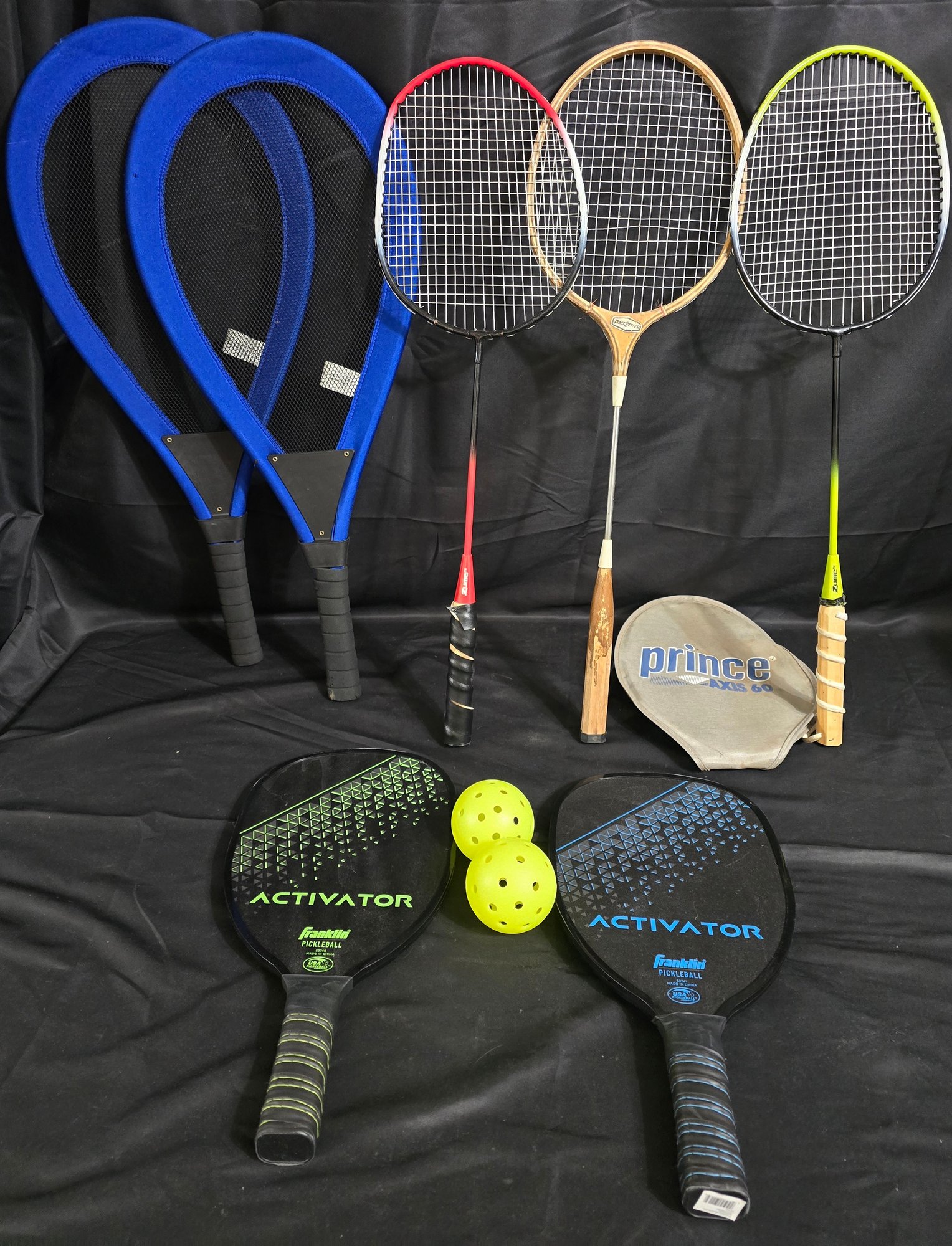 Badminton, Pickle ball & Whackminton rackets with 2 balls.