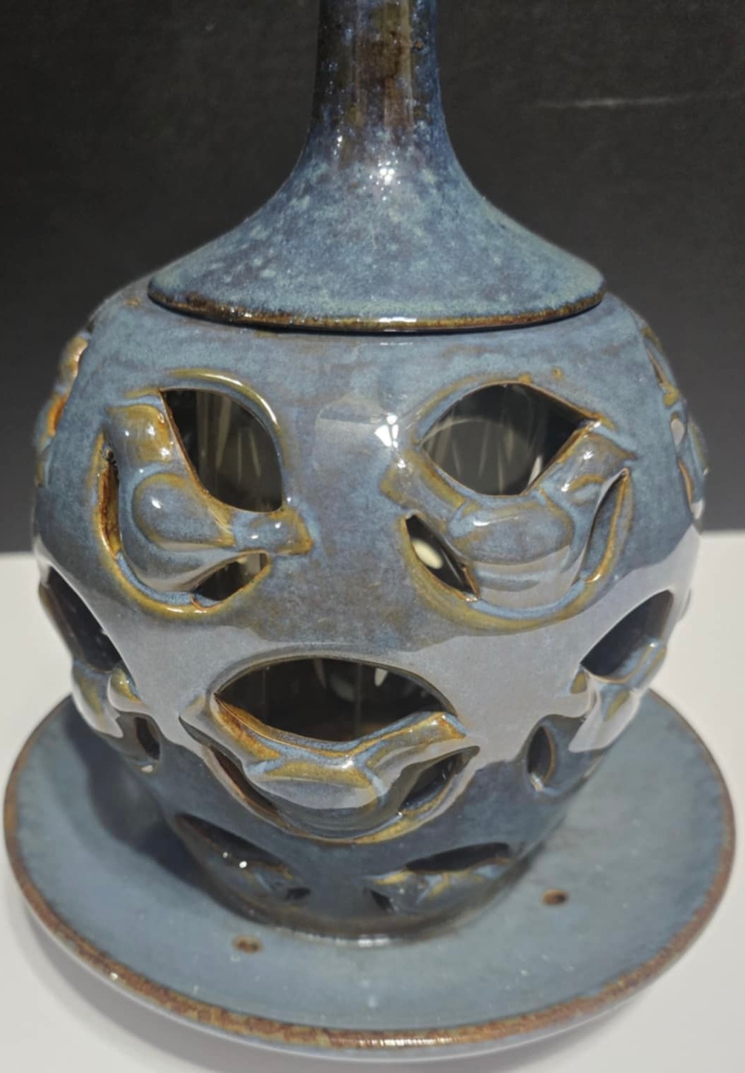 Bird Feeder Blue Glazed Ceramic W/bird Cutout Design W/hanger. Measures 7 x 9 without hanger. Unused.