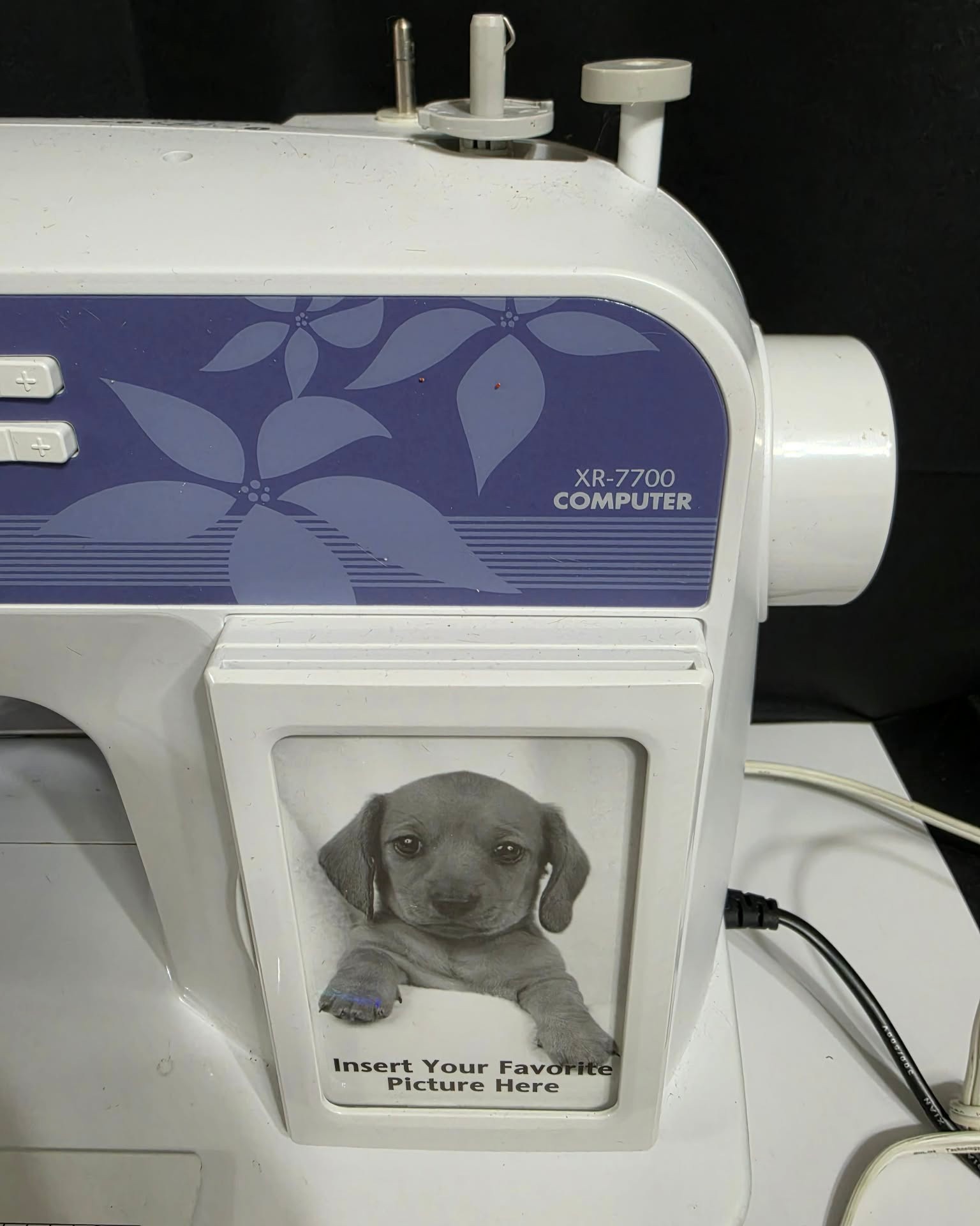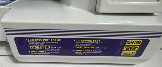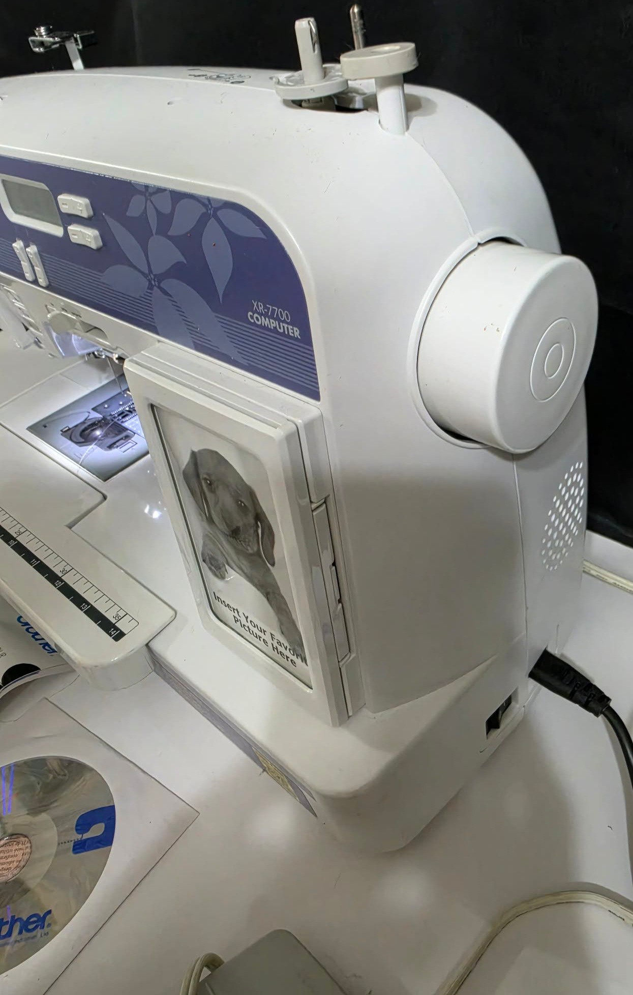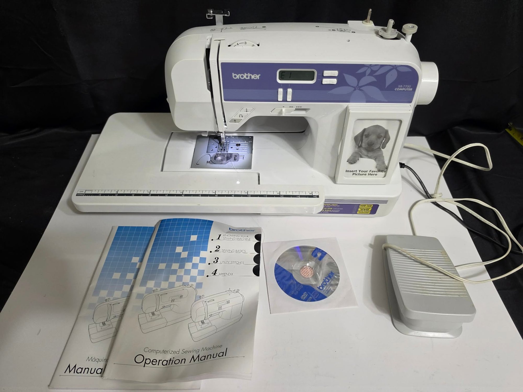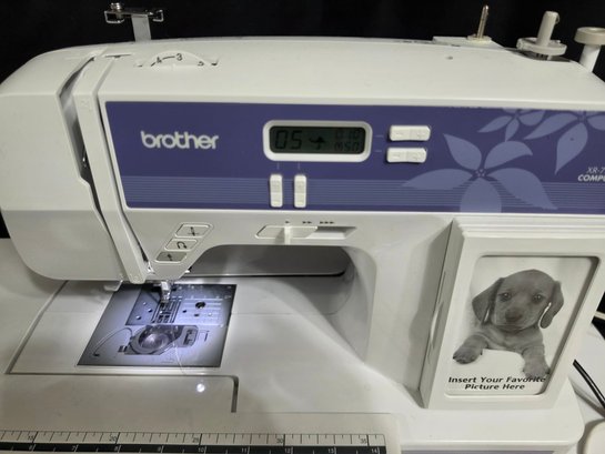 Brother XR7700 Computerized Sewing Machine. Turns on. Pedal works, however machine was not tested. Missing the flat bed attachment with accessories compartment. Comes as pictured only.