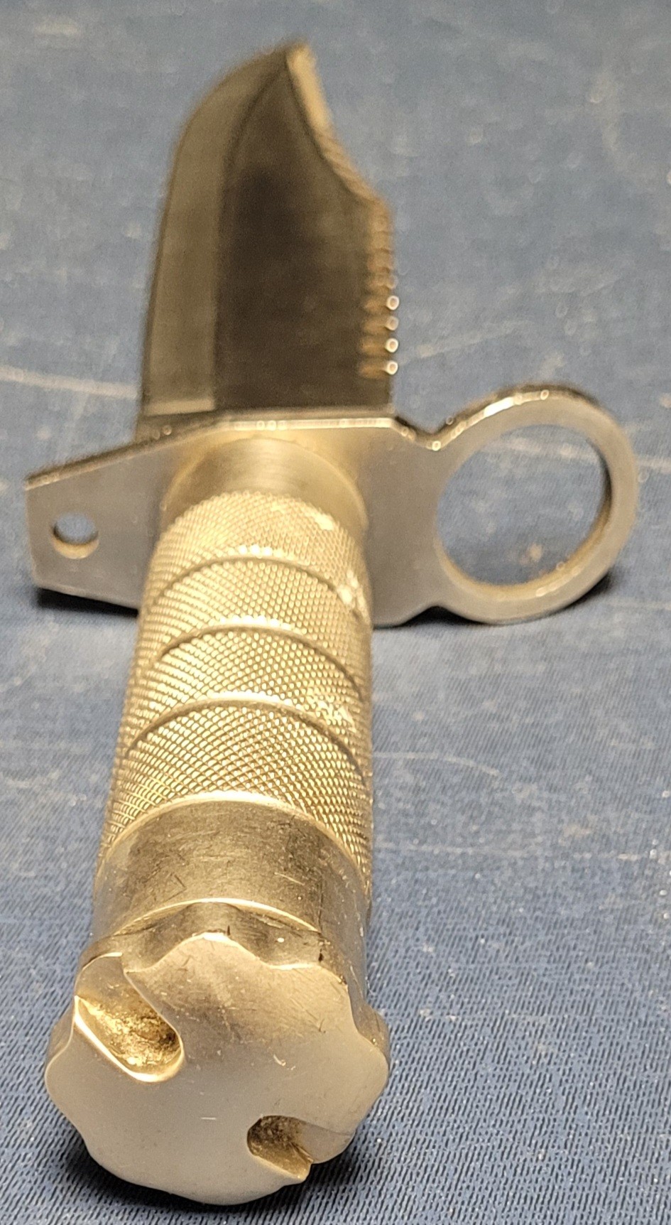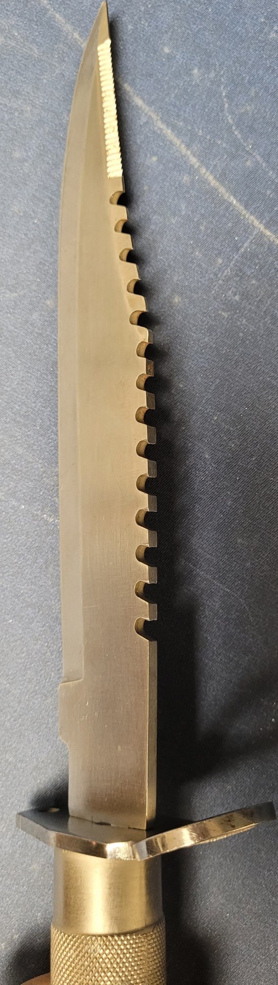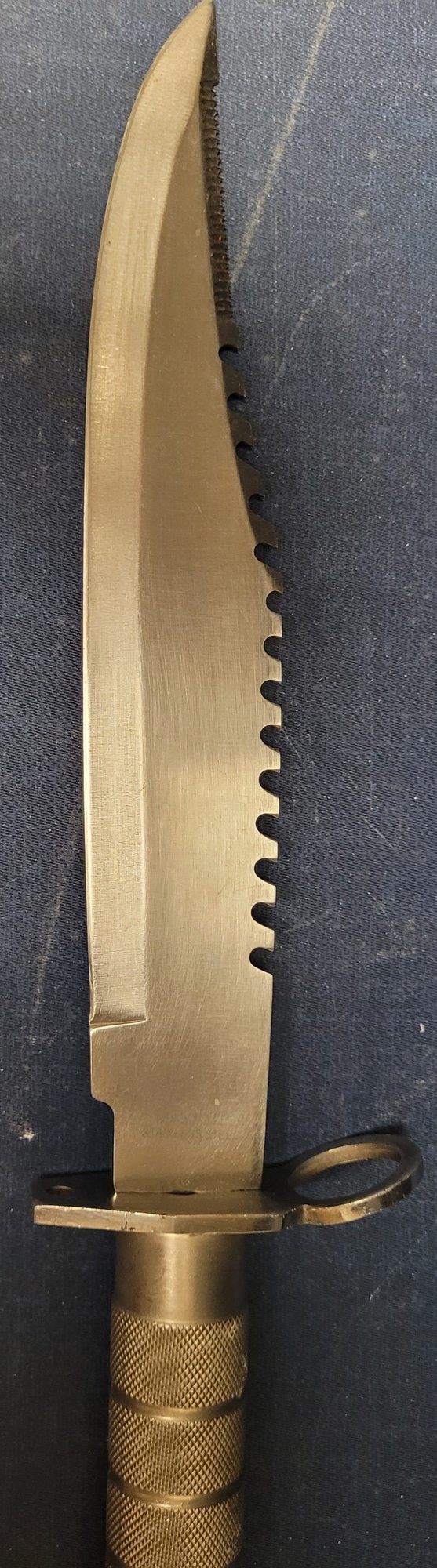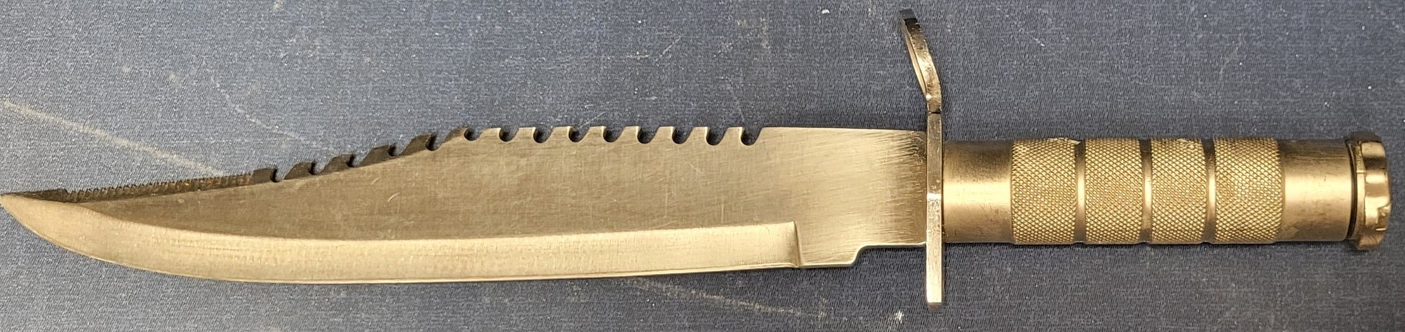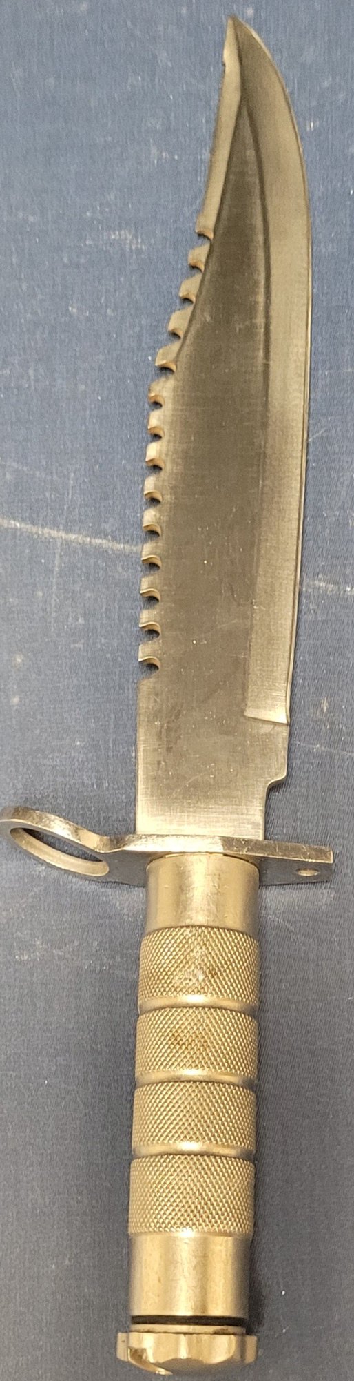This measures 14.75" long with a 9.75" blade. It is a Maxam Stainless steel knife. This looks gold in the picture, but it is silver. See pictures for details.
