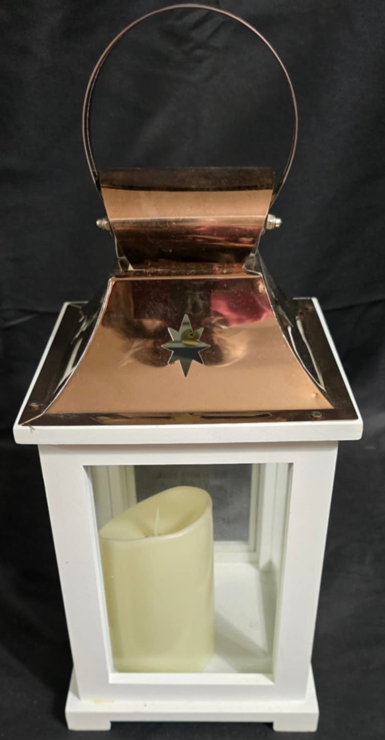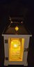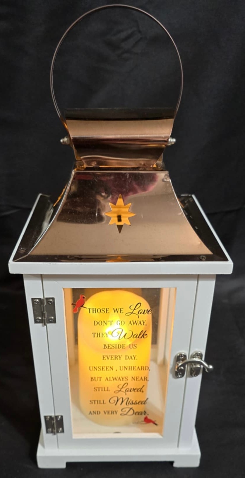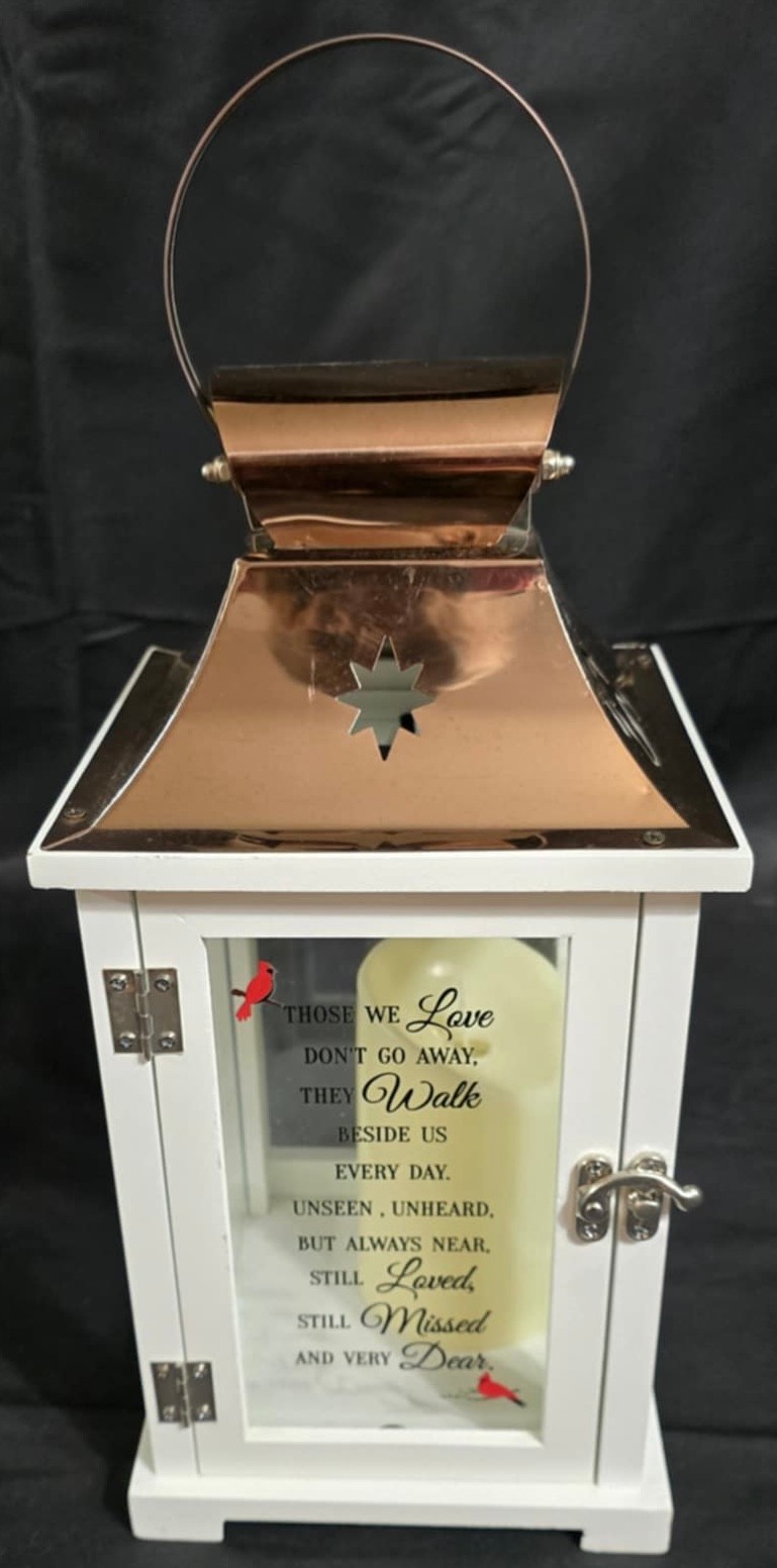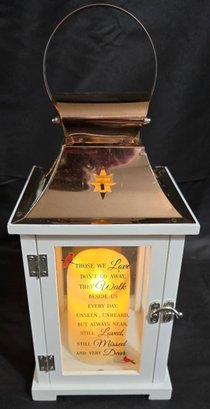 Carson Home Accents memorial lantern with a copper top and wood frame. Features a memorial poem on the door and has a battery operated candle inside. Measures 15.5h x 6.5 x 6.5.