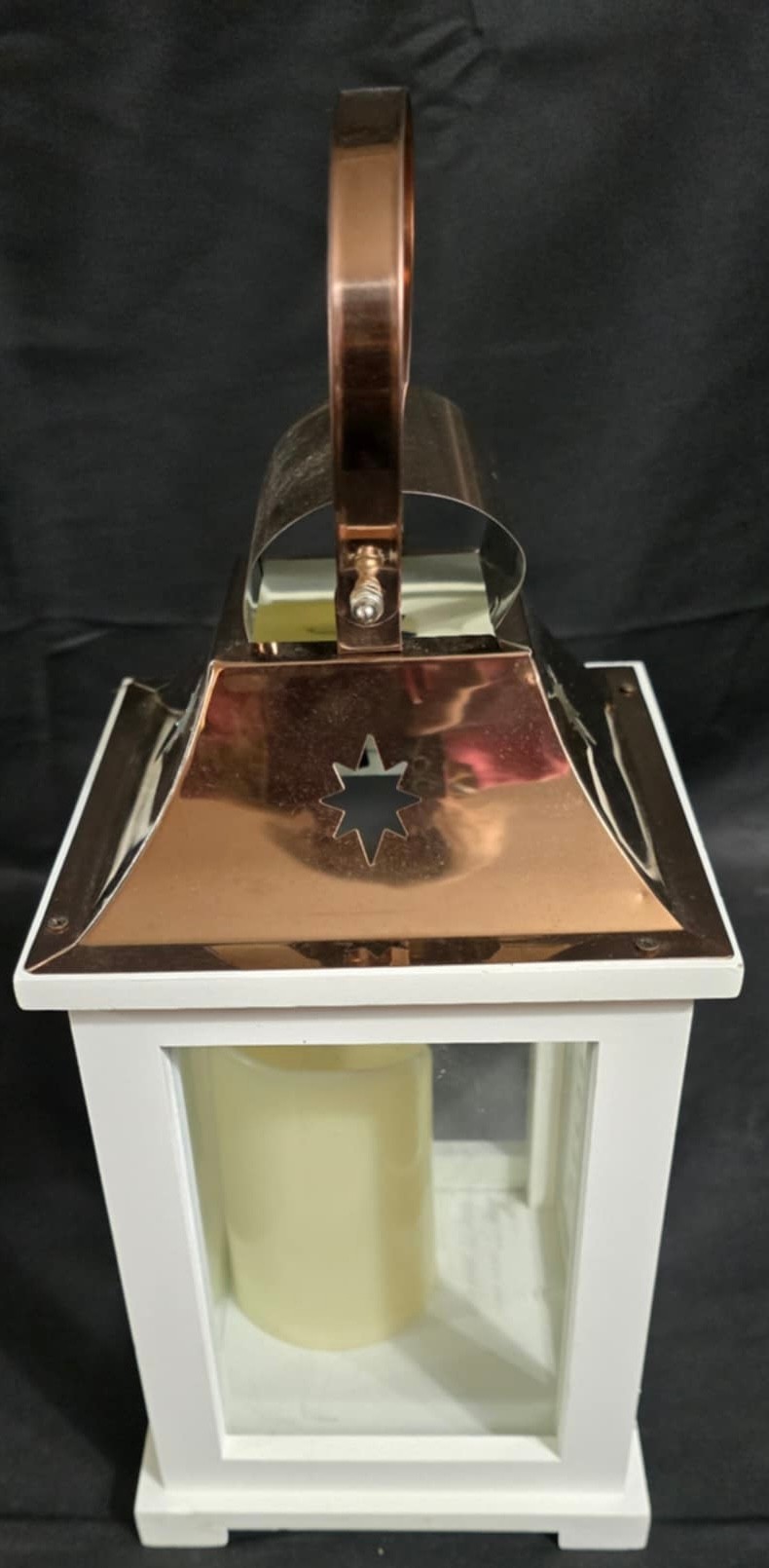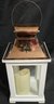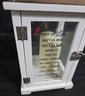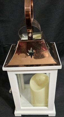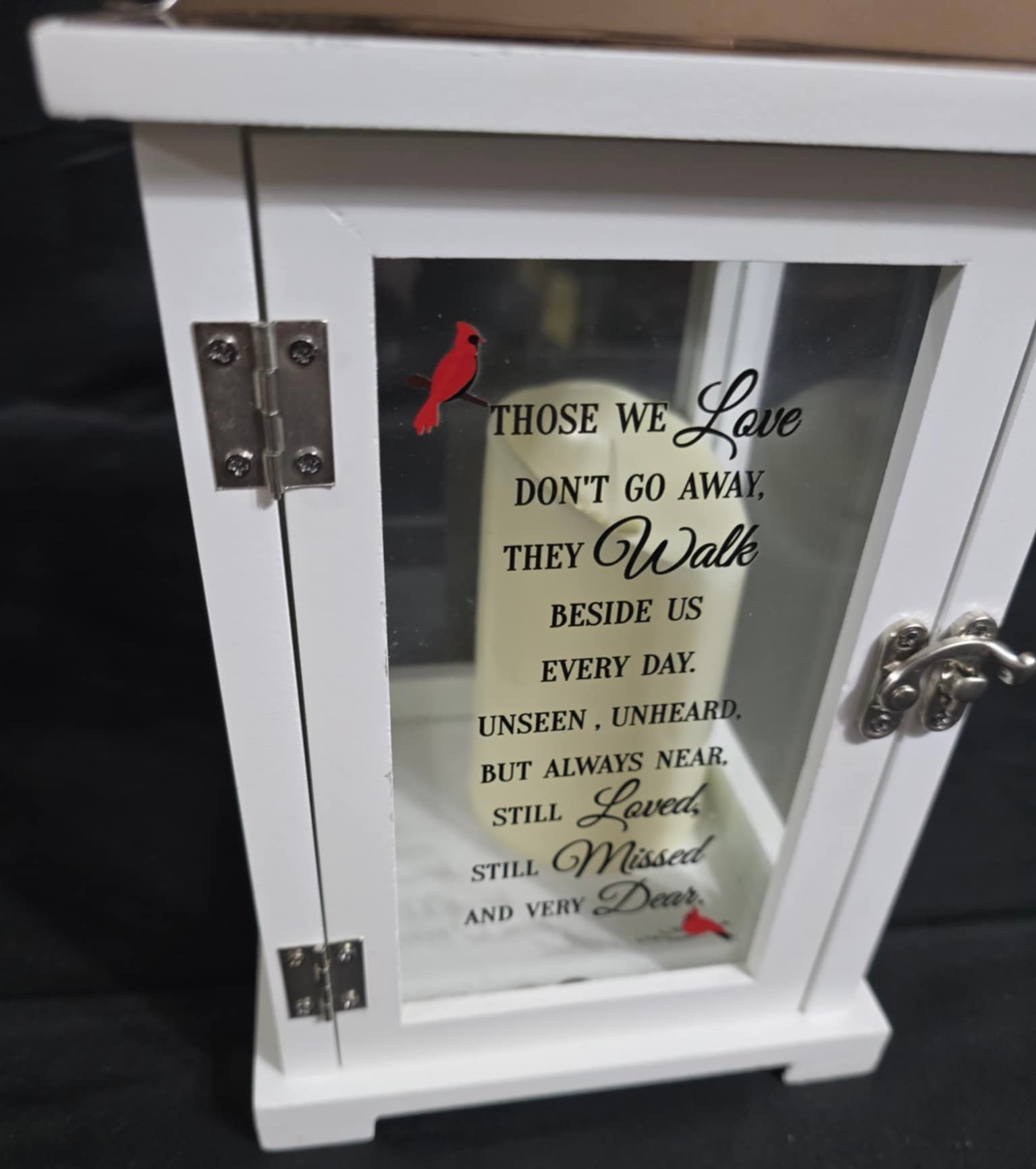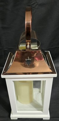 Carson Home Accents memorial lantern with a copper top and wood frame. Features a memorial poem on the door and has a battery operated candle inside. Measures 15.5h x 6.5 x 6.5.