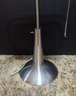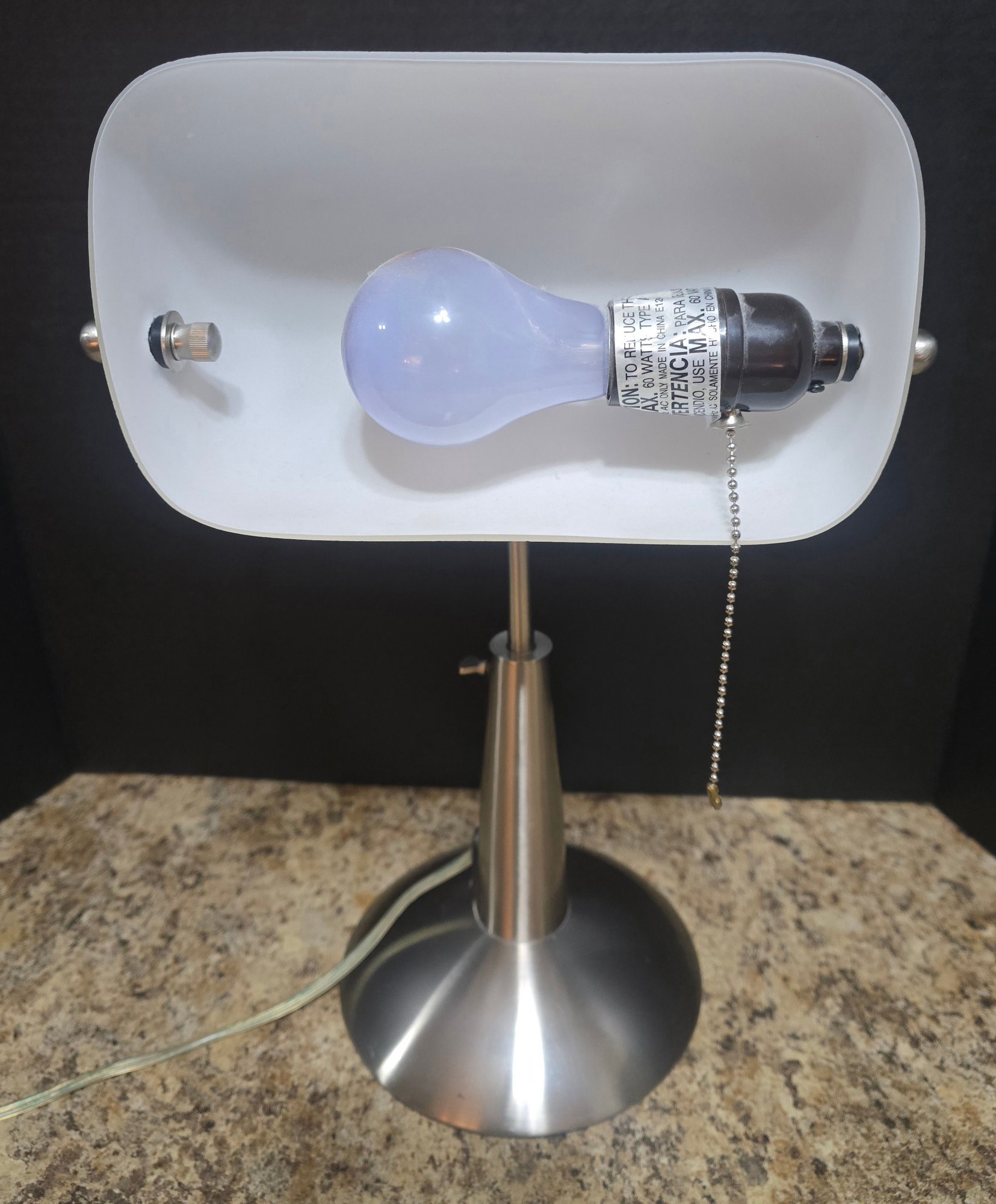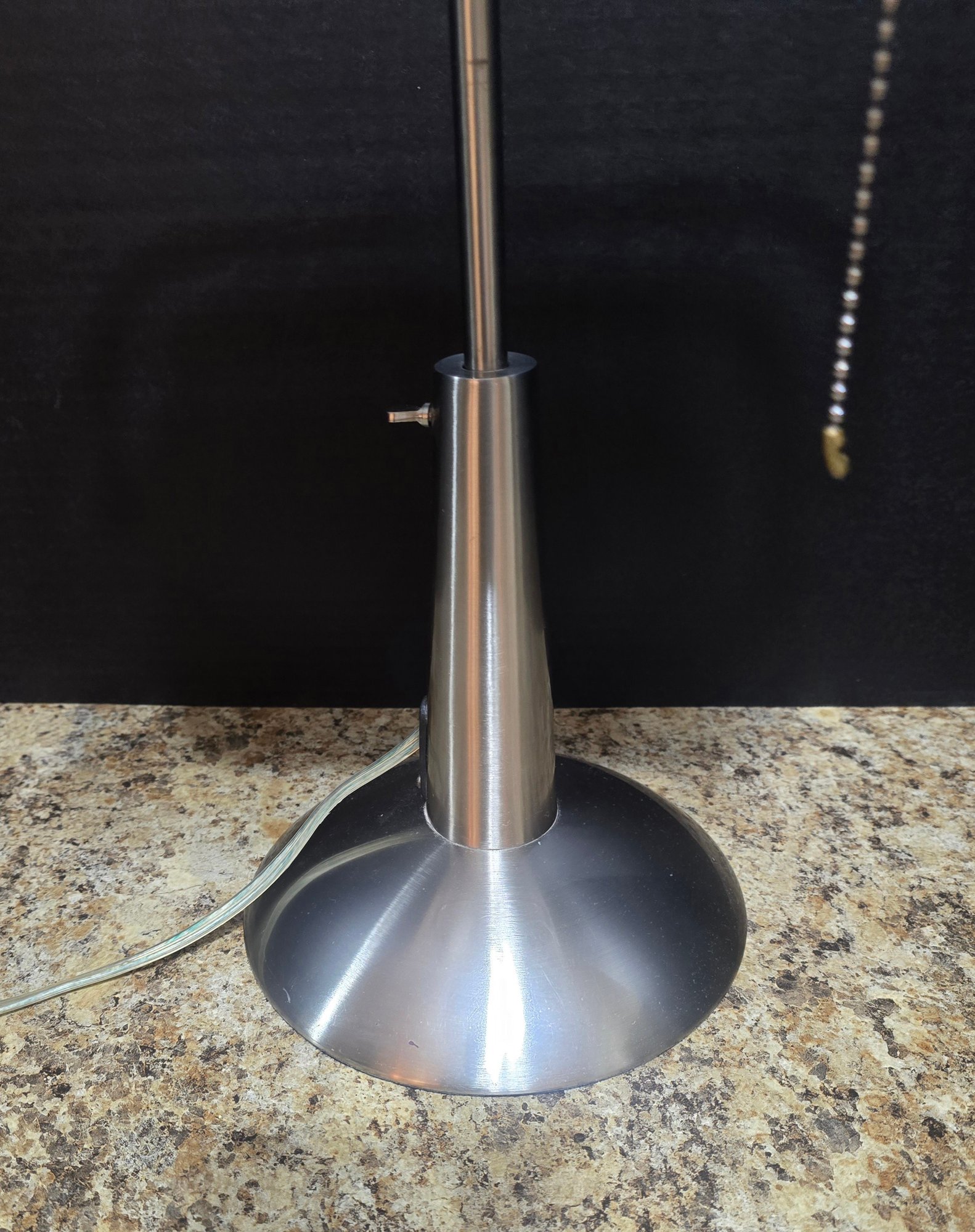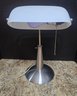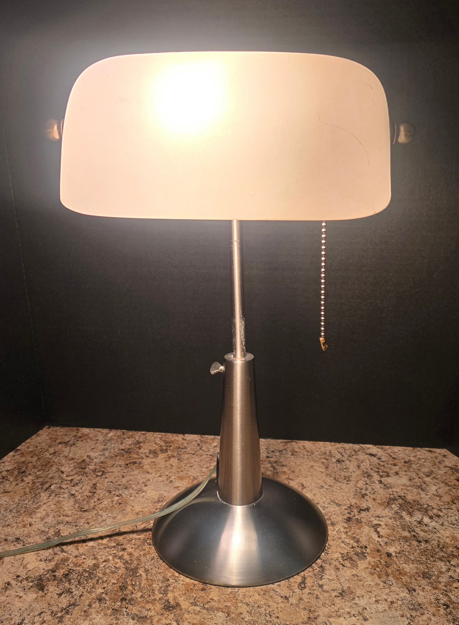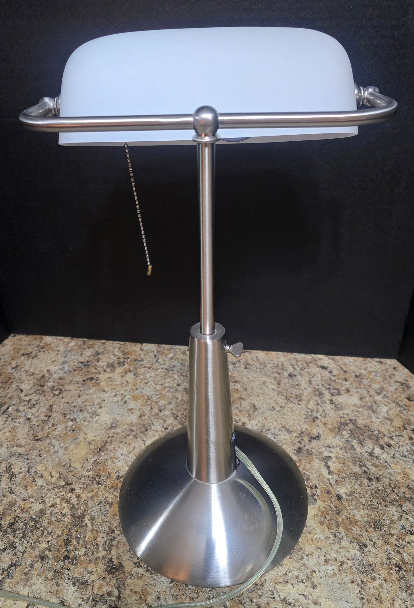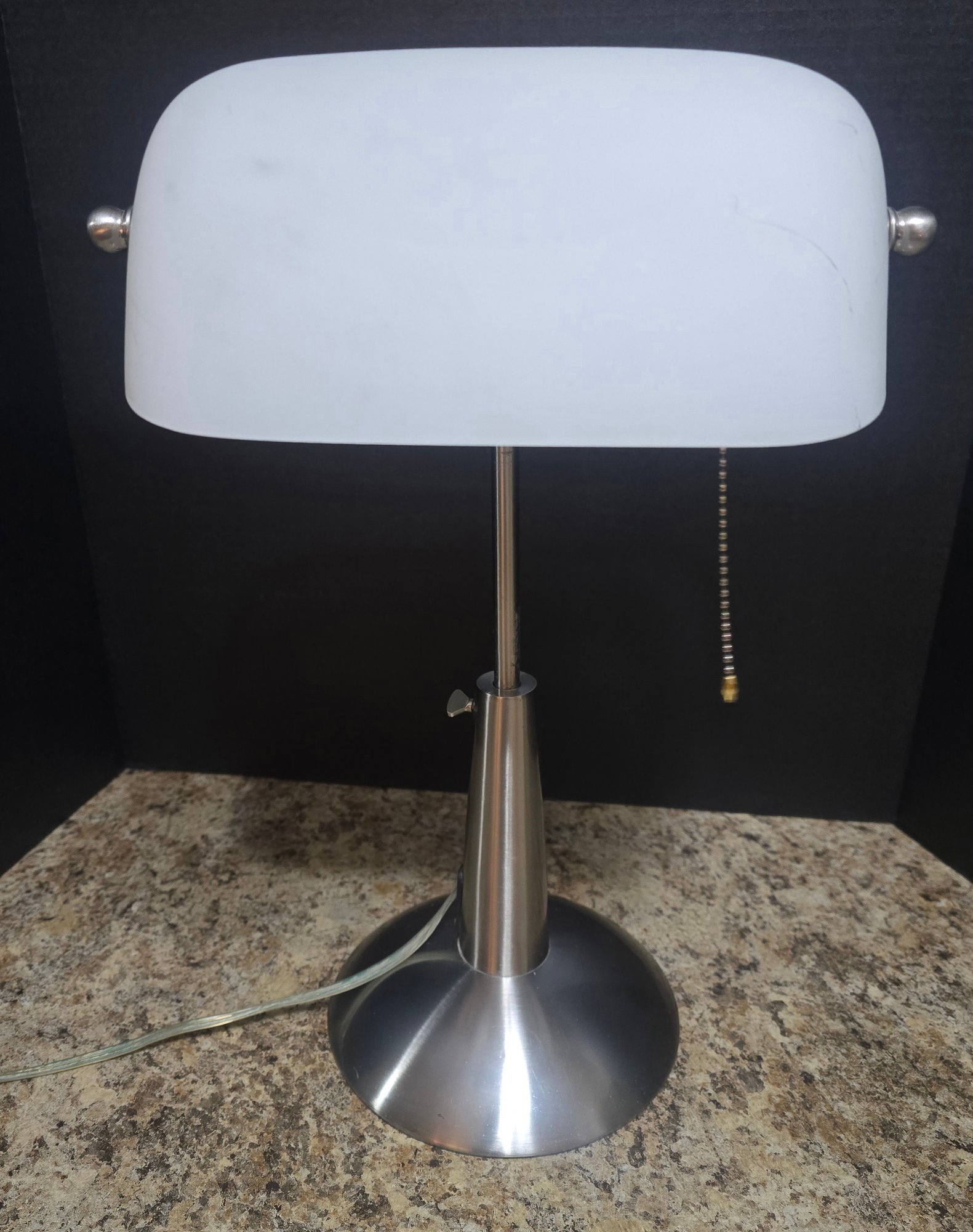 Bankers desk lamp with a white glass shade and a polished steel finish. Adjustable top piece. Measures 10.5 x 17h at highest and 14h at the lowest. Please see all pics for details.