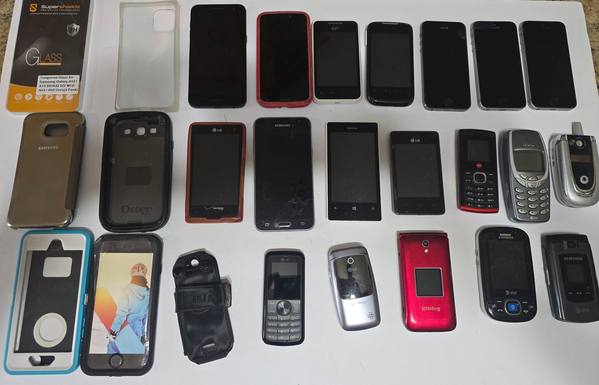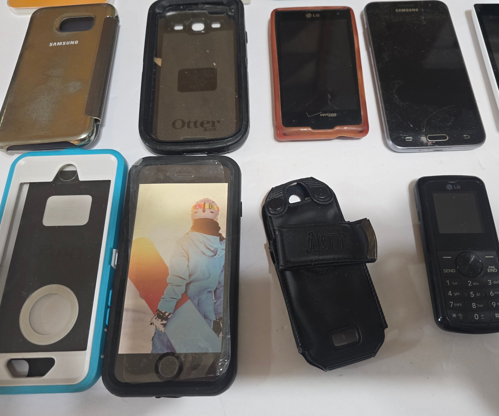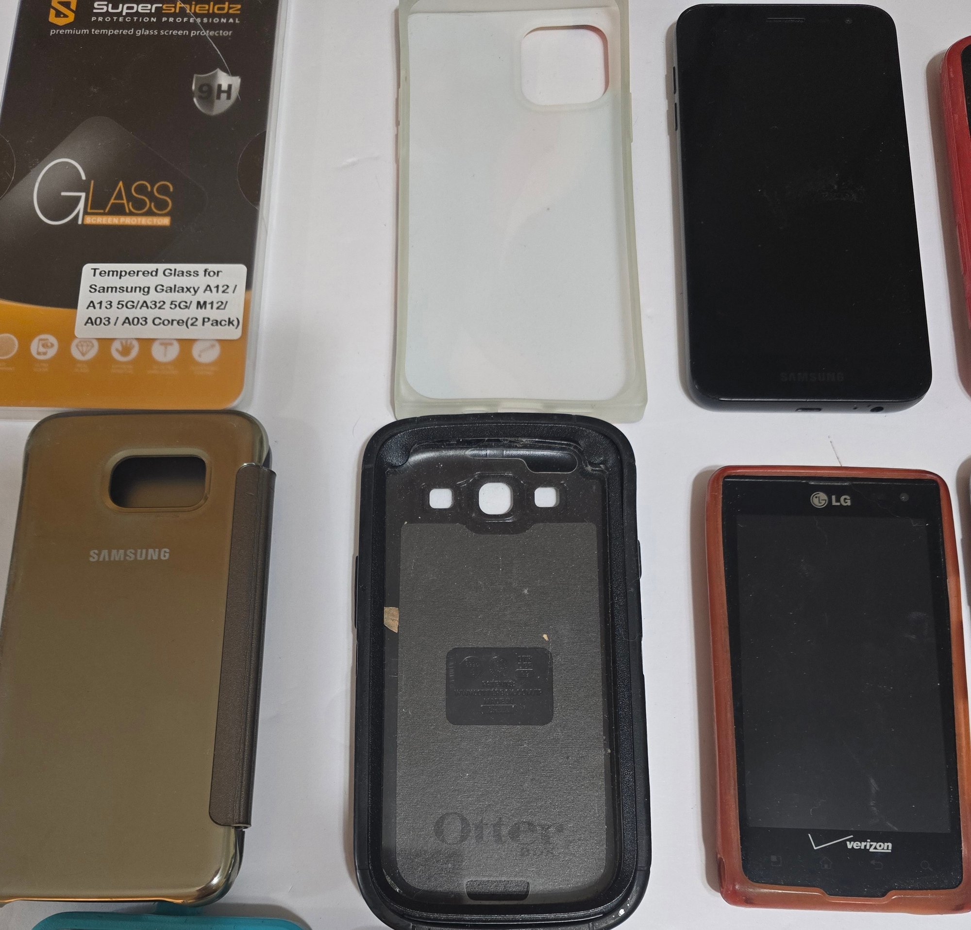 Group of different cell phones and cases. None have been tested. Listed as "PARTS ONLY". Please see all pics for details