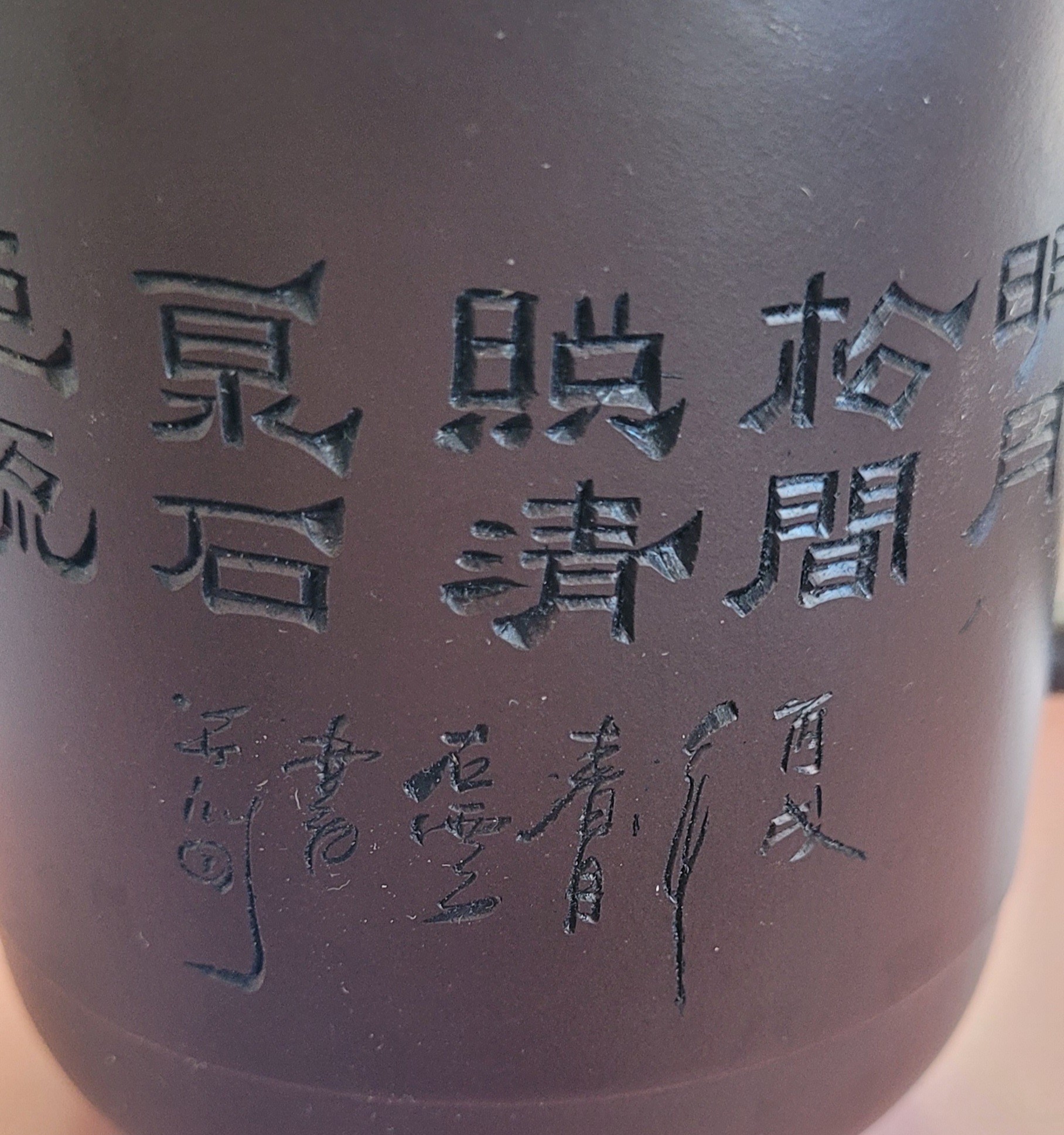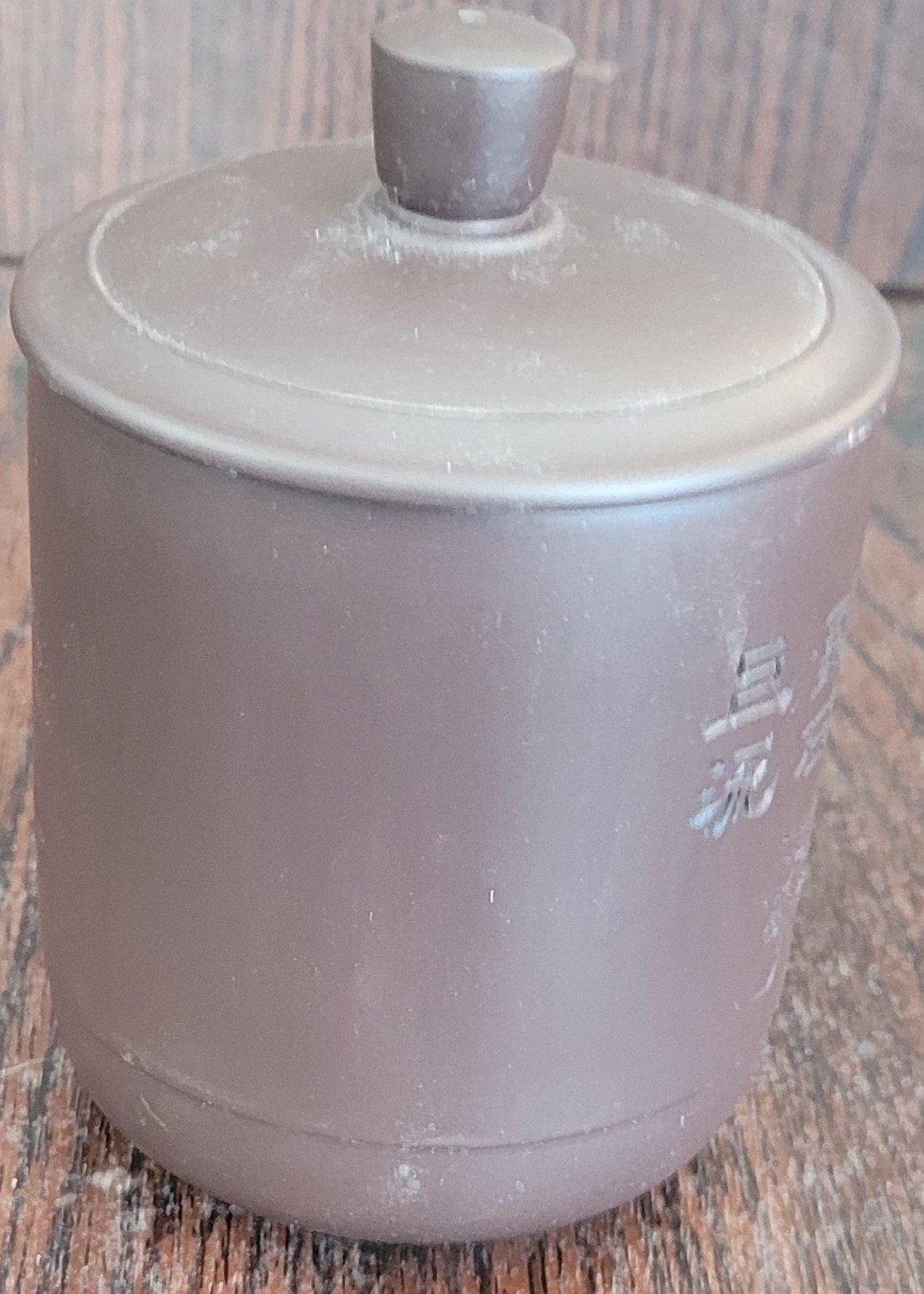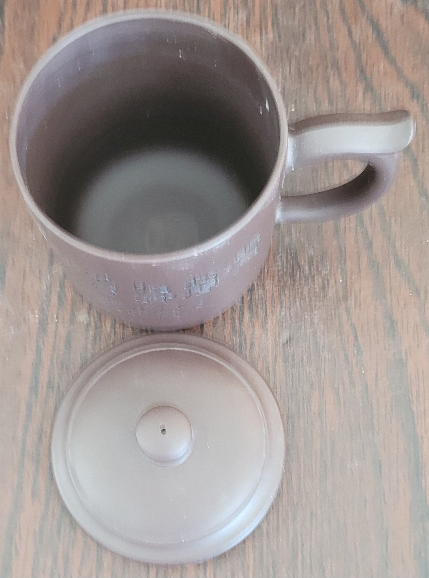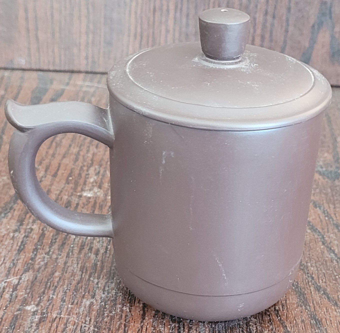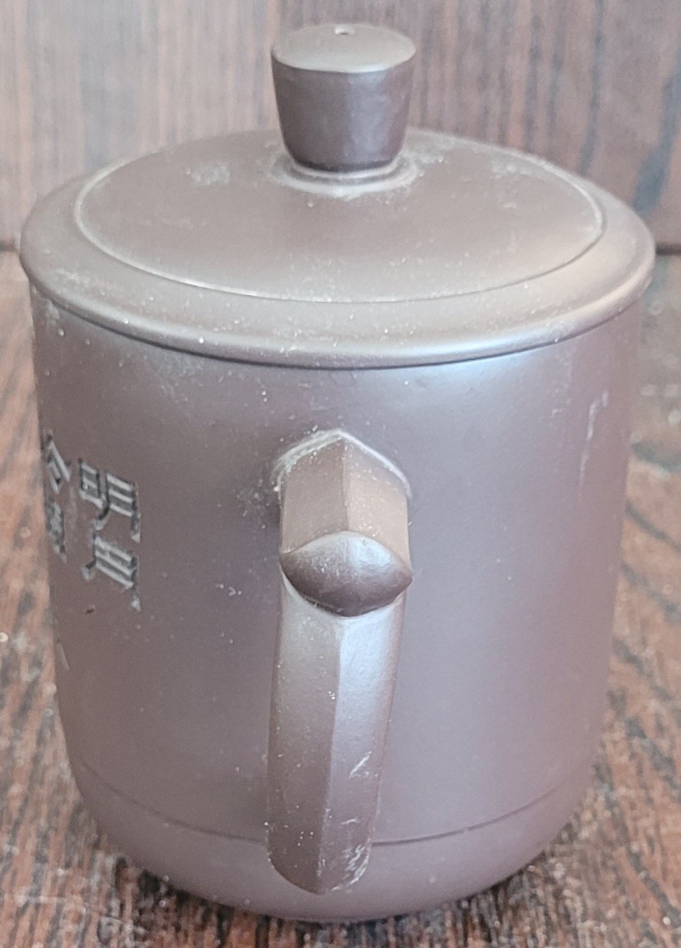 From my research this is a Chinese mug made of a purple clay. It measures 4.75" tall. See pictures for details.