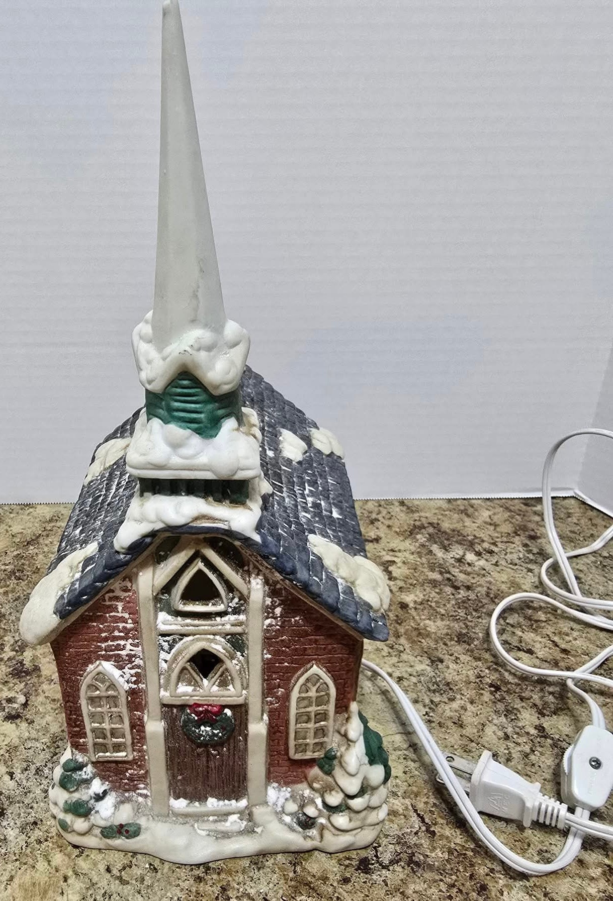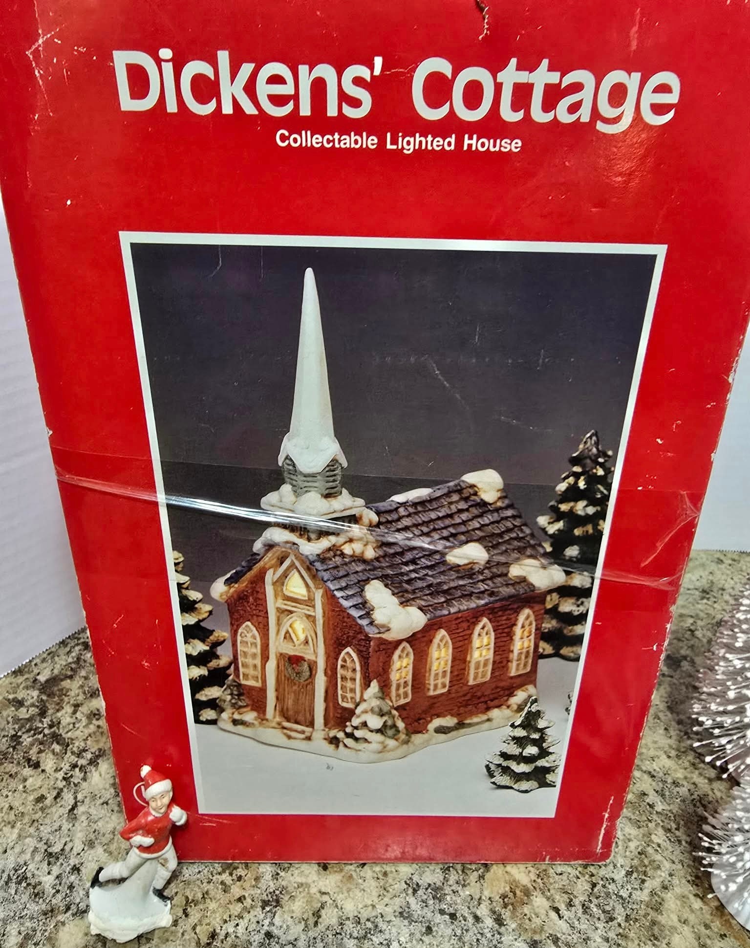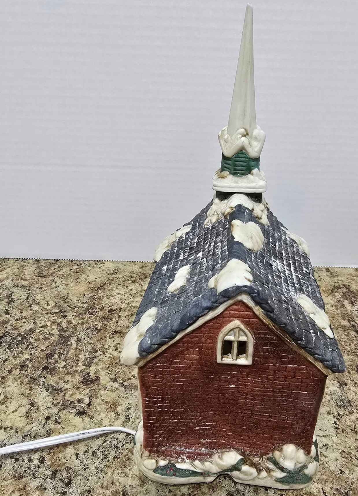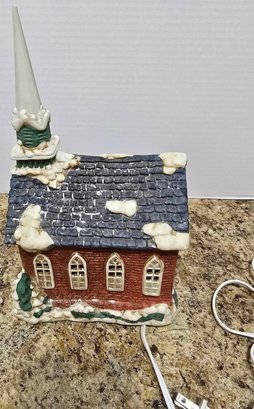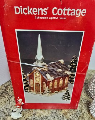 Christmas Items. House lights up. Needs cleaned. Looks like tip of steeple may be chipped.