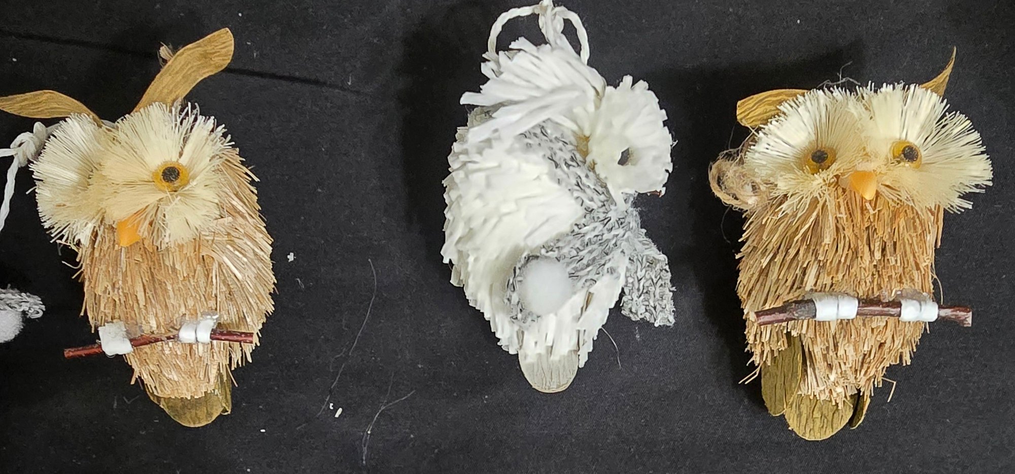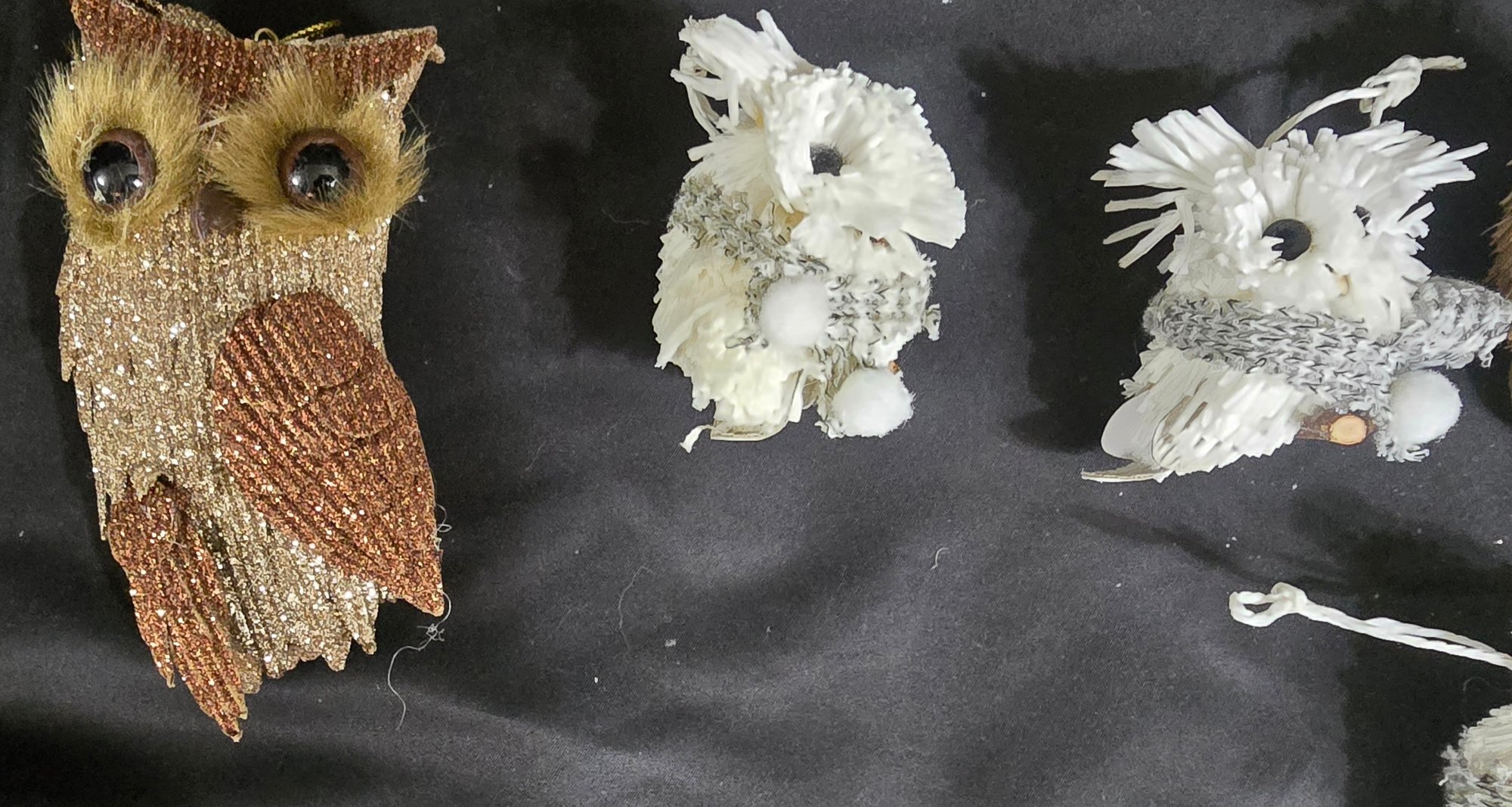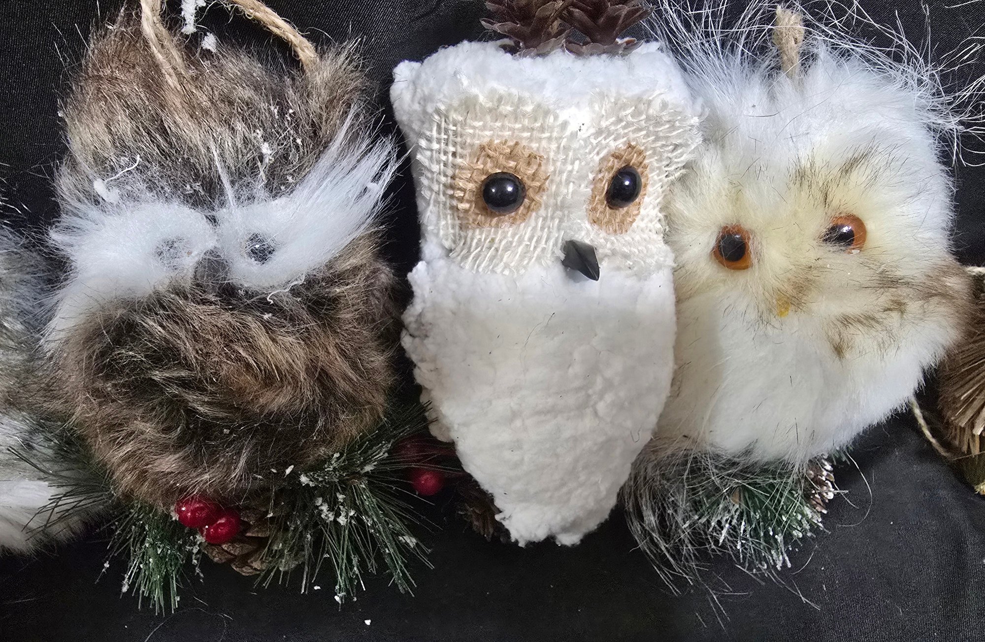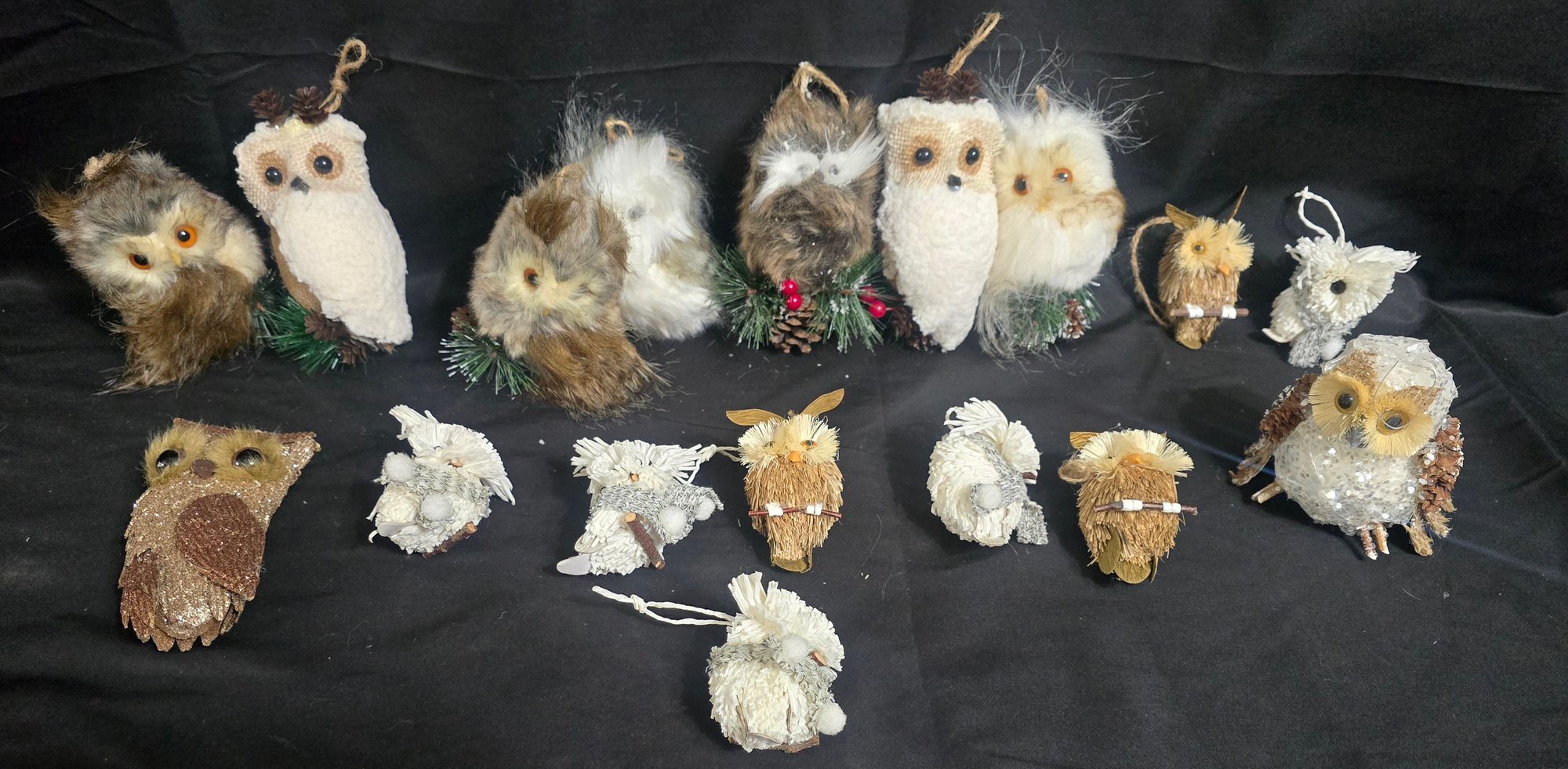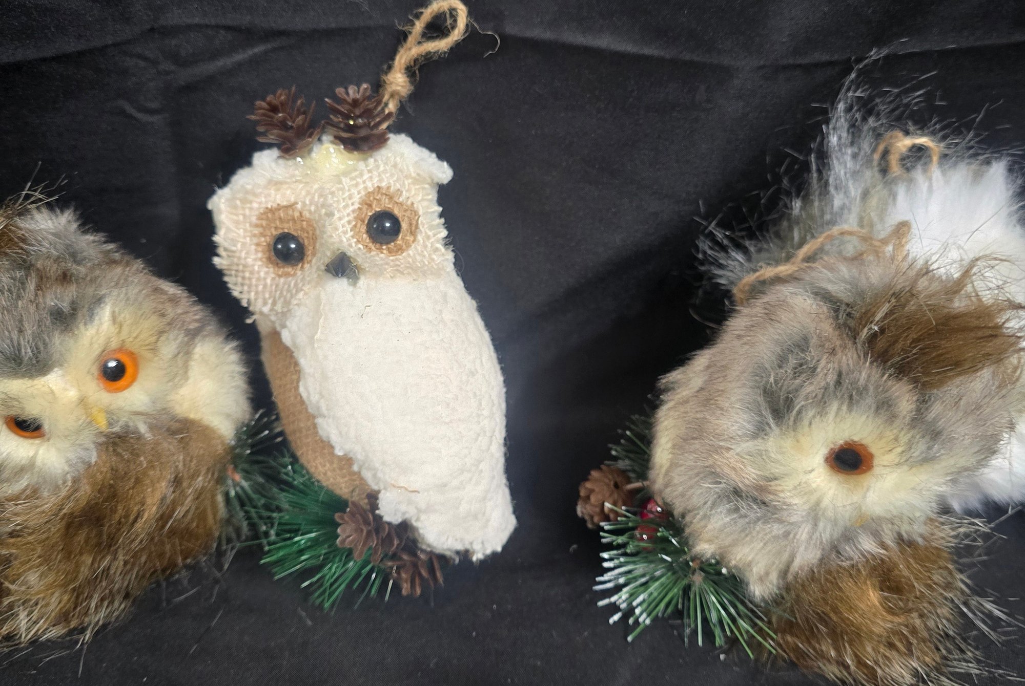 Group of Christmas Owls. Lot #1. These woodland-style owl Christmas ornaments are handcrafted with natural textures like feathers, twine, pinecones, and soft faux fur. They are commonly found in rustic or themed holiday decor sets. Measures 3" to 7". Please see all pics for details.