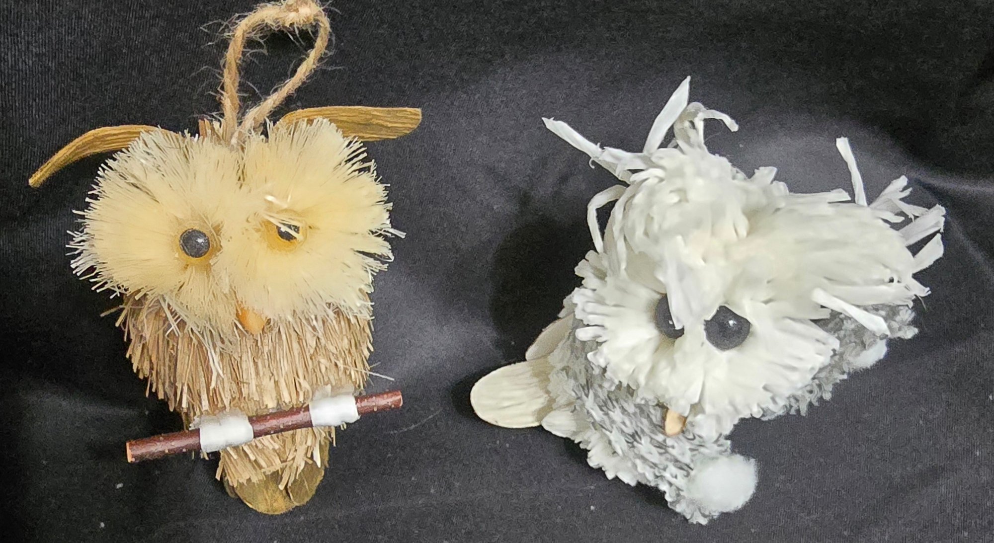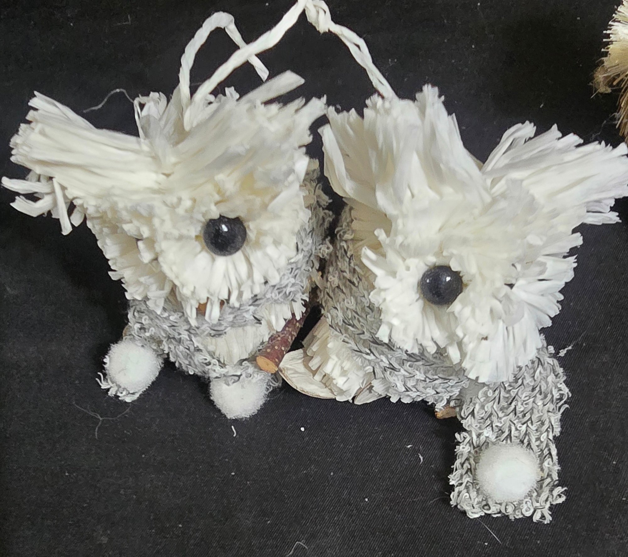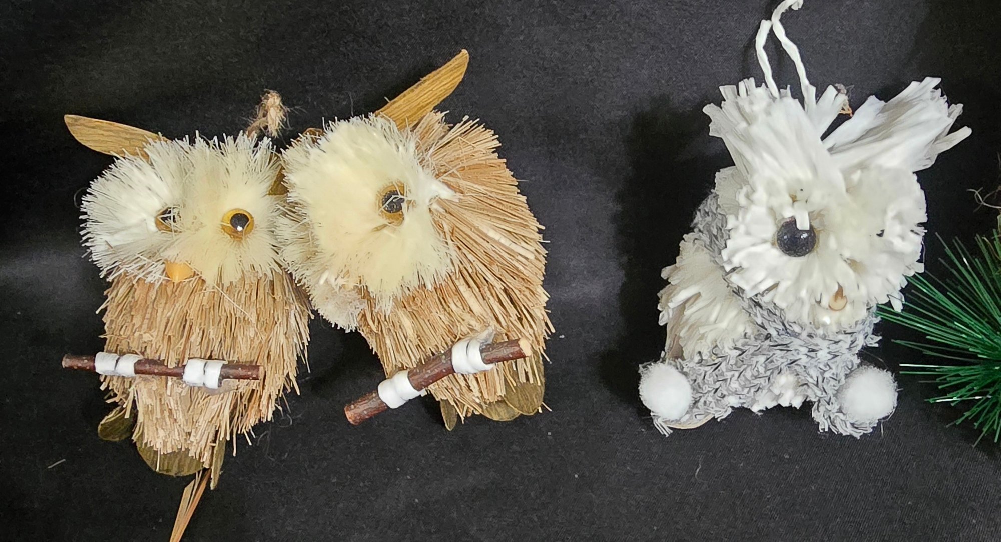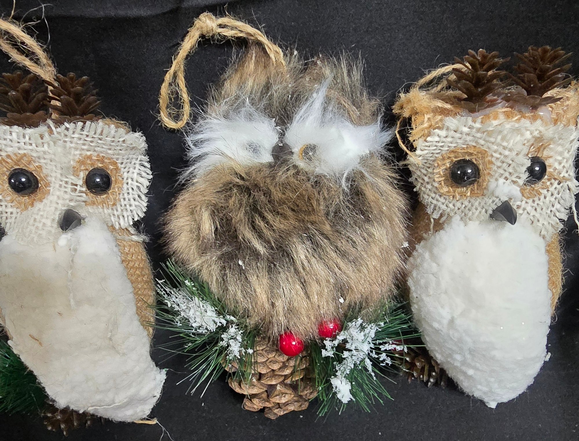 Group of Christmas Owls. Lot #3. These woodland-style owl Christmas ornaments are handcrafted with natural textures like feathers, twine, pinecones, and soft faux fur. They are commonly found in rustic or themed holiday decor sets. Measures 3" to 7". Please see all pics for details.