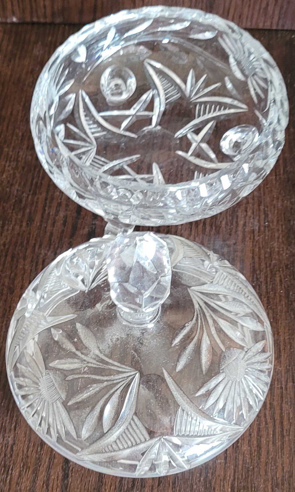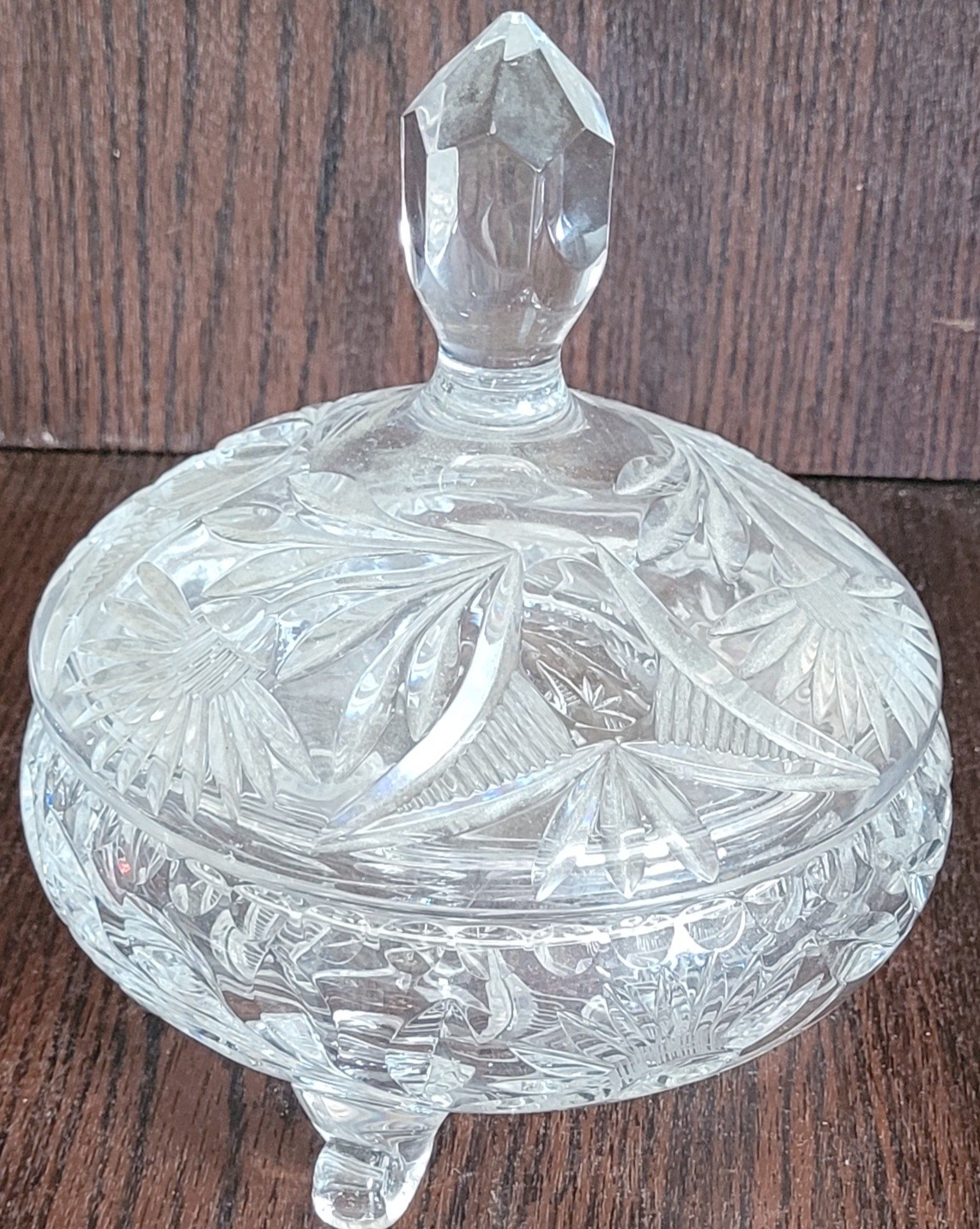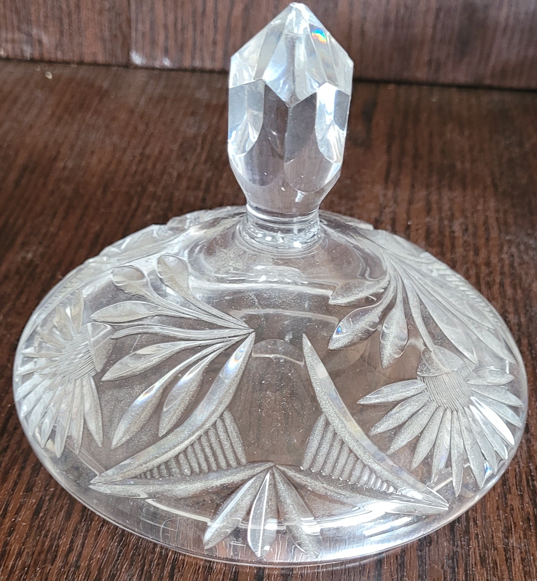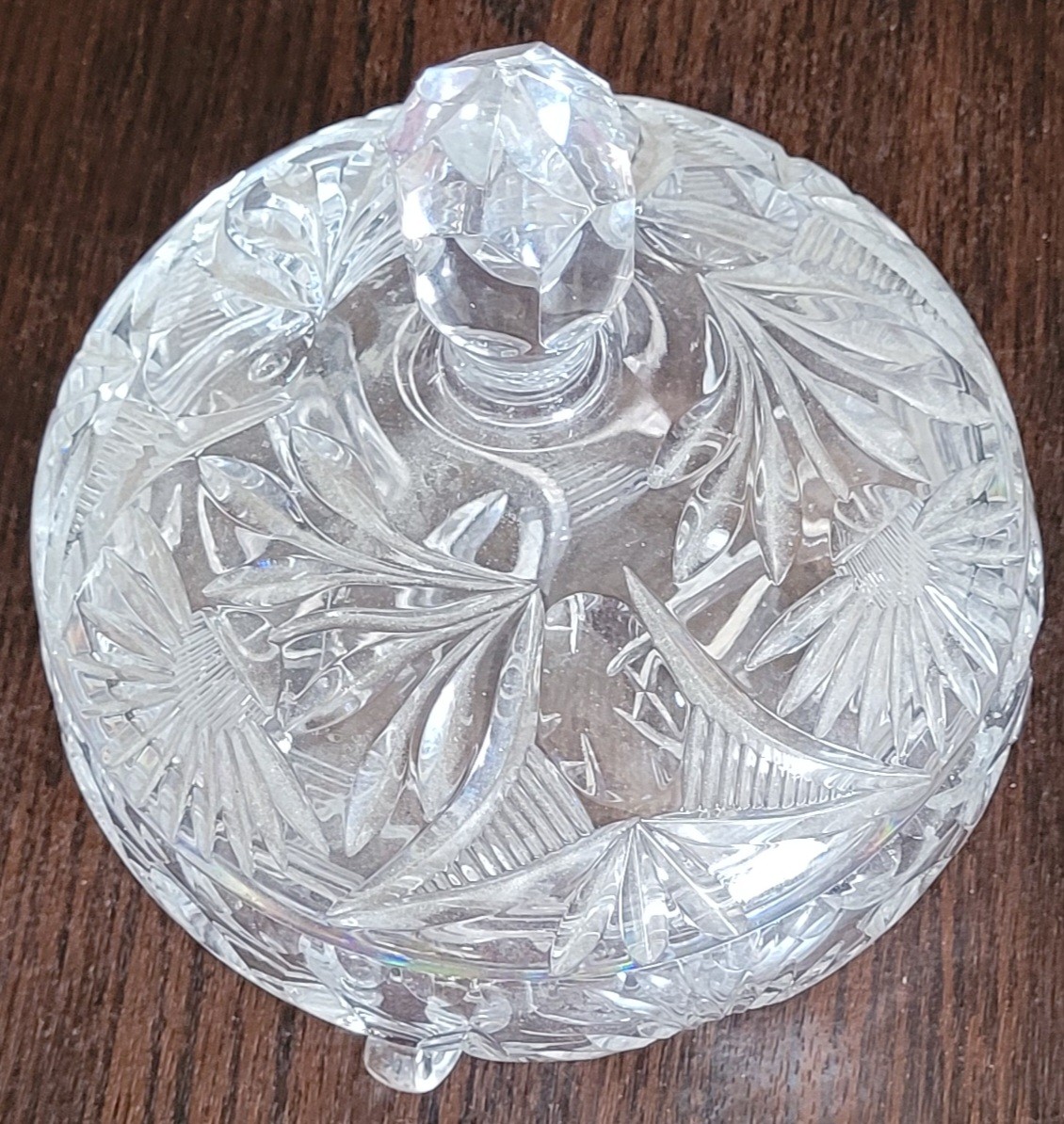 This measures 7" tall by 6" in diameter. It does have a chip on the top of the lid. See pictures for details.