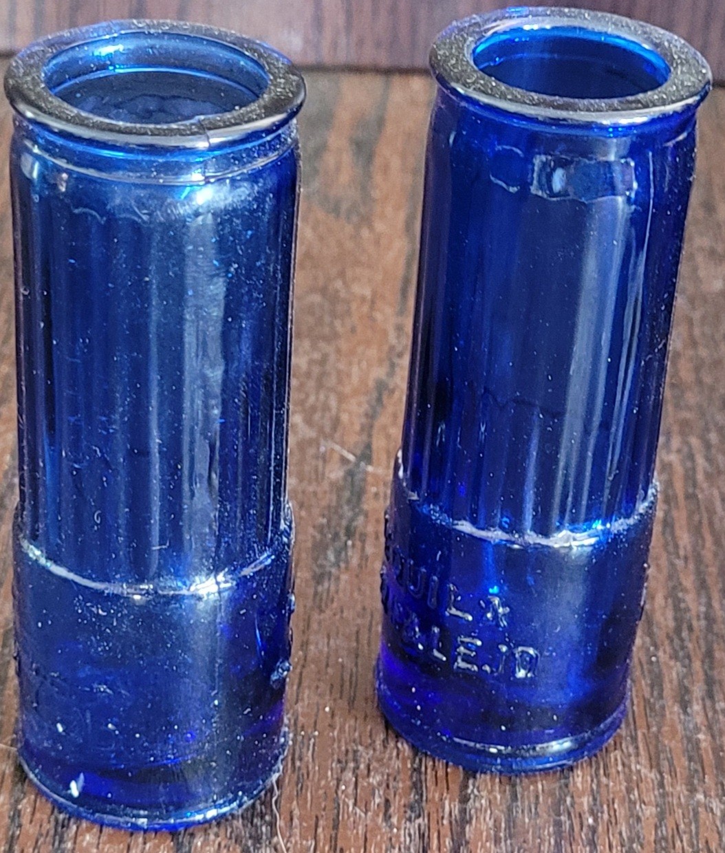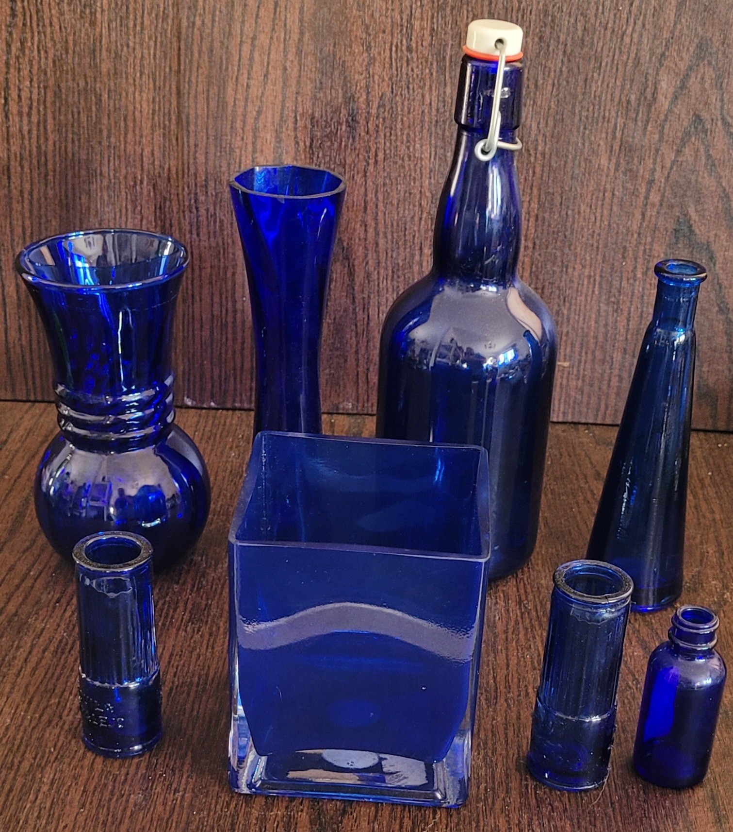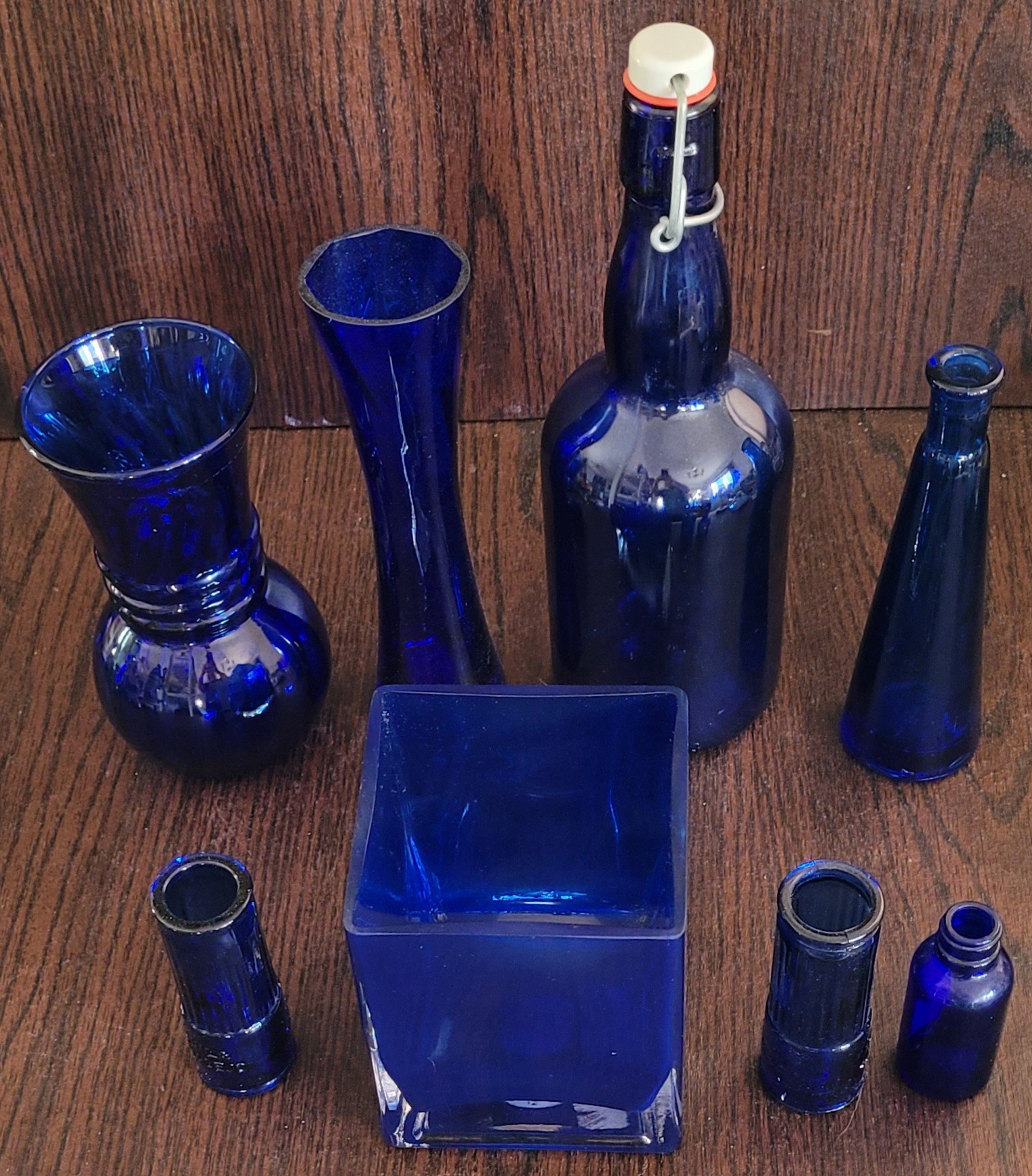 This is an assortment of different cobalt blue glass vases and bottles. Different sizes and shapes. See pictures for details.