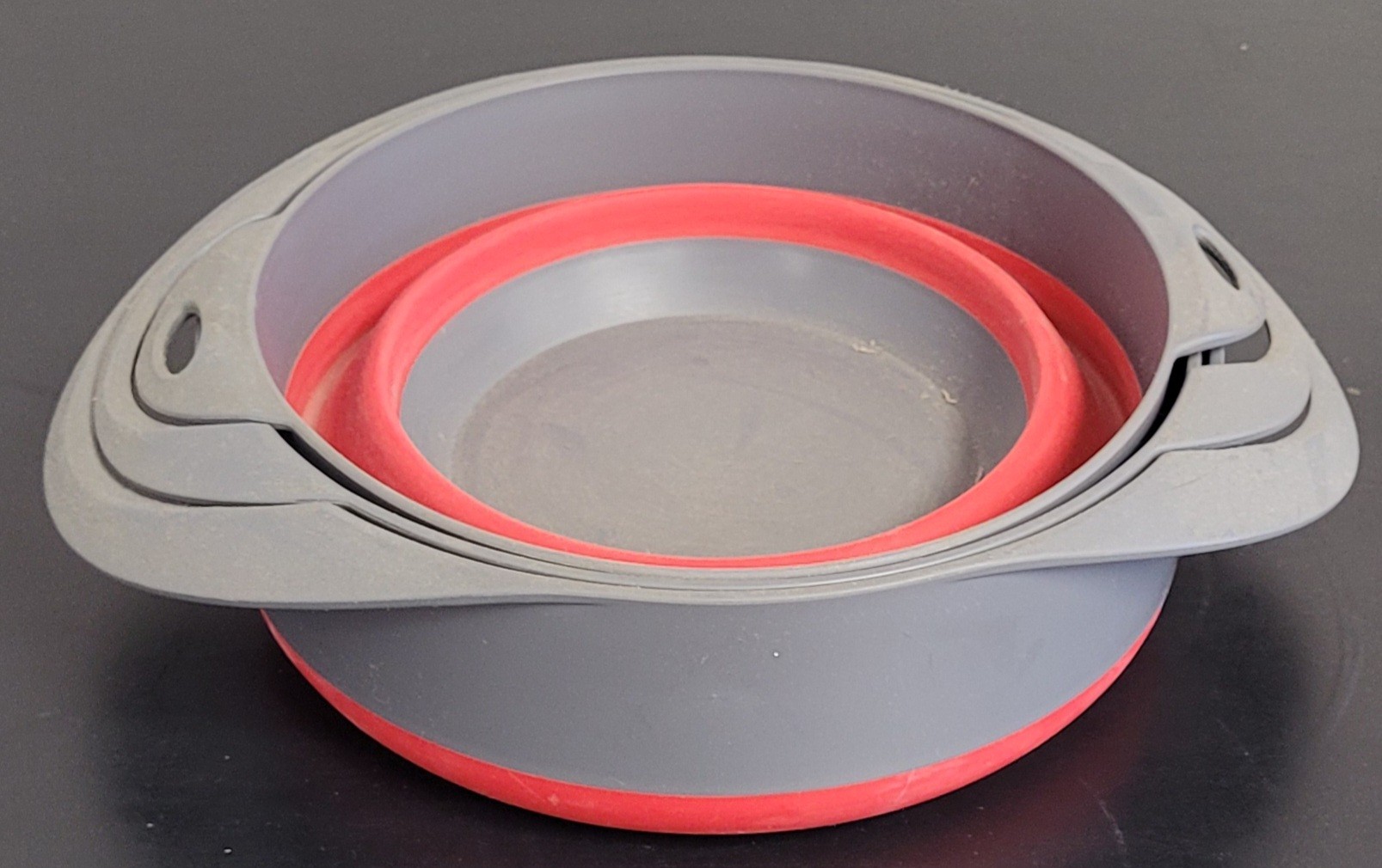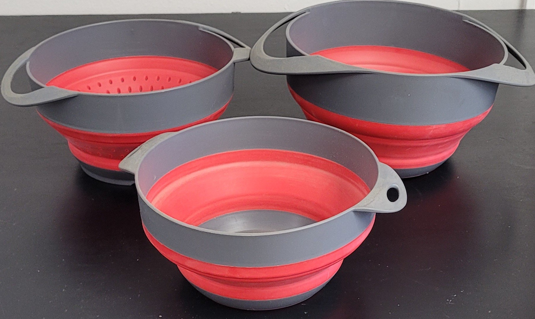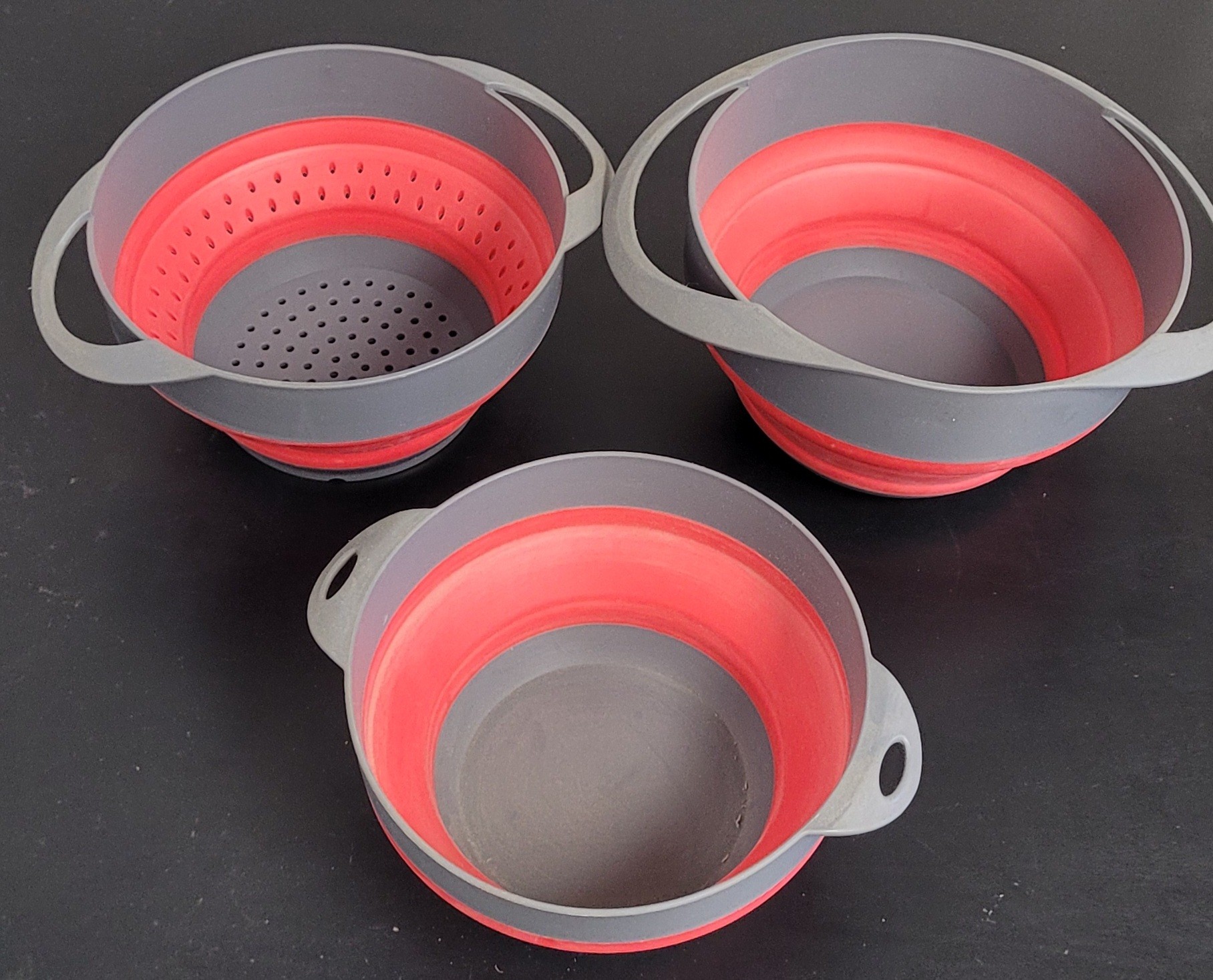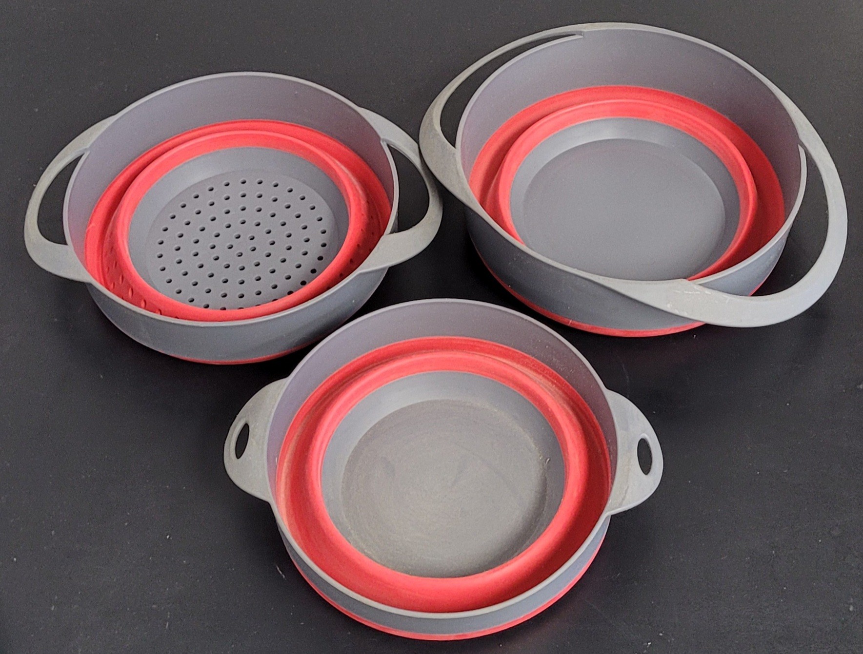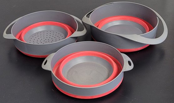 This comes with one colander and 2 bowls. These measure 7.5" in diameter, 7.75" in diameter and 8" in diameter. These do need to be cleaned. See pictures for details.