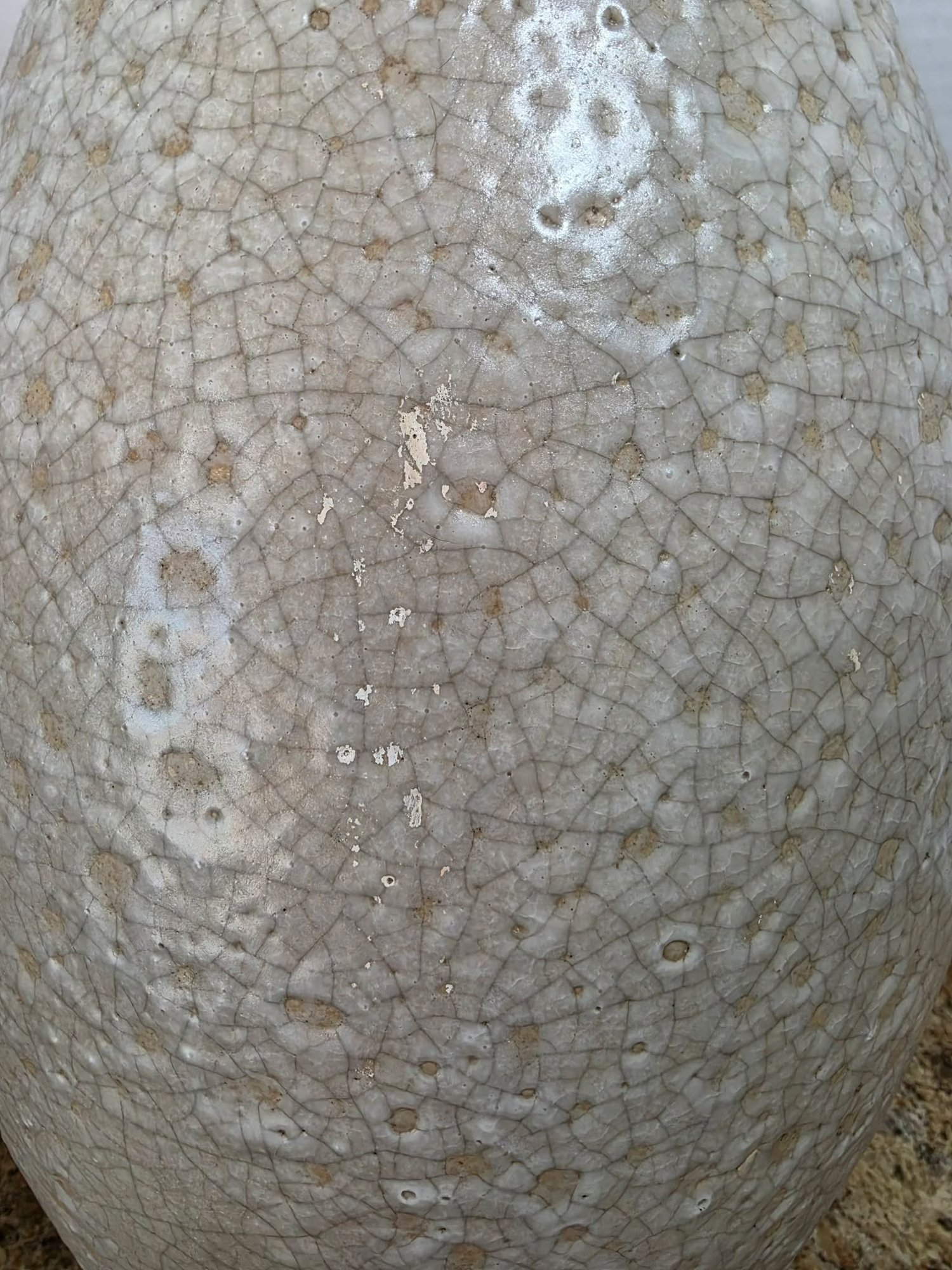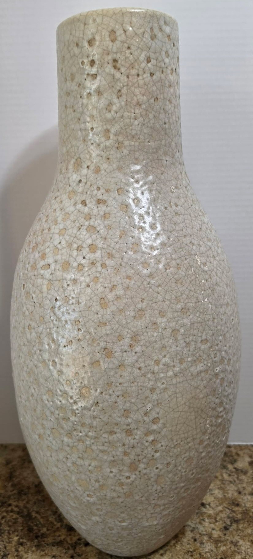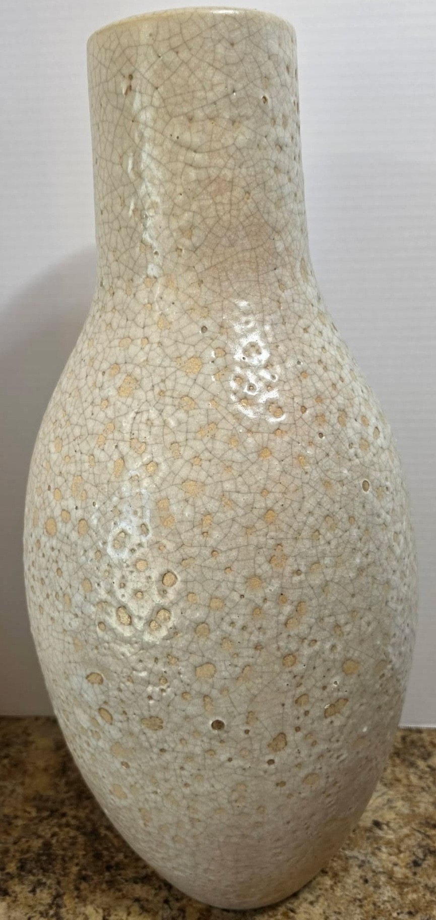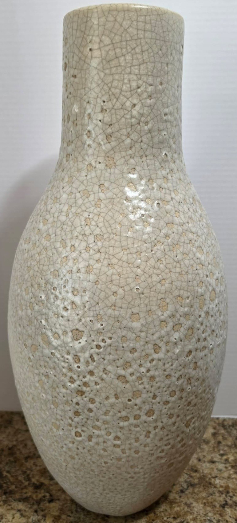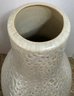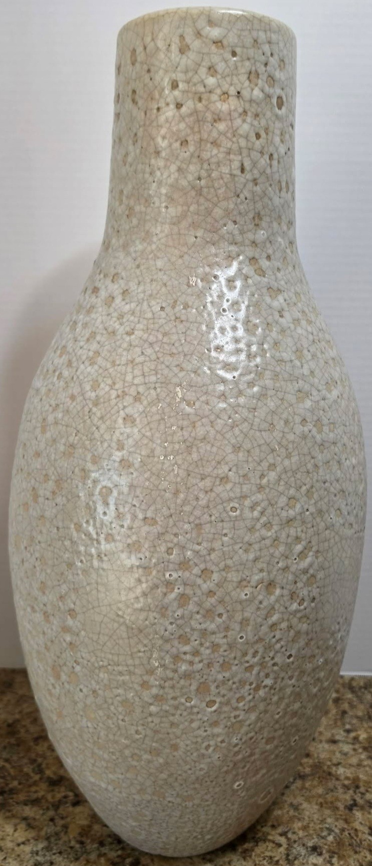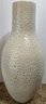 Collectible ceramic vase featuring a distinct crackle glaze finish and a textured surface. A few chips in finish. Measures 10.5 x 23.