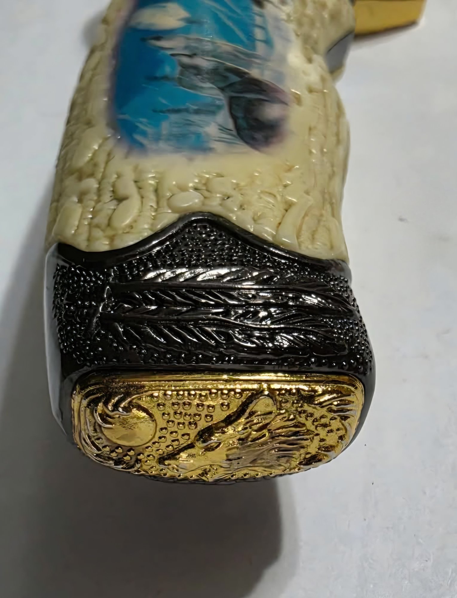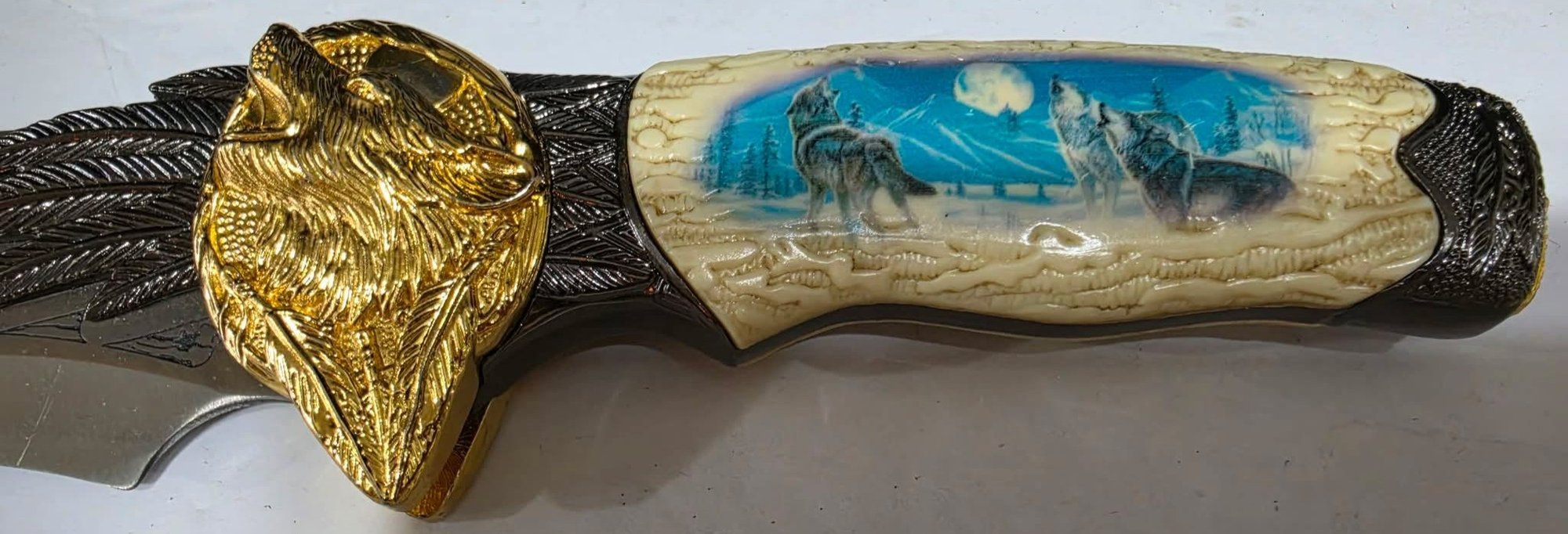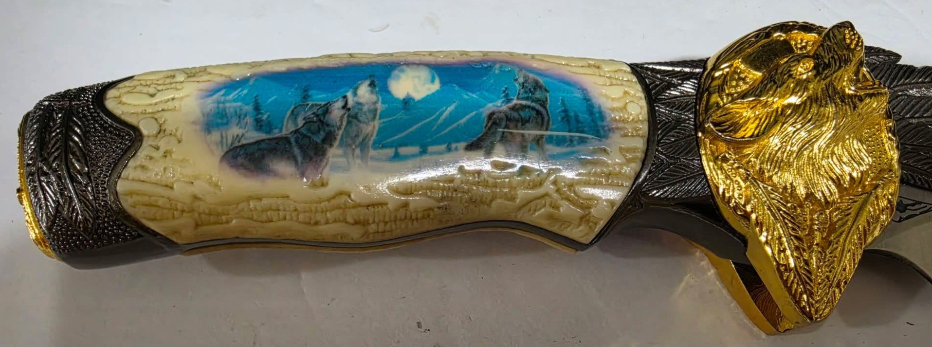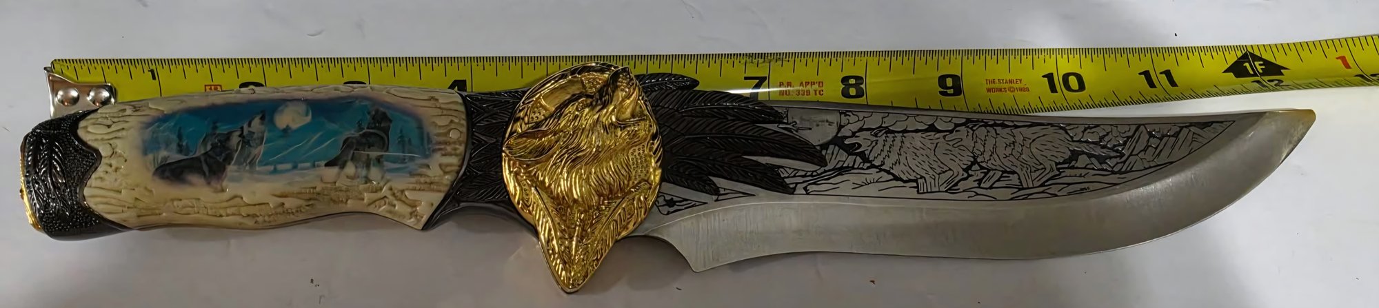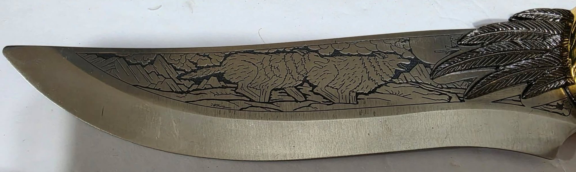 Collectible Decorative Knife with etching in the blade. No sheath. Does not fold.