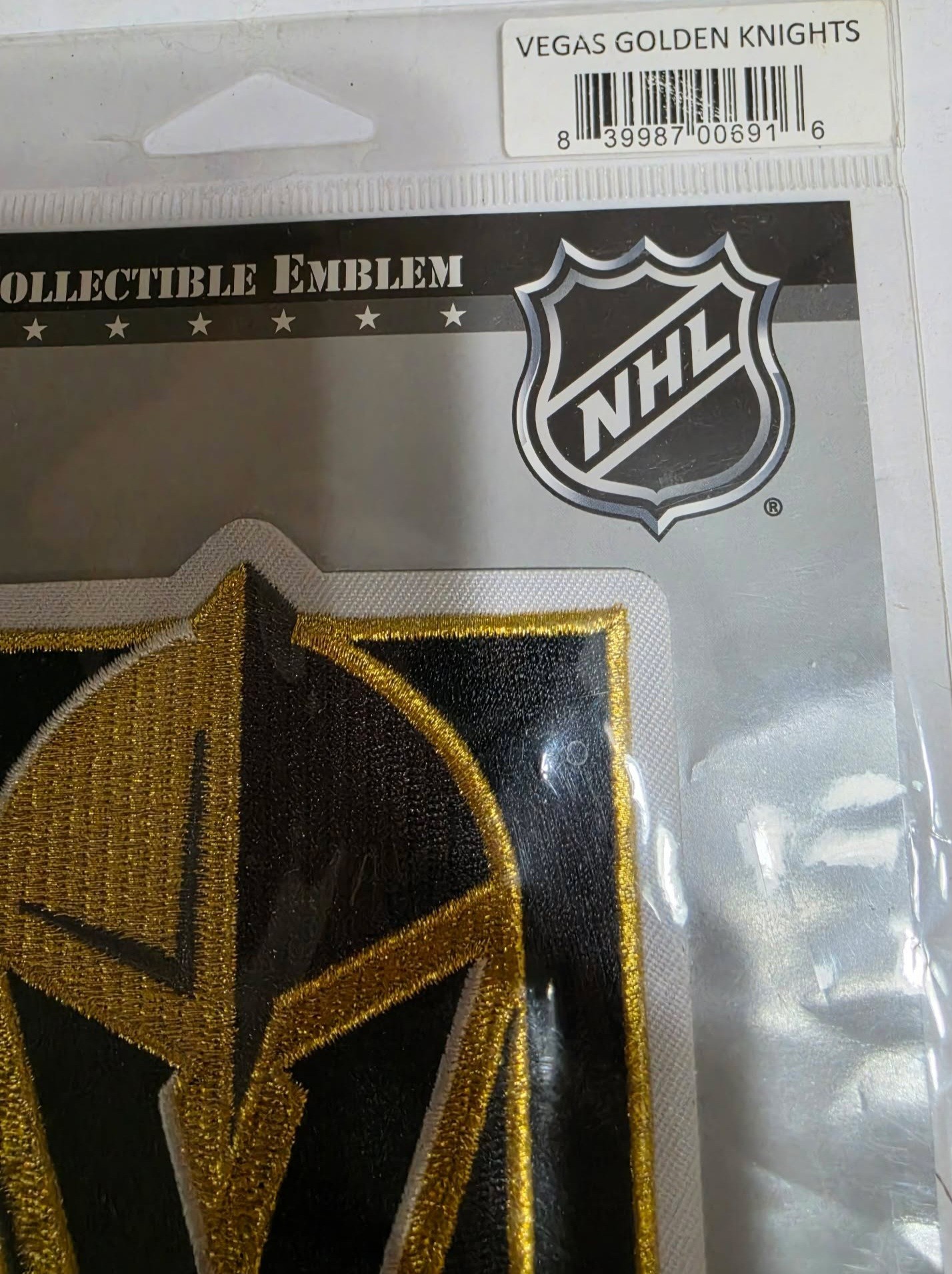 Collectible Vegas Golden Knights primary team logo embroidered emblem patch. Patch measures 3.75 x 5.