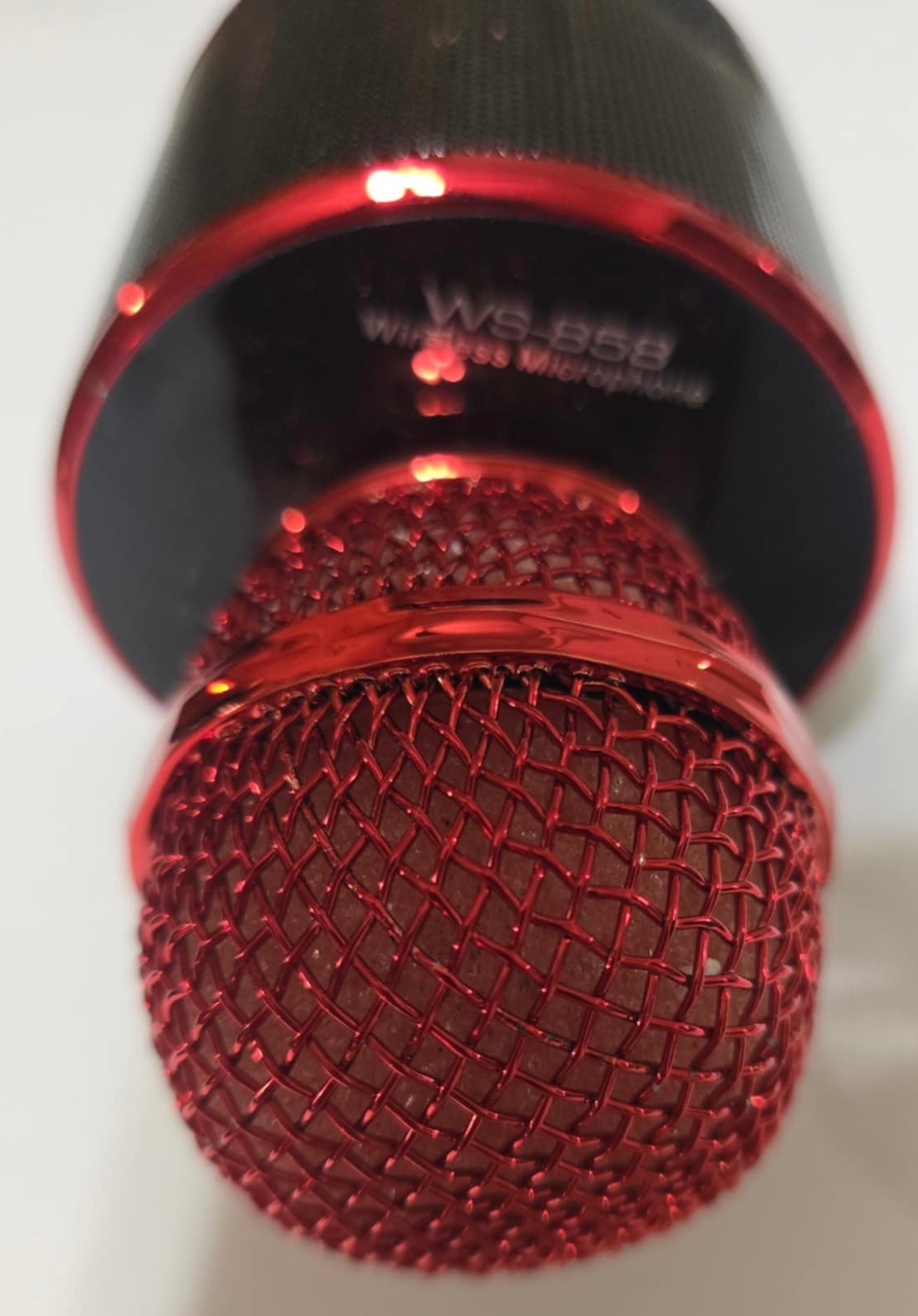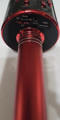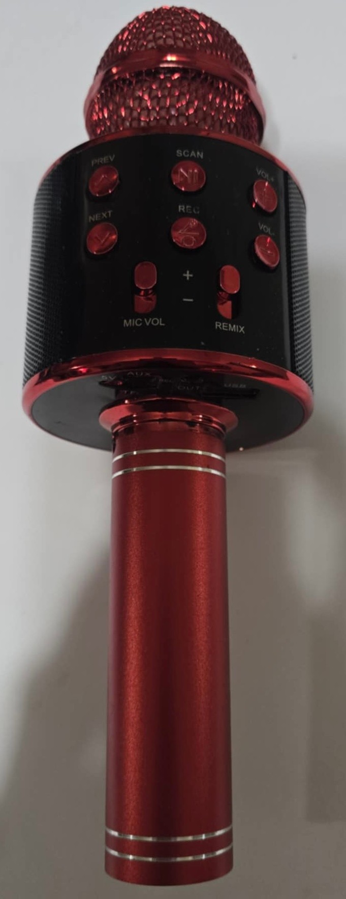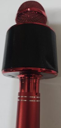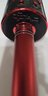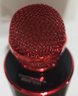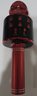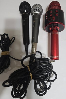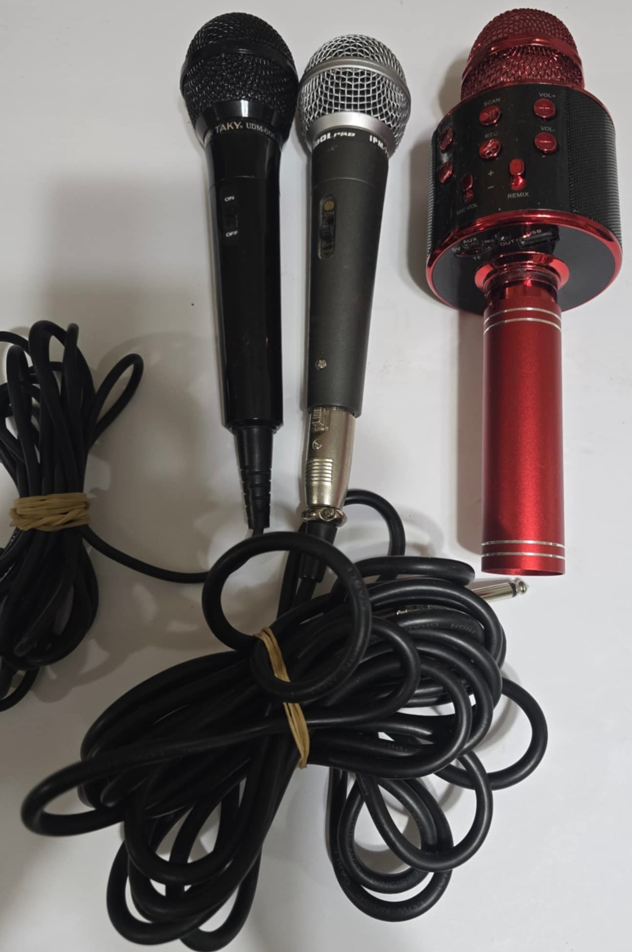 Collection of microphones, including two wired dynamic microphones and one red wireless Bluetooth karaoke microphone.