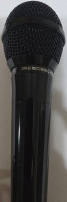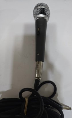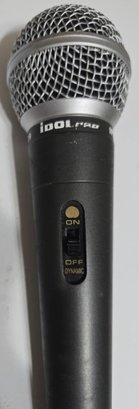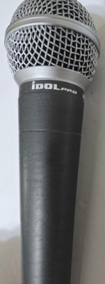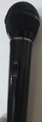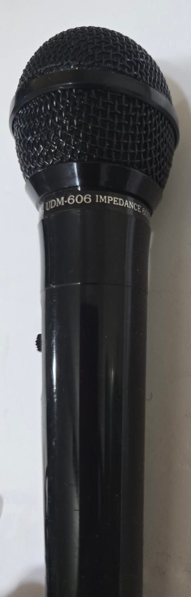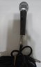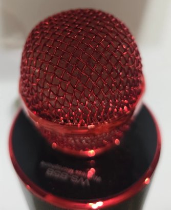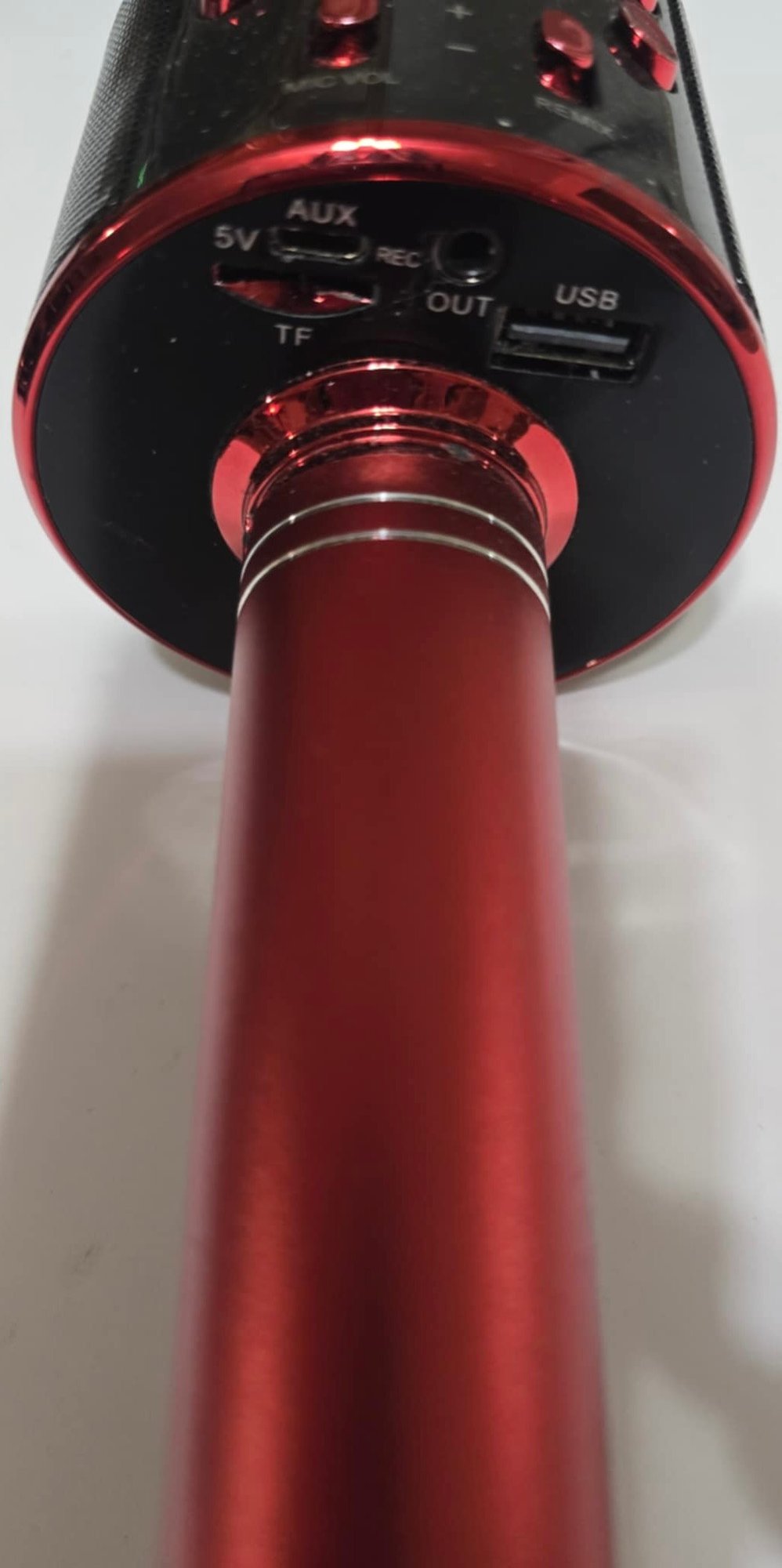 Collection of microphones, including two wired dynamic microphones and one red wireless Bluetooth karaoke microphone.