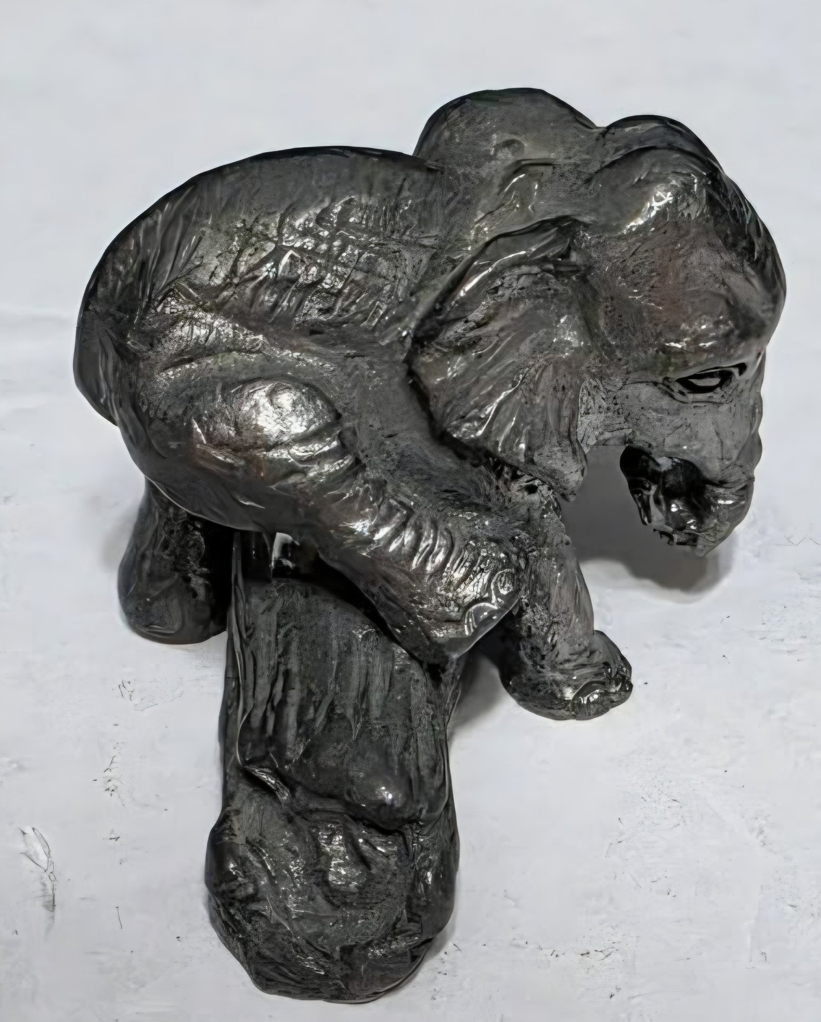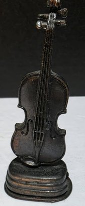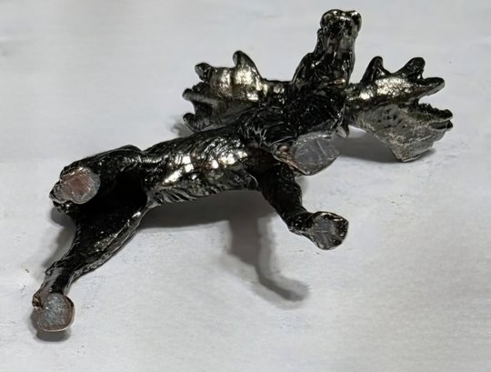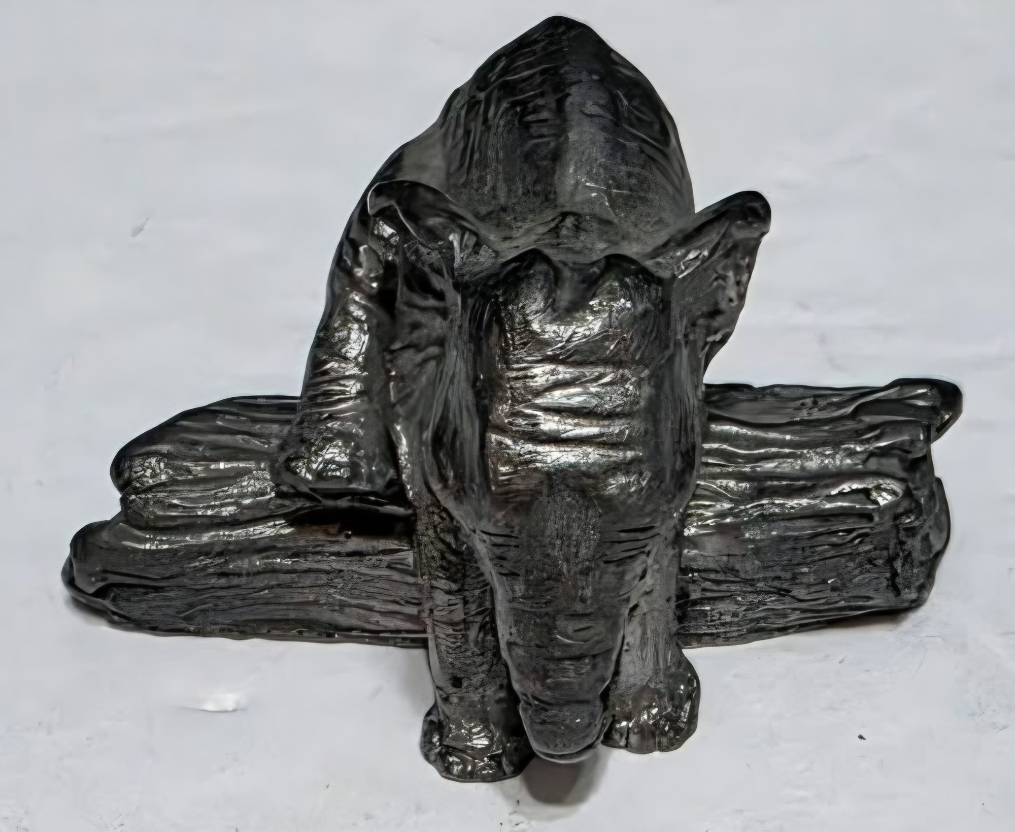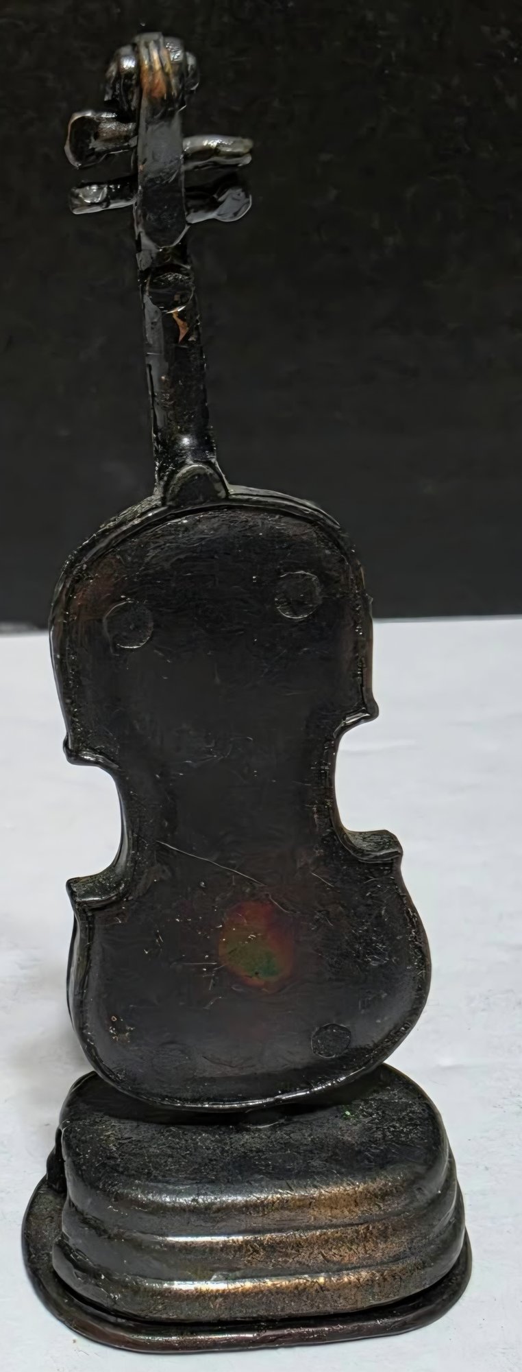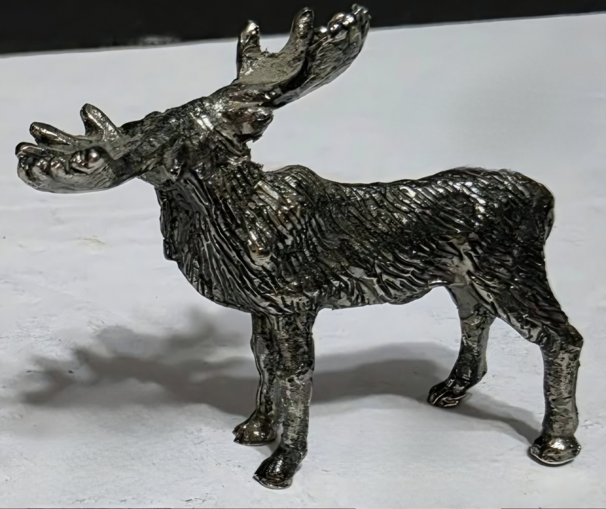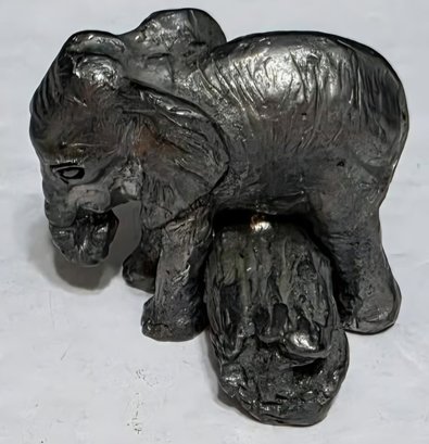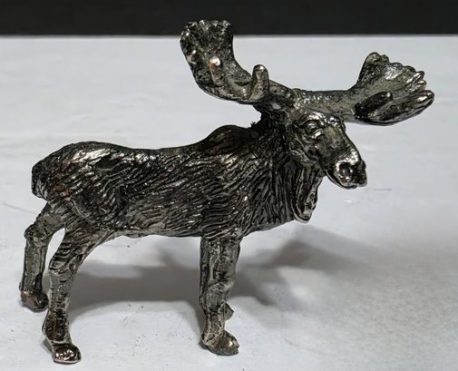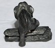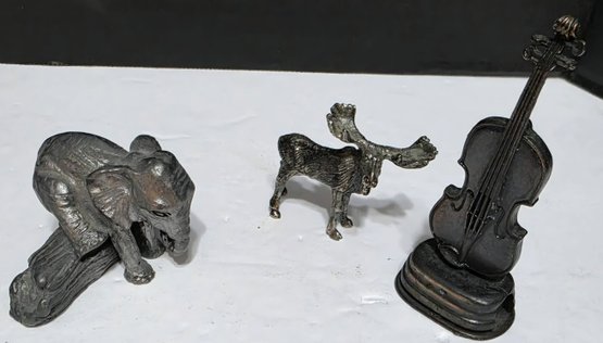 Collection of miniature pewter figurines, including a baby elephant climbing over a log, a moose, and a die cast cello. Measures 1.5h to 4h.