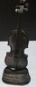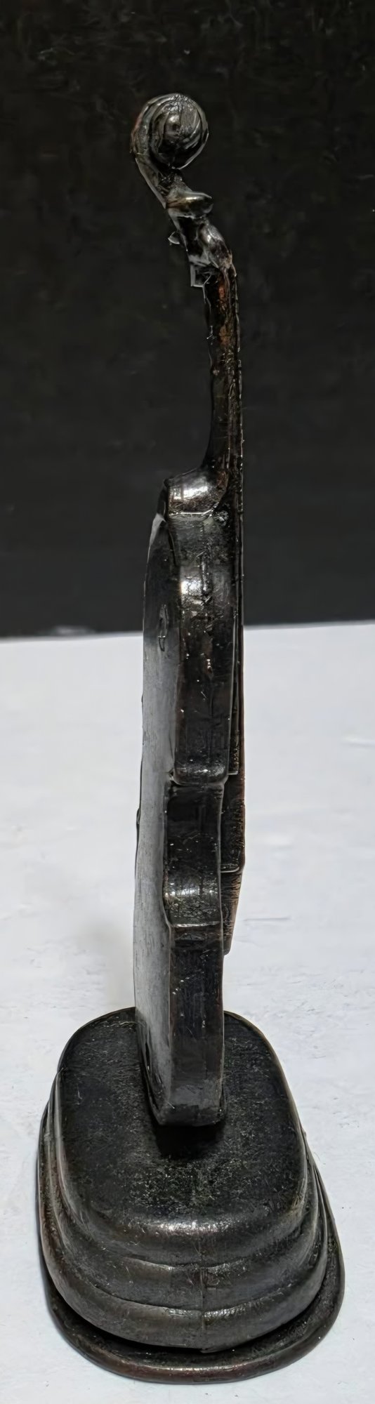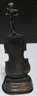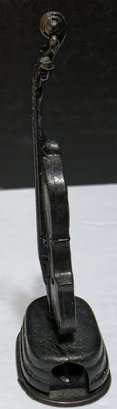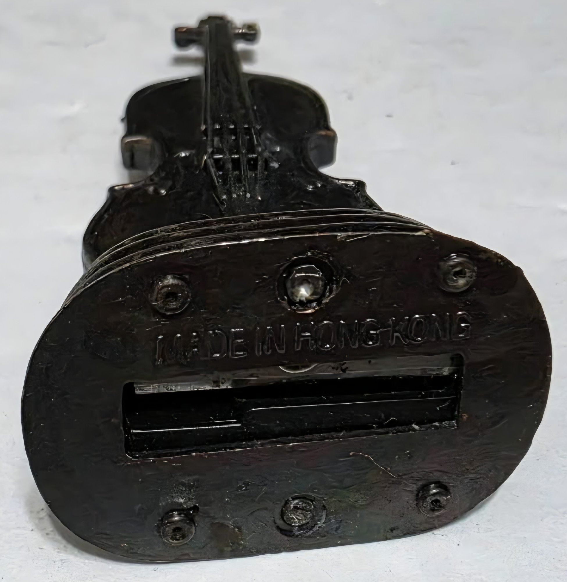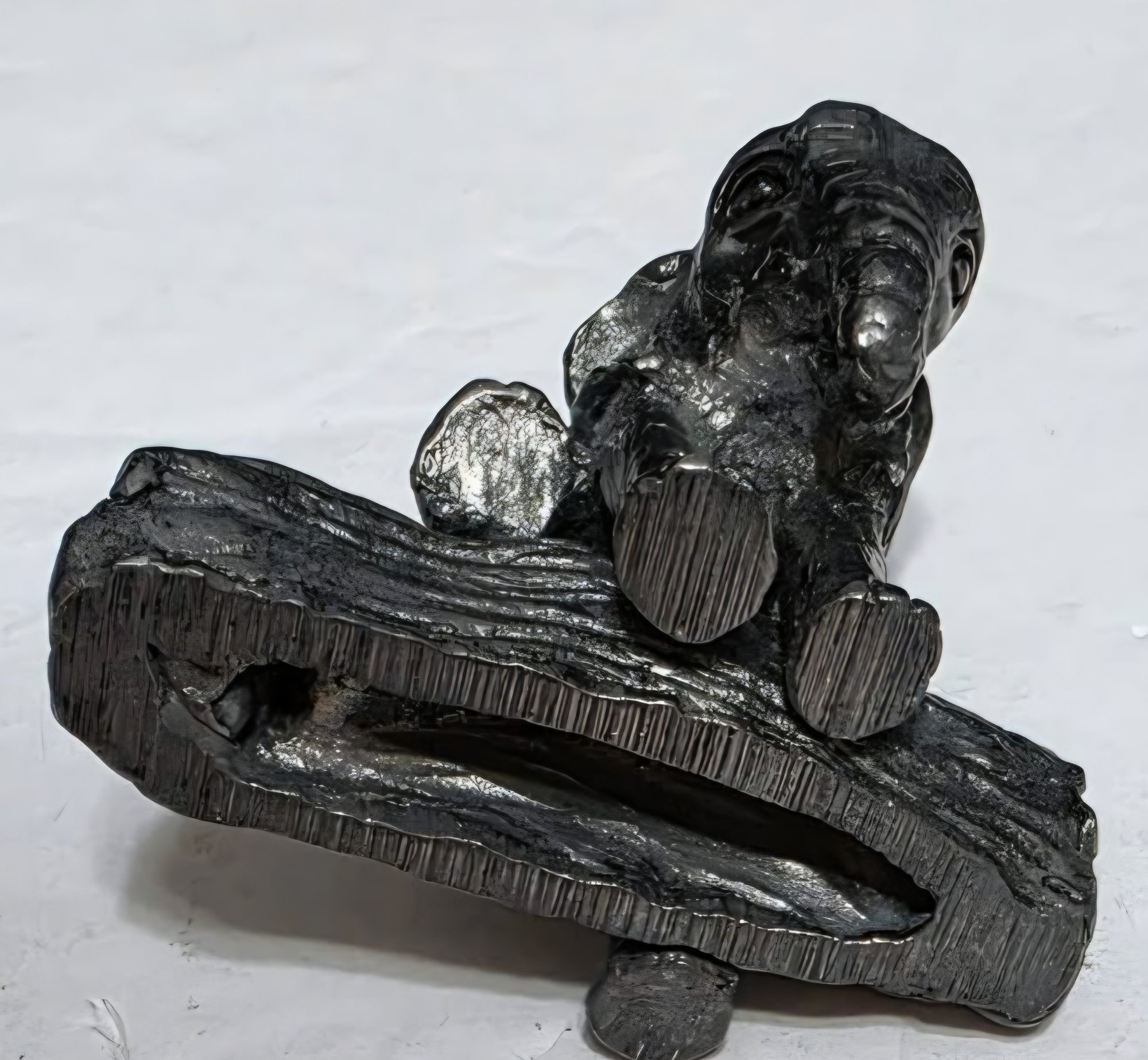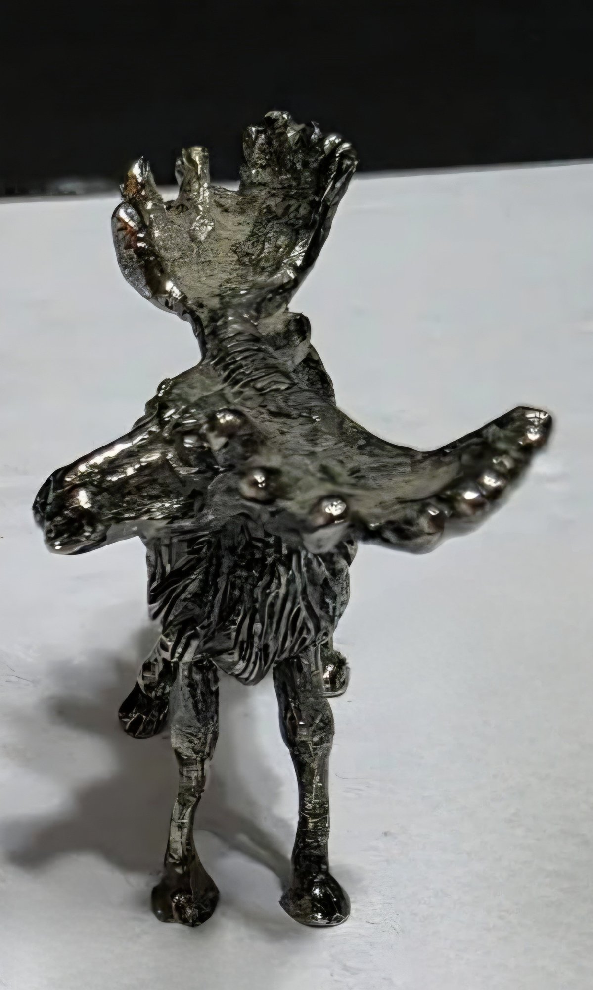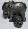 Collection of miniature pewter figurines, including a baby elephant climbing over a log, a moose, and a die cast cello. Measures 1.5h to 4h.