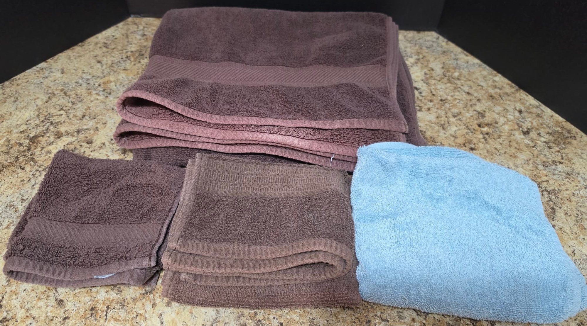 Collection of Mixed Towels including bath towels, hand towels and a wash cloth. Good used condition.