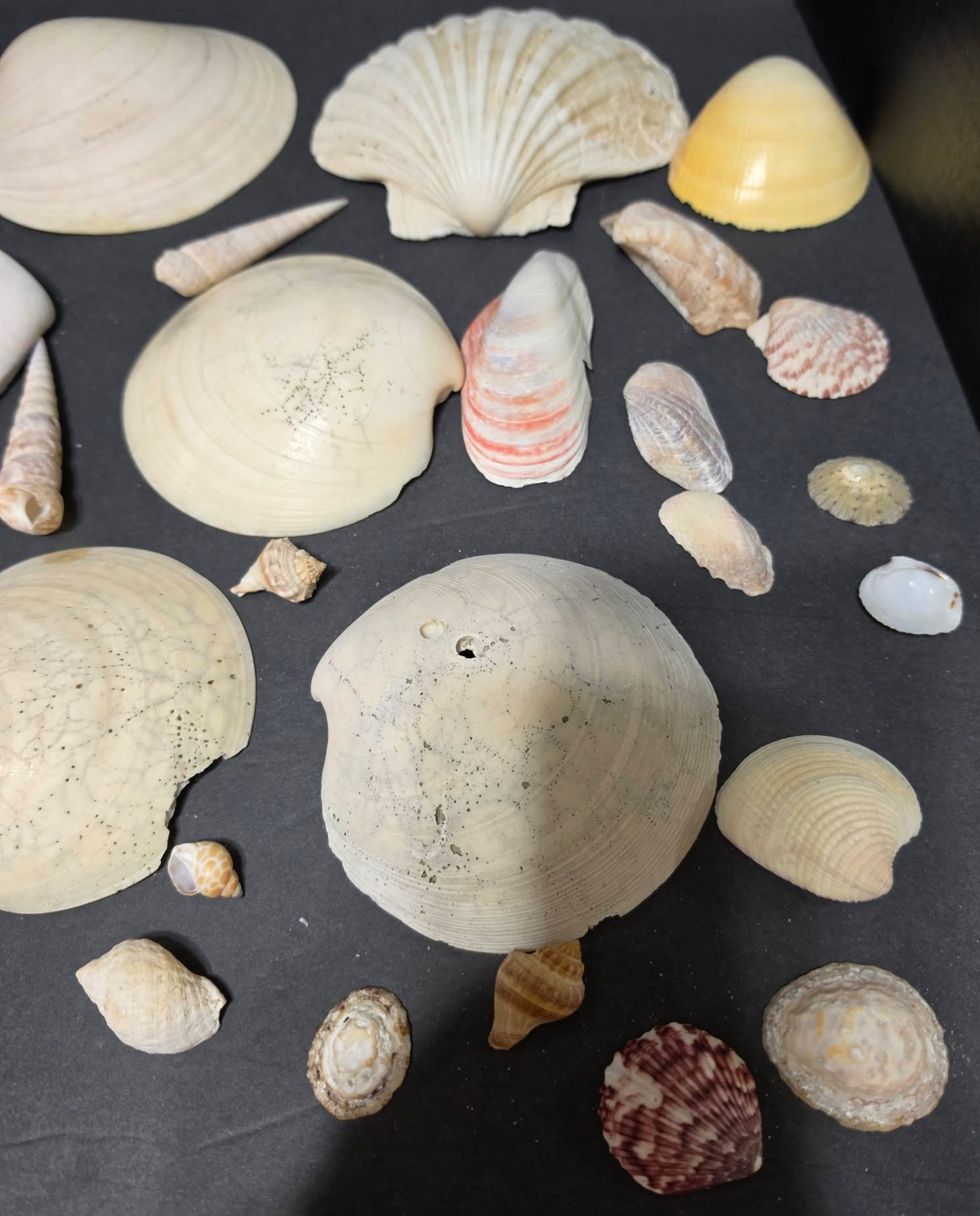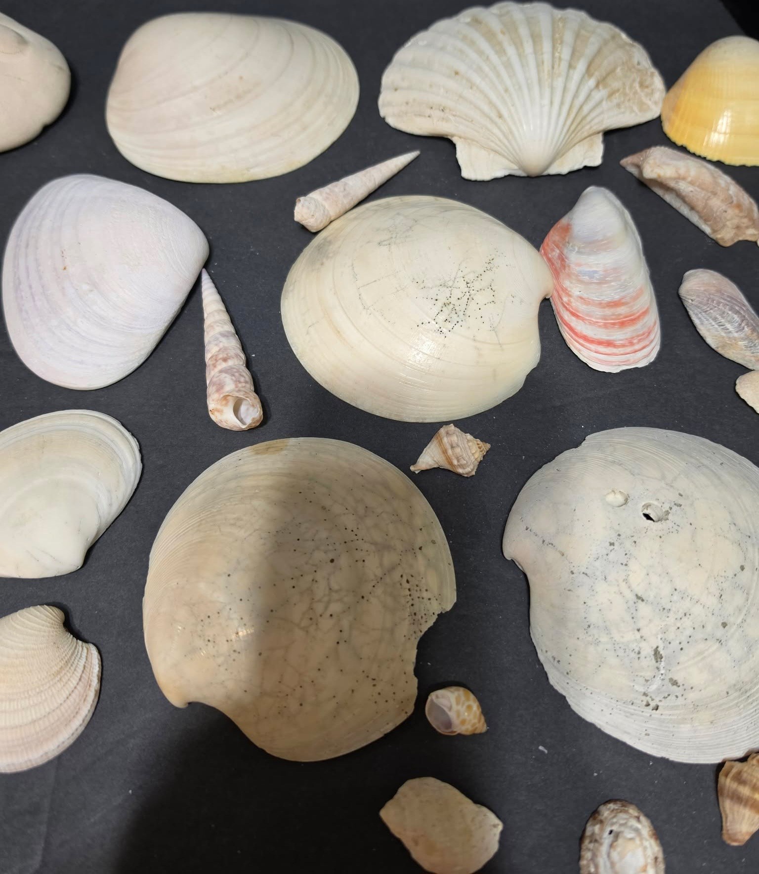 Collection of seashells, including various types of bivalves like scallops and cockles, along with gastropods and sand dollars. Largest is approximately 7" and smallest is about an inch.