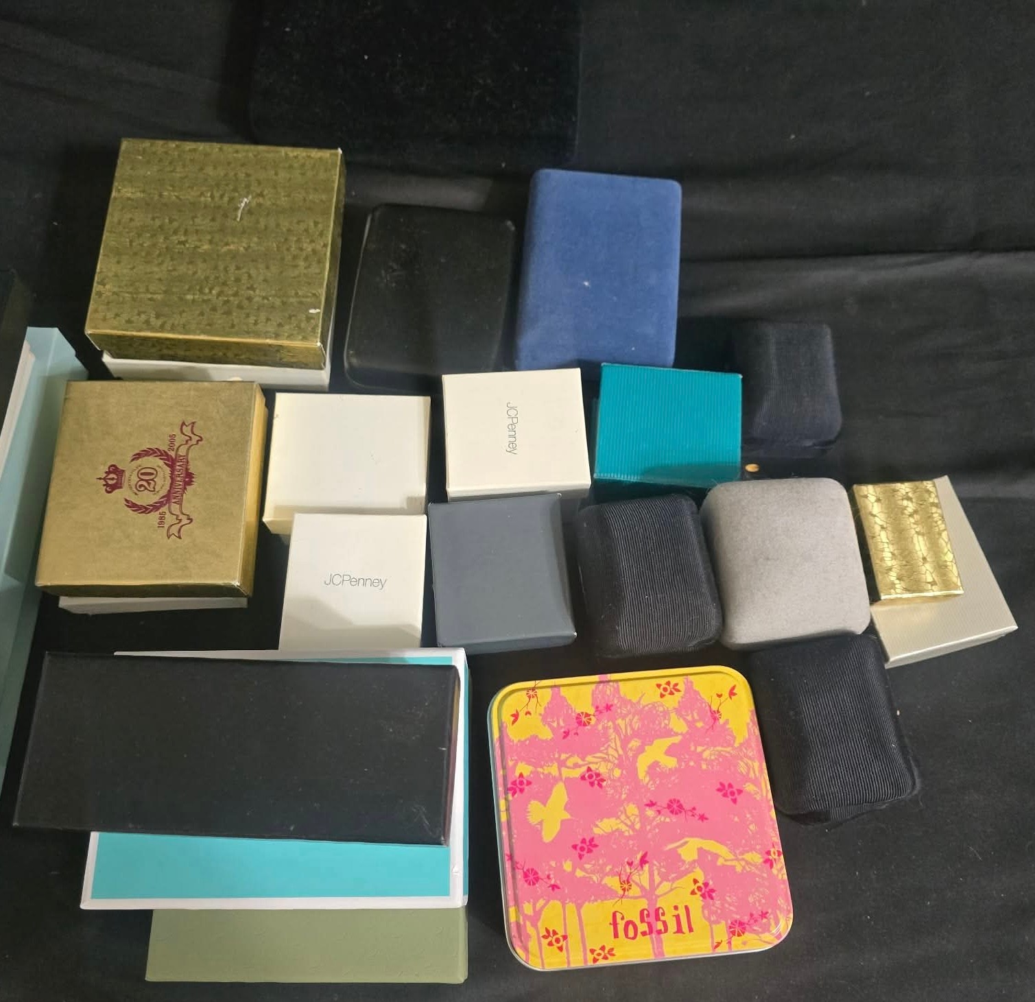 Collection of various jewelry and accessory storage boxes, including branded boxes. Great for resellers.