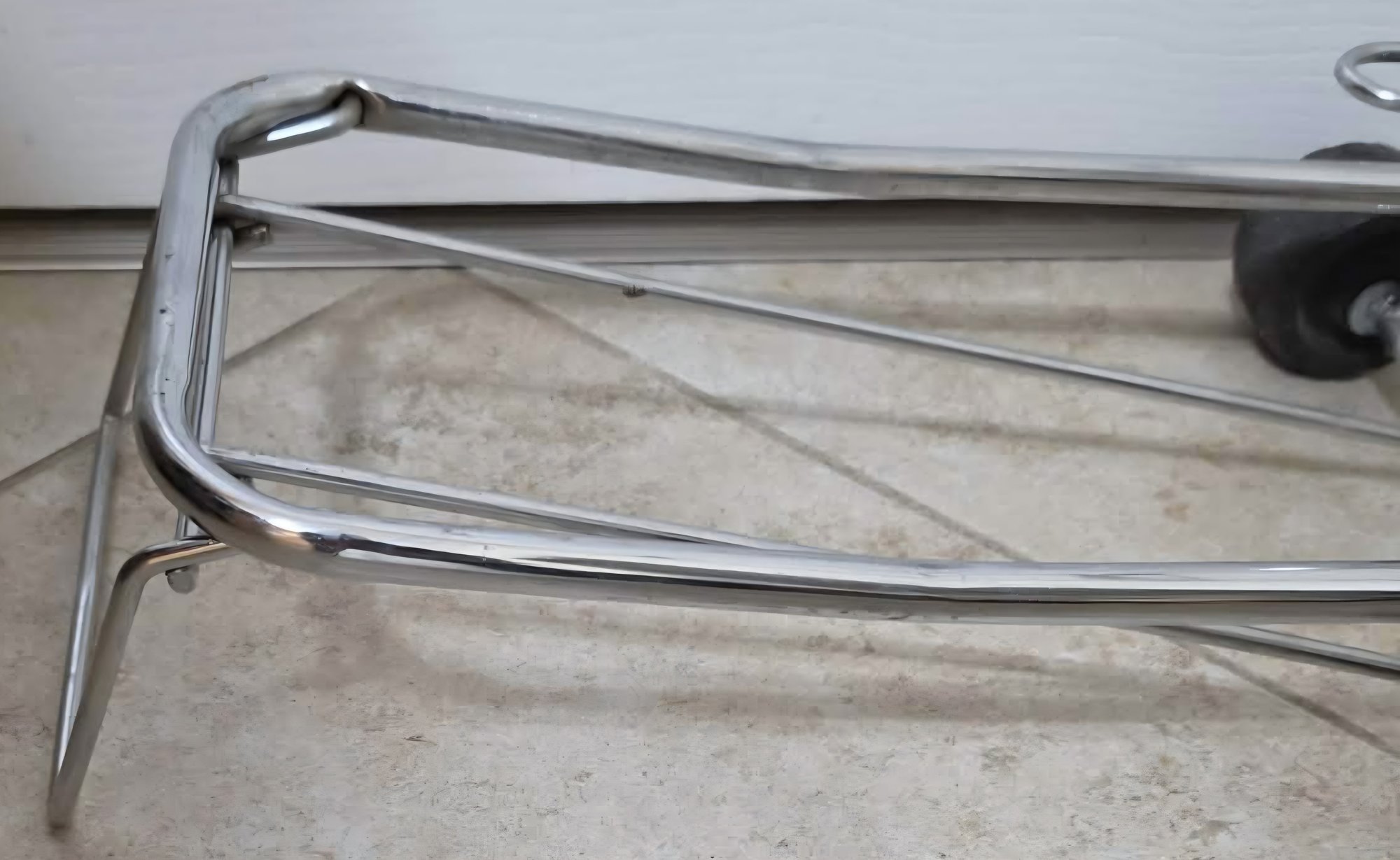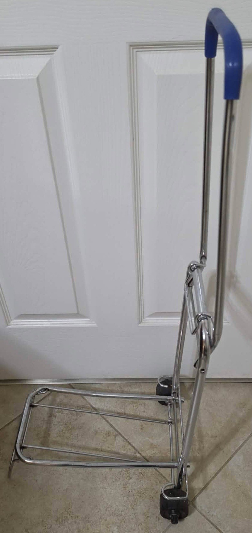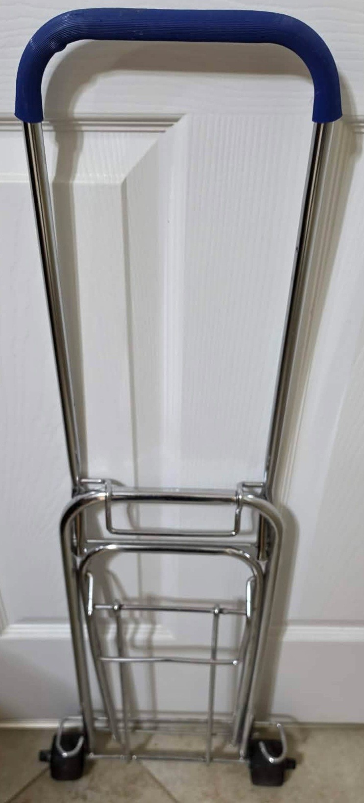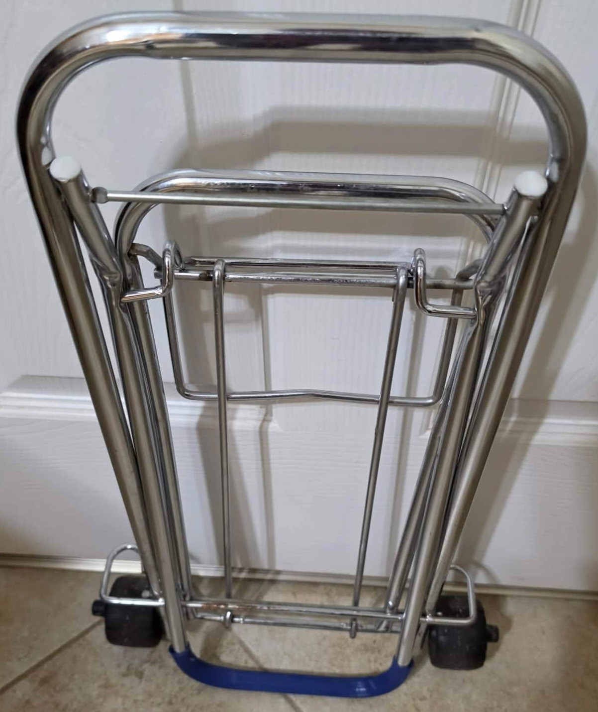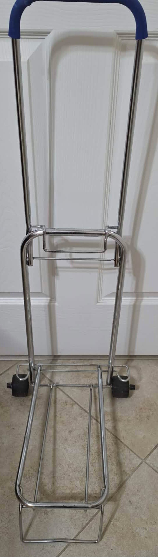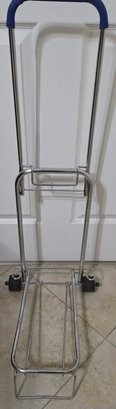 Compact luggage cart is designed with a foldable chrome frame and supports up to 150 lbs.