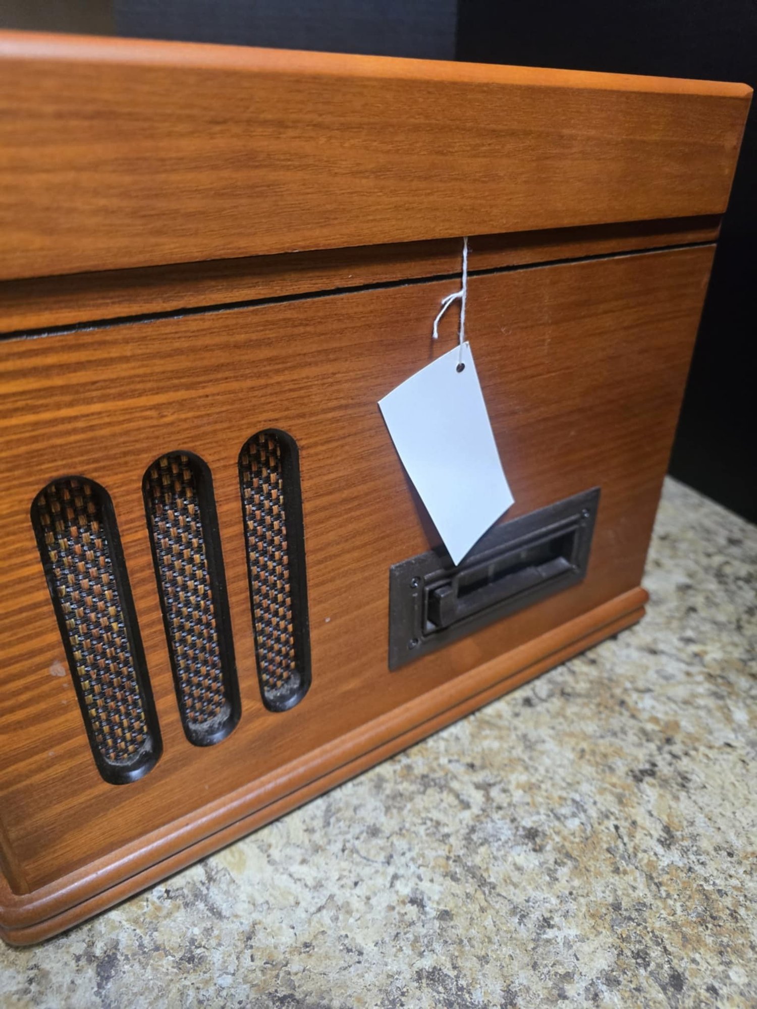 Crosley Musician Entertainment Center model CR704. Tested and works. The Turntable seems tilted a little but records play fine on it. Measures 16.5 x 12.5 x 10.