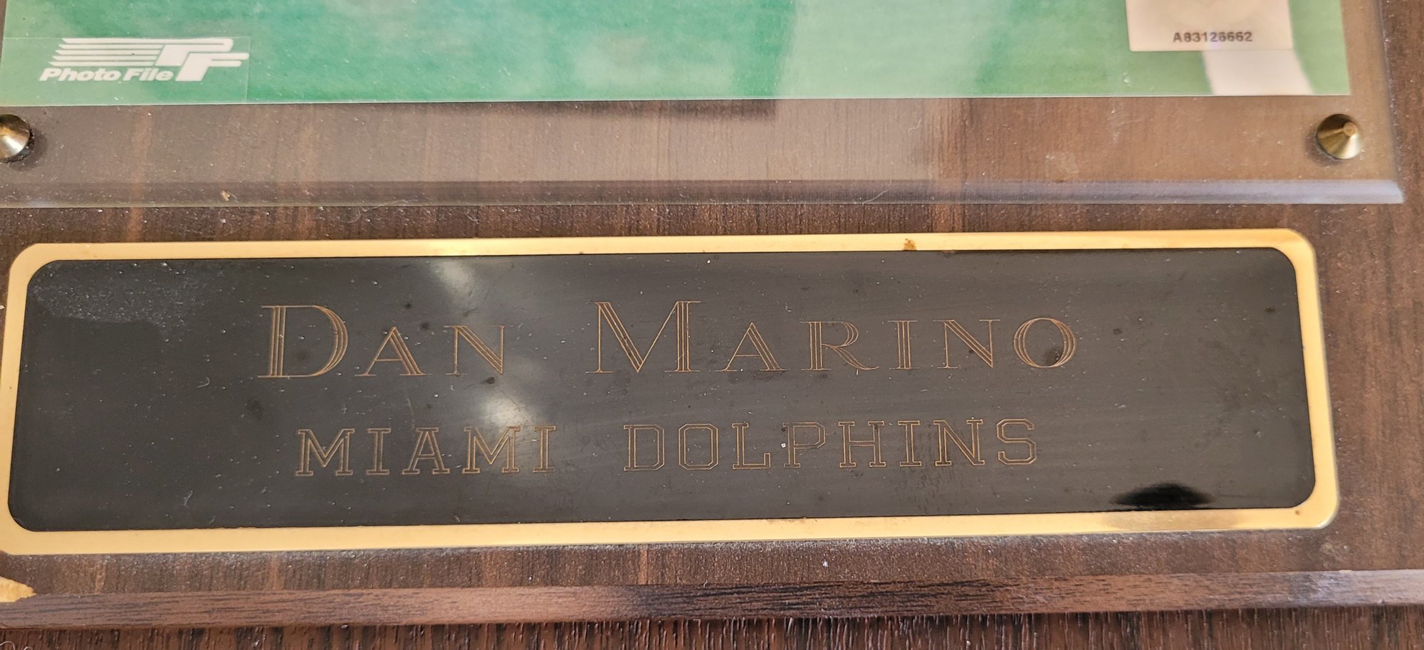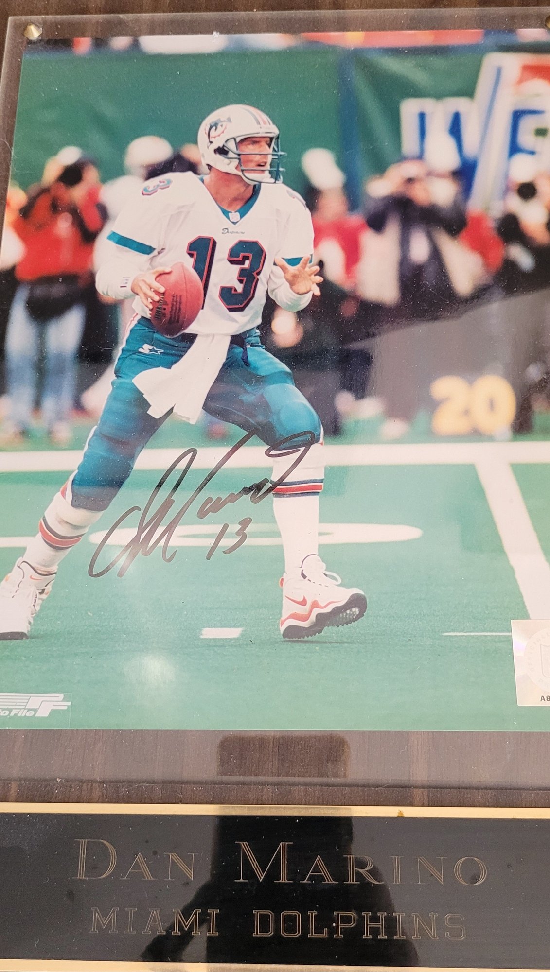 The product is an autographed plaque featuring football player Dan Marino of the Miami Dolphins. This original photo is signed by Marino himself, making it a valuable collectible item for fans of the Miami Dolphins and football enthusiasts alike. Perfect for display in any sports memorabilia collection, this plaque captures a piece of football history with Marino's legendary signature.