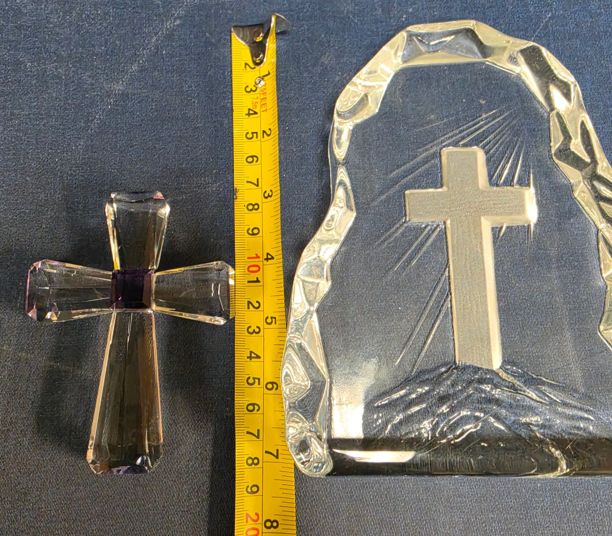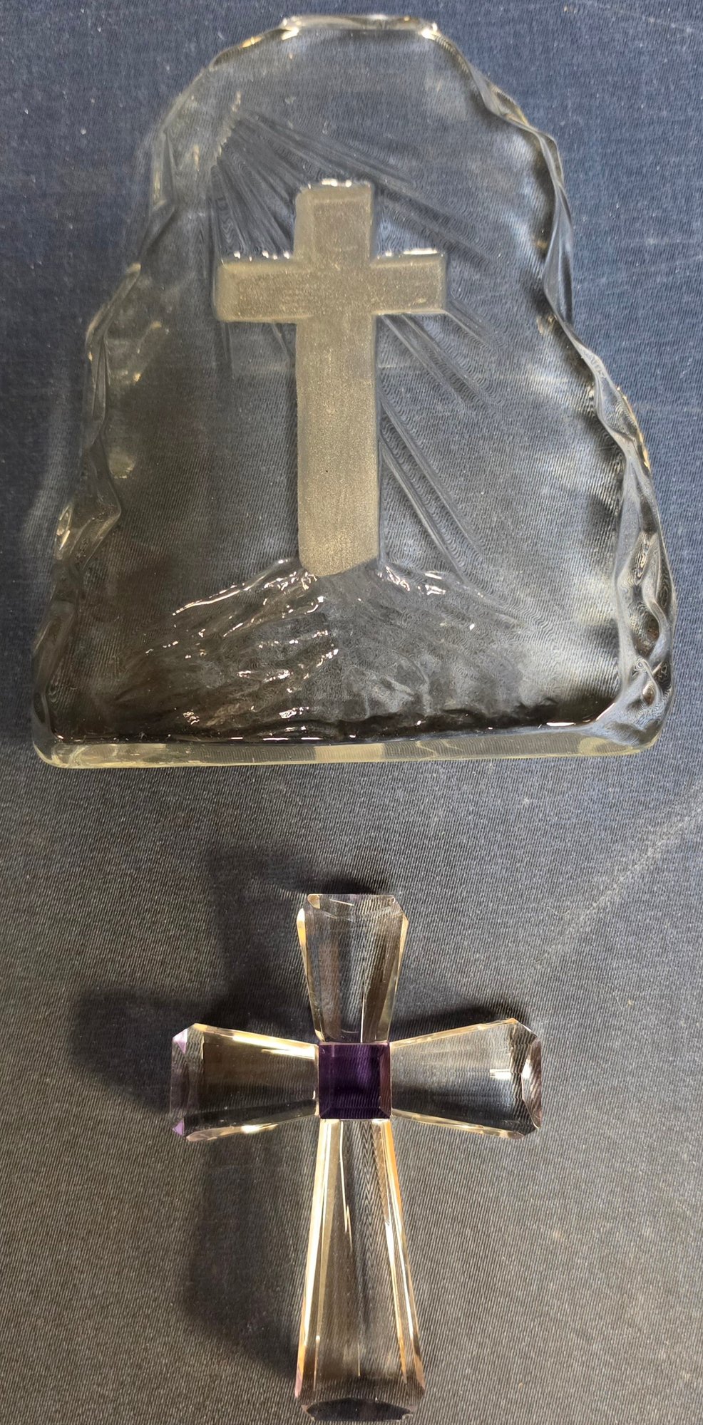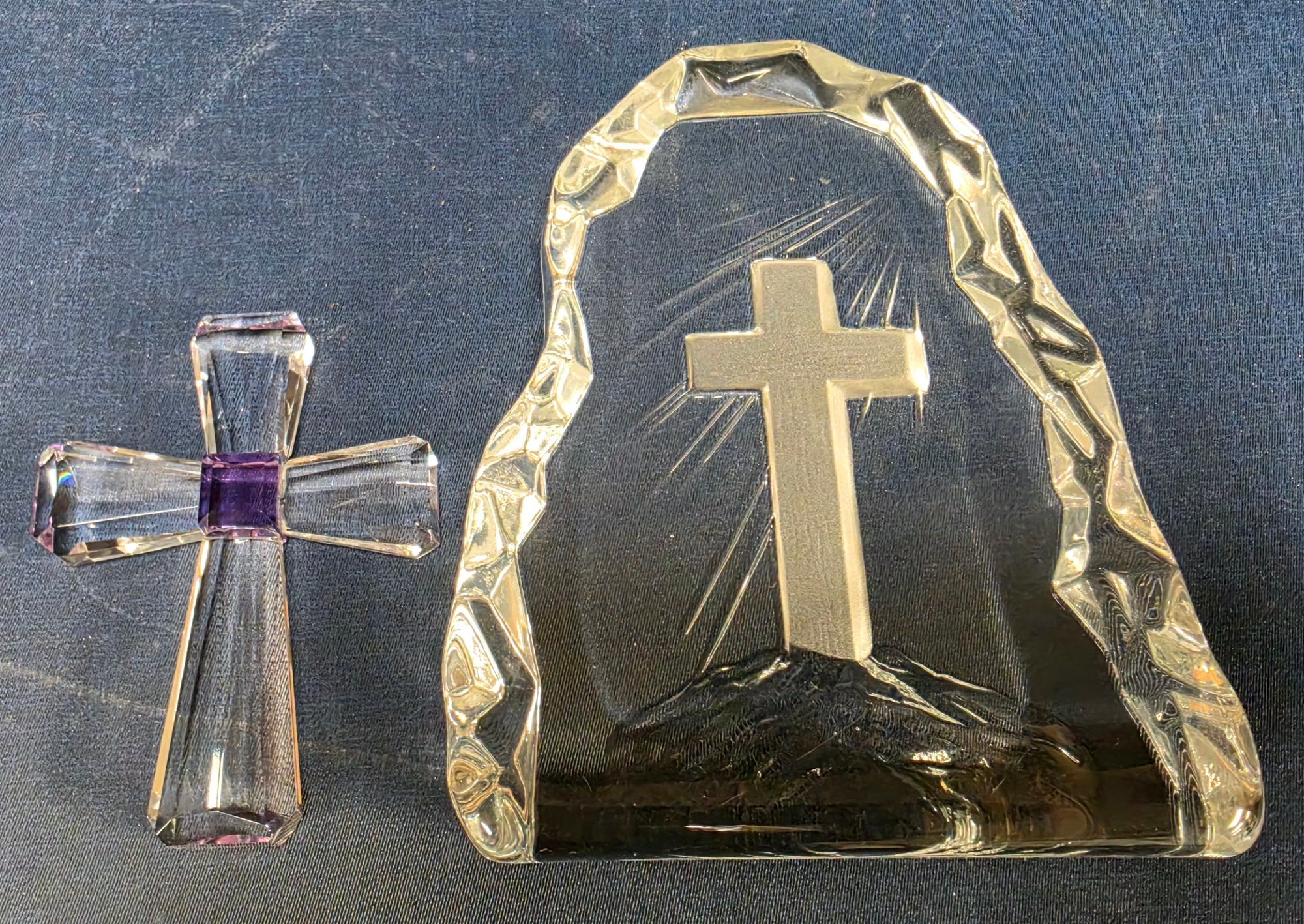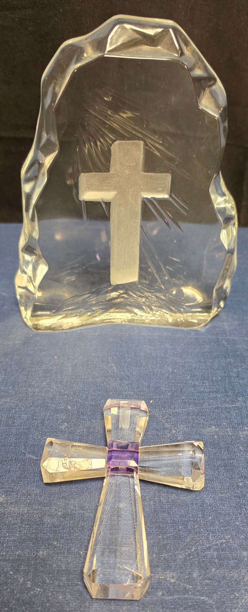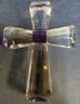 Decorative glass collectible figurines, featuring a "Viking Glass" iceberg-style paperweight with an etched cross, and a smaller purple-accented crystal cross. Please see all pics for details.