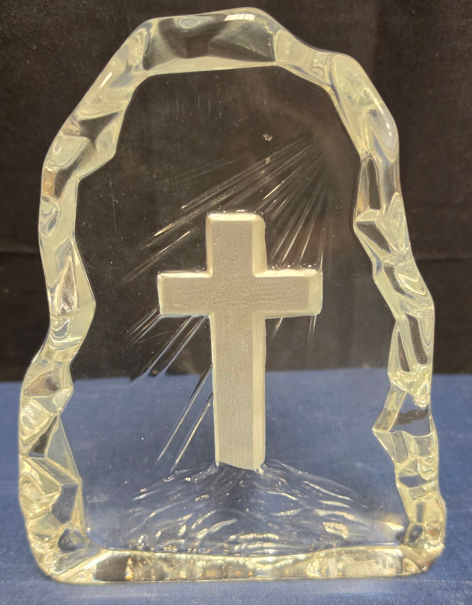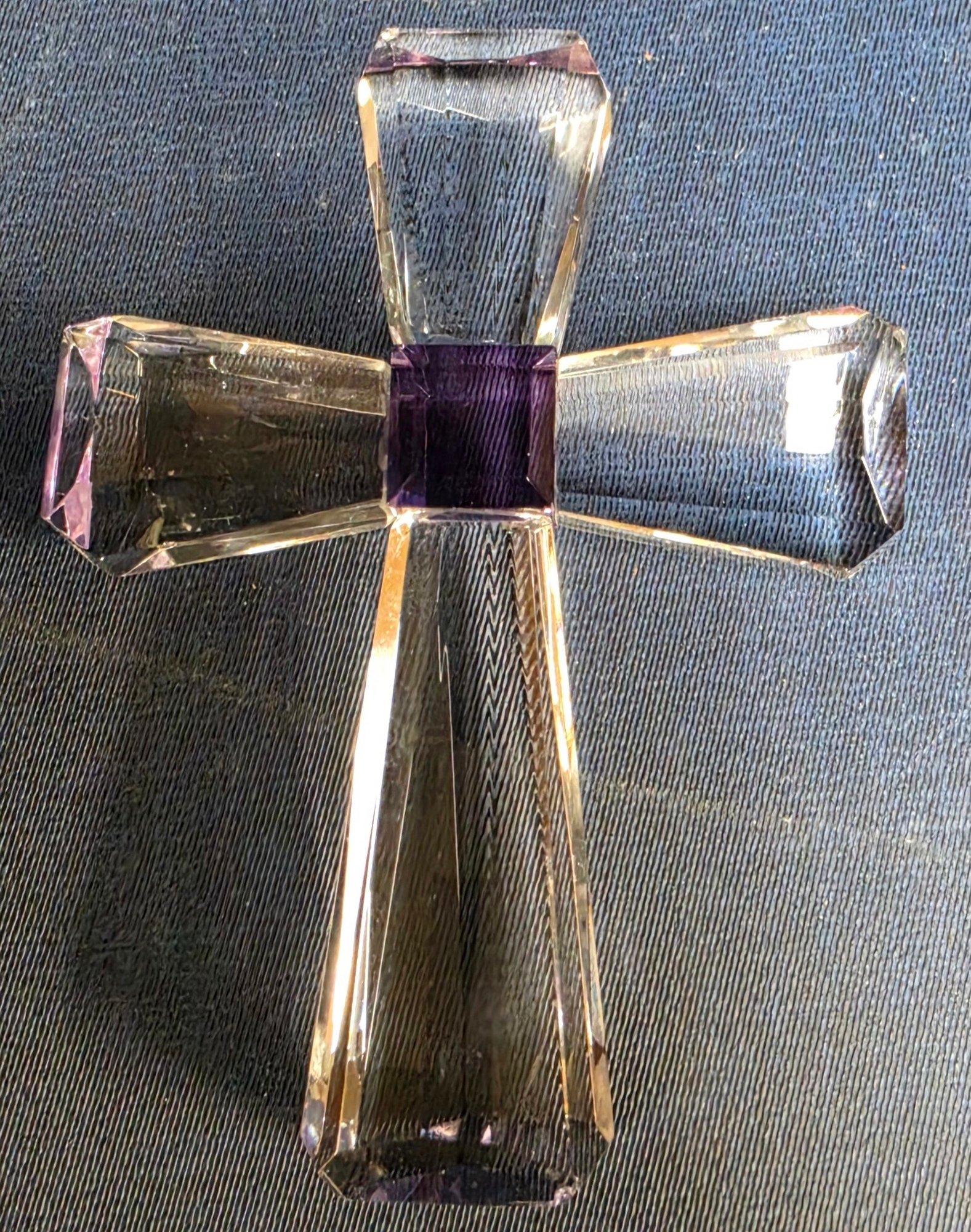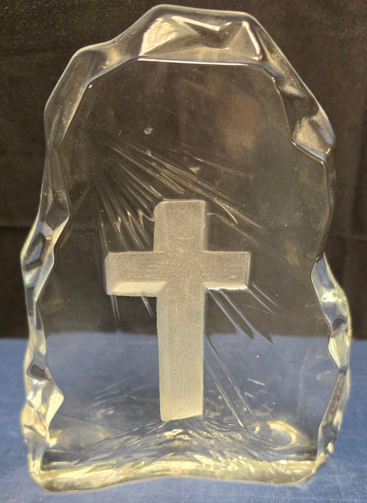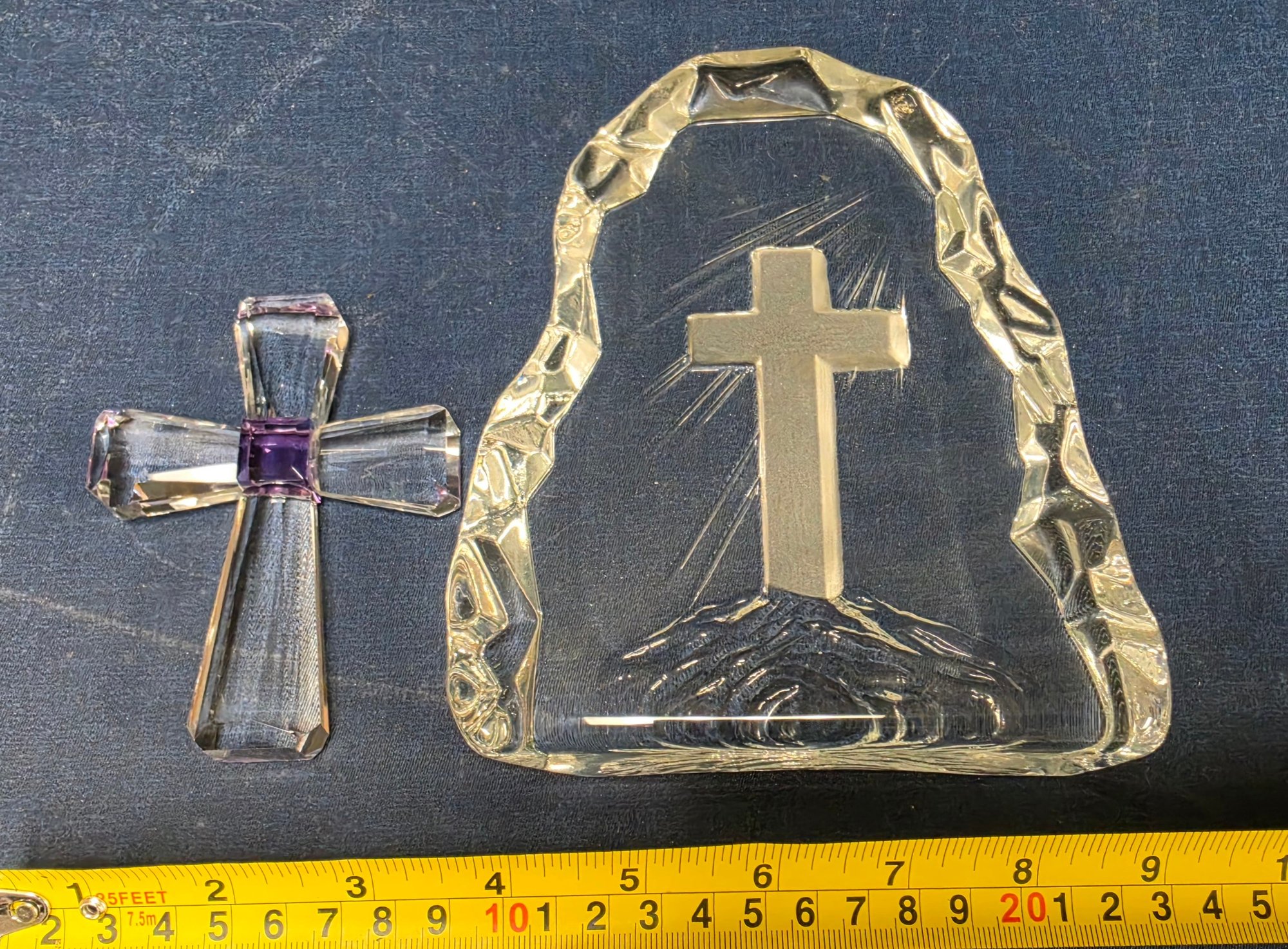Decorative glass collectible figurines, featuring a "Viking Glass" iceberg-style paperweight with an etched cross, and a smaller purple-accented crystal cross. Please see all pics for details.