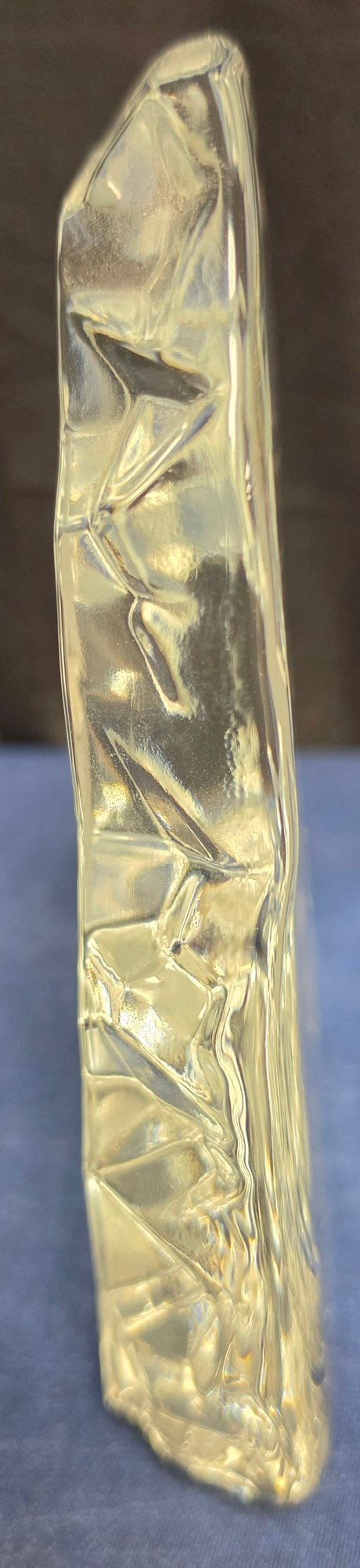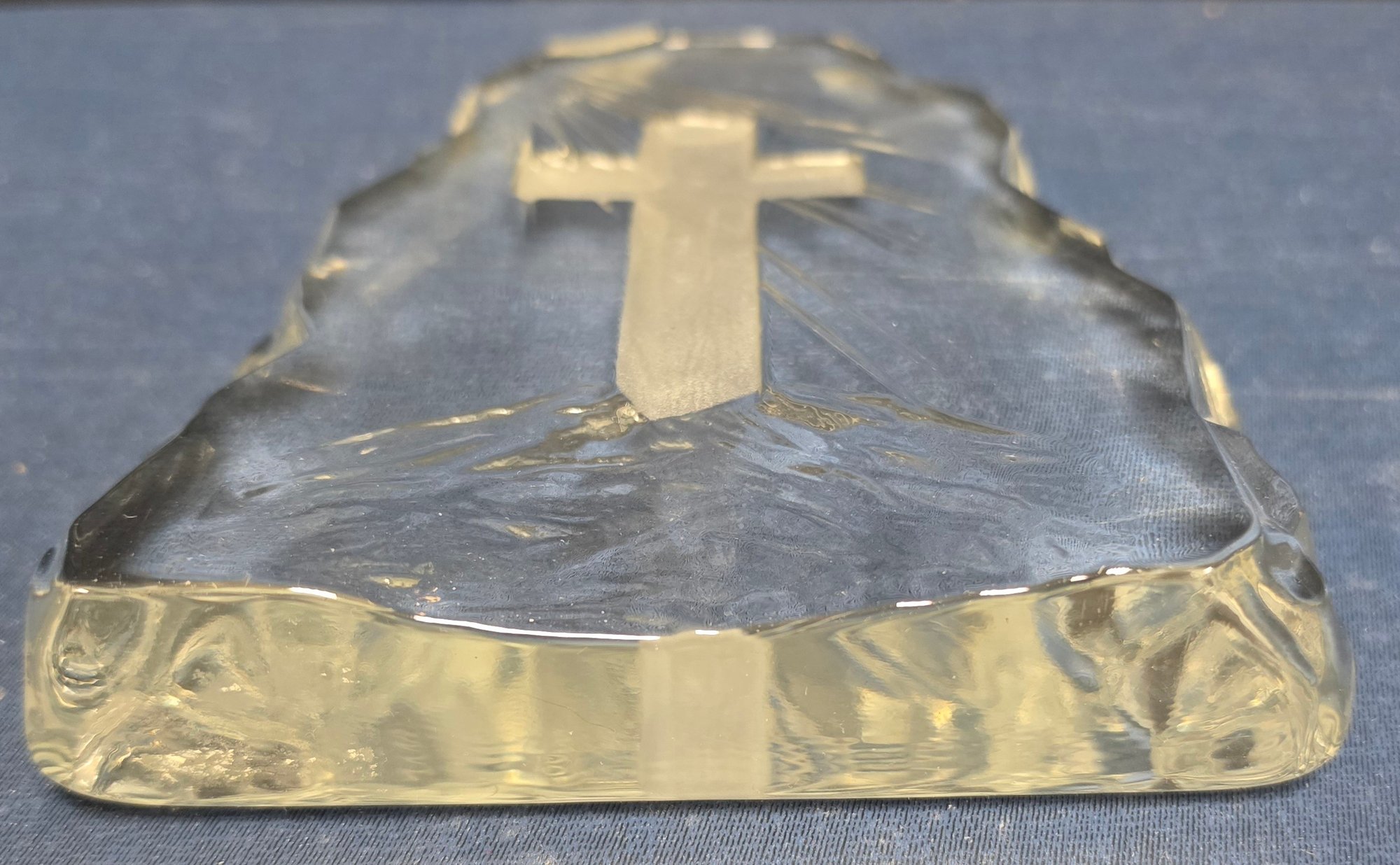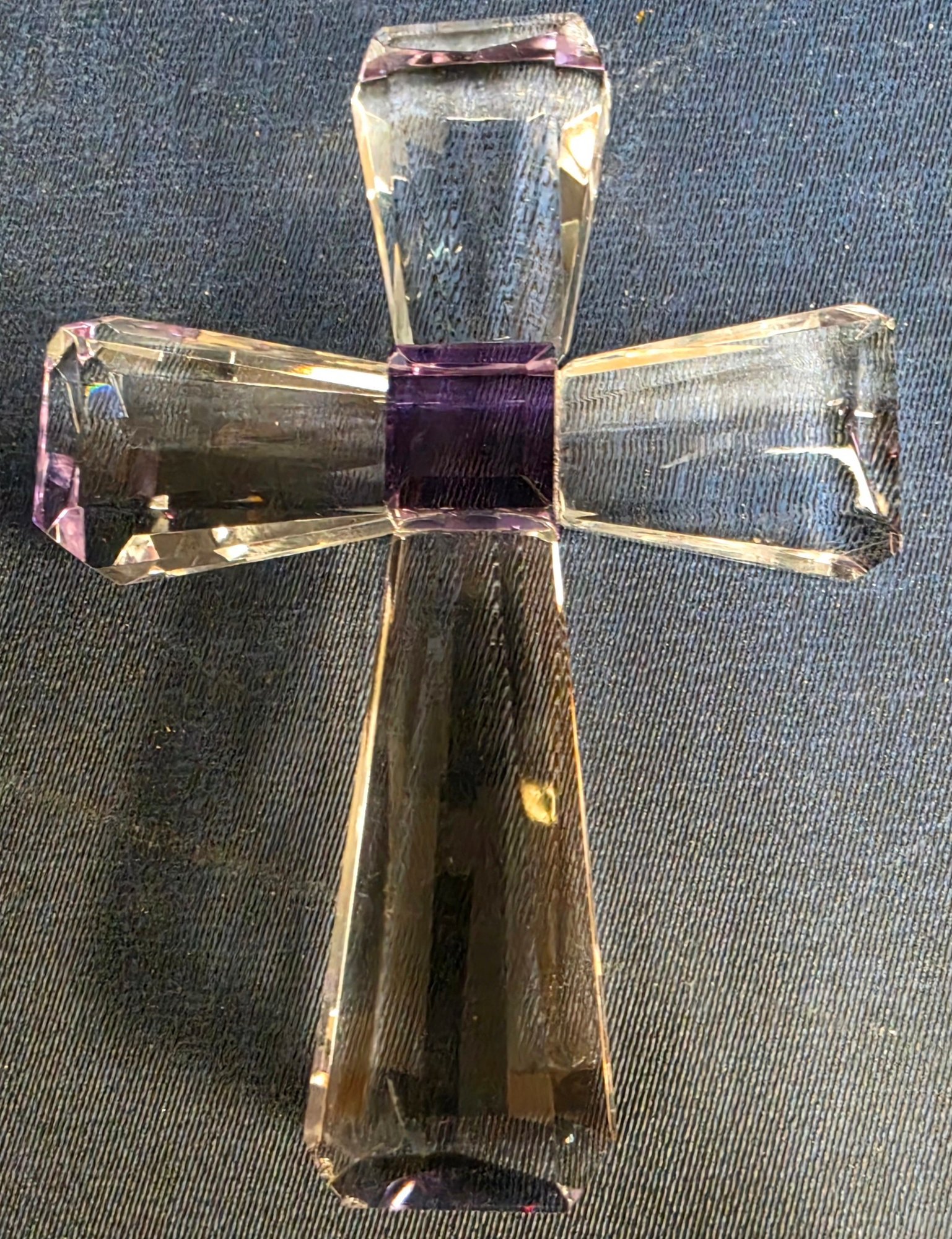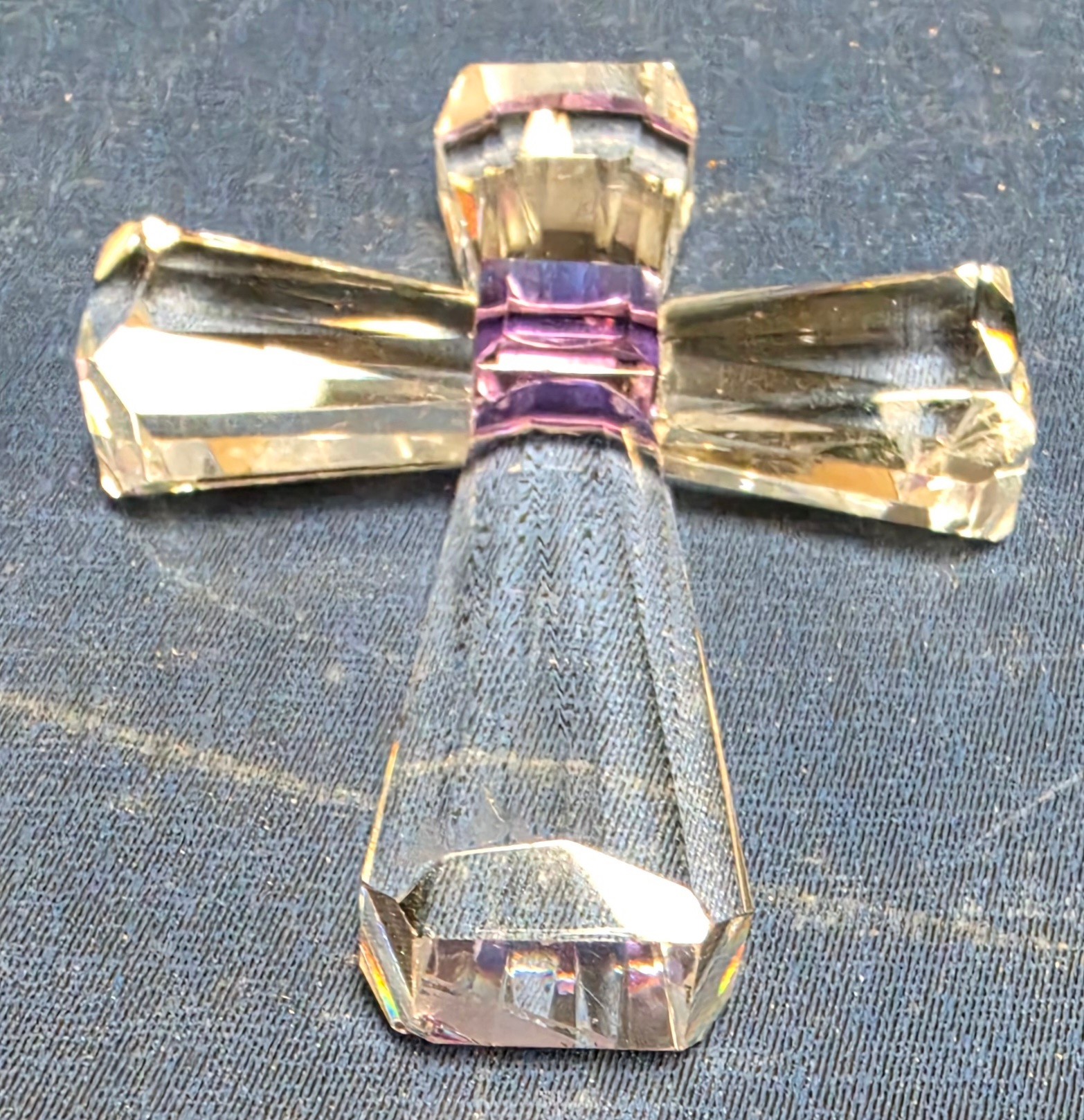 Decorative glass collectible figurines, featuring a "Viking Glass" iceberg-style paperweight with an etched cross, and a smaller purple-accented crystal cross. Please see all pics for details.