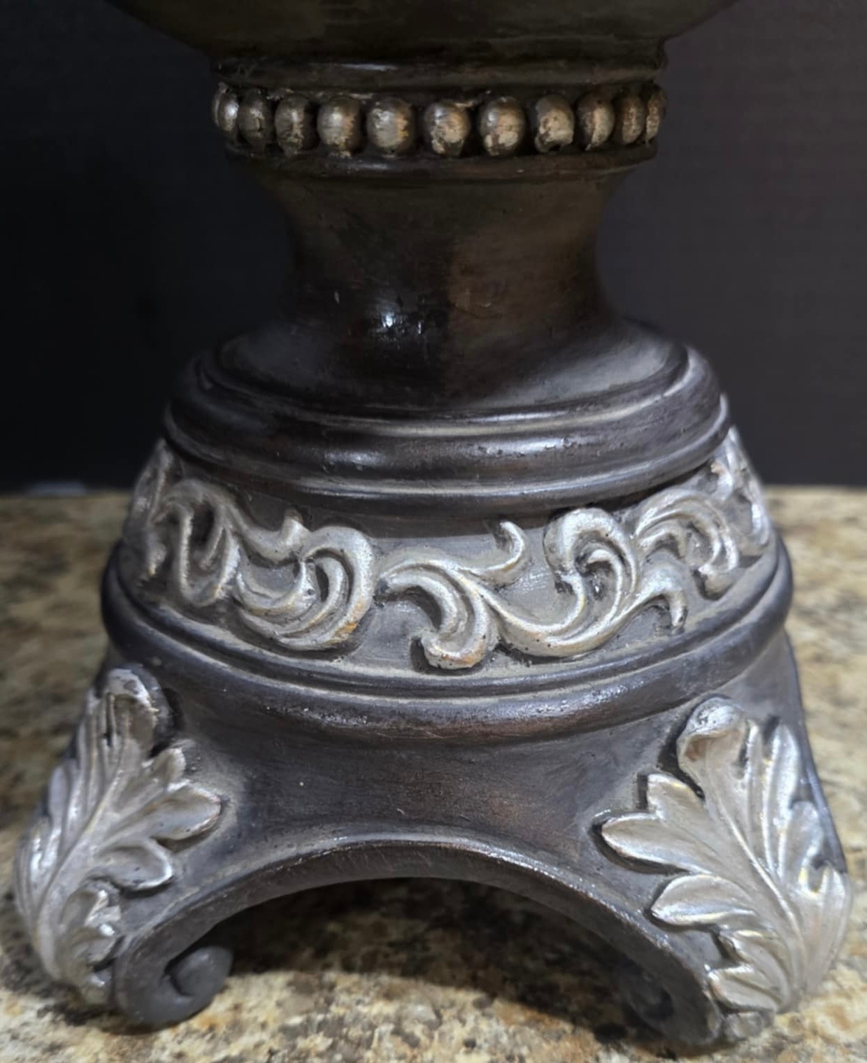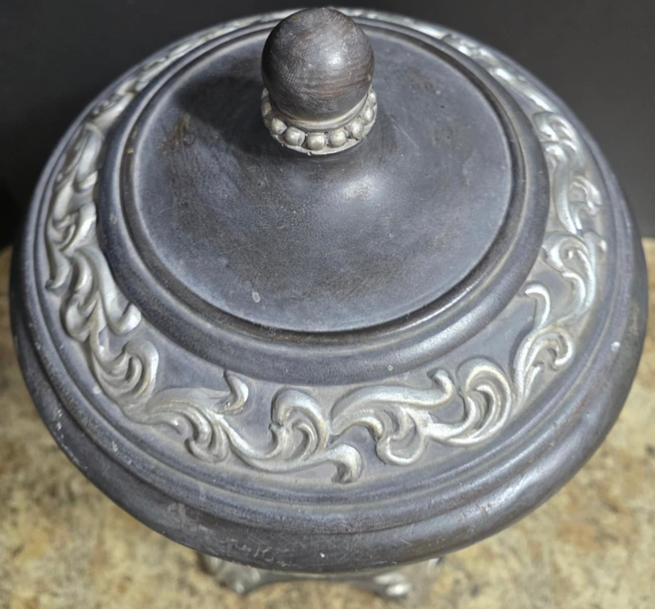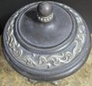 Decorative lidded urn or jar with carved accents. Looks to be a type of composite. Measures 8.5w x 18h. Some small chips. Under lid piece is missing part.