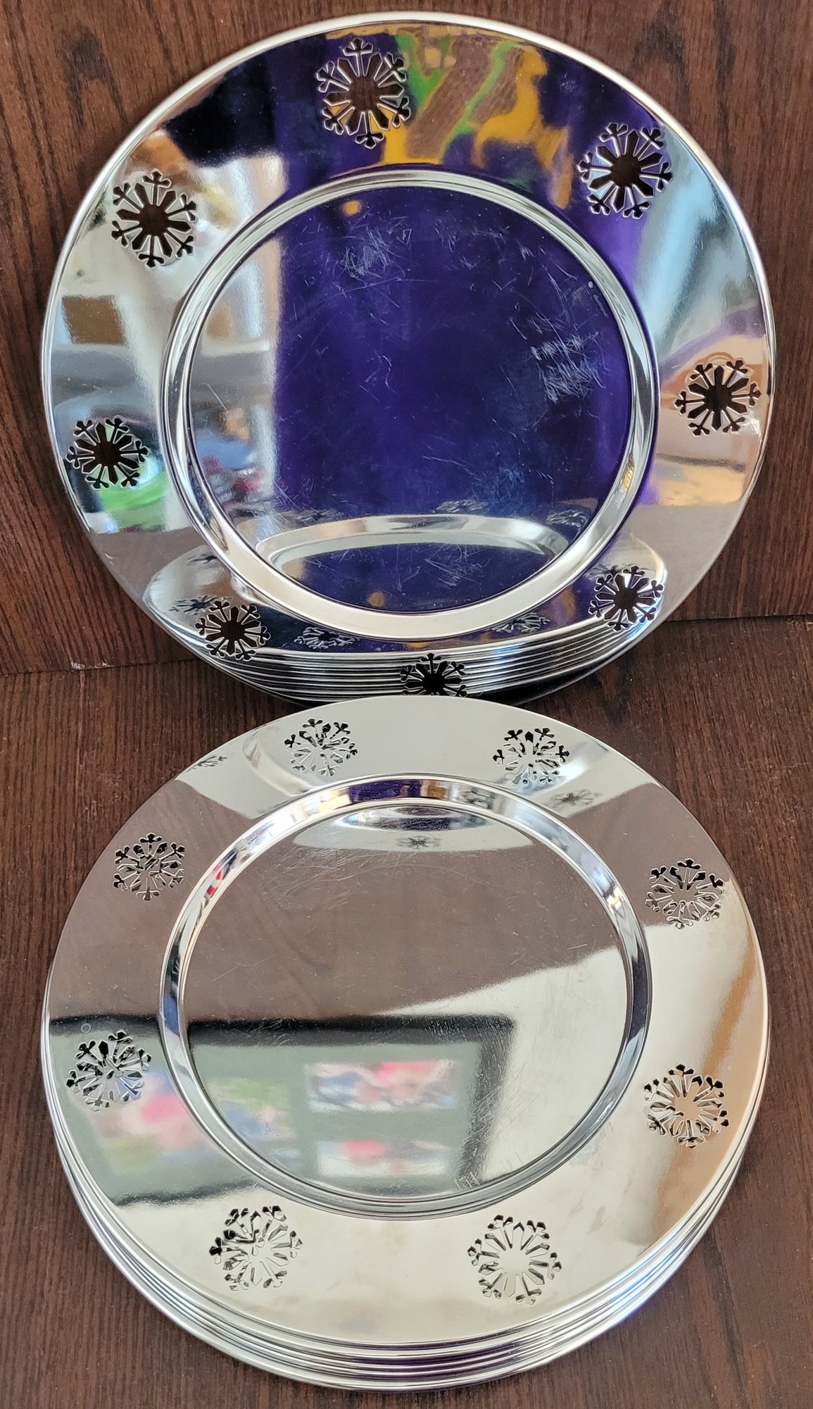 This lot comes with 10 chargers. Each of them measures 12.75" in diameter. See pictures for details.