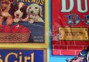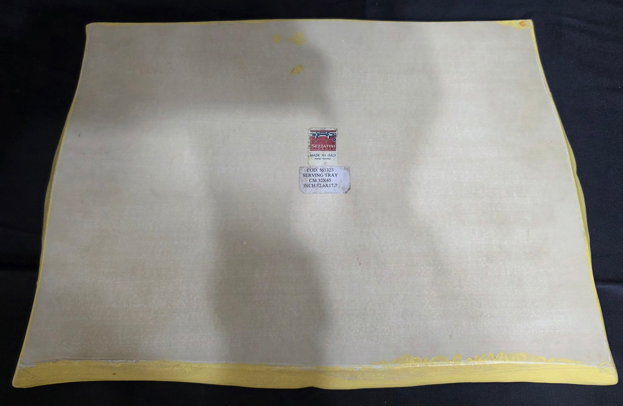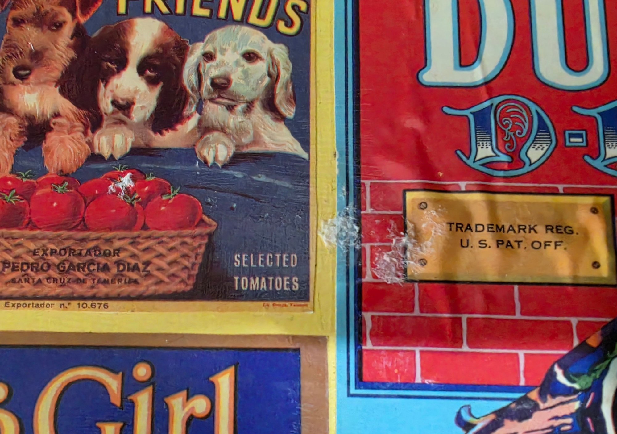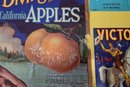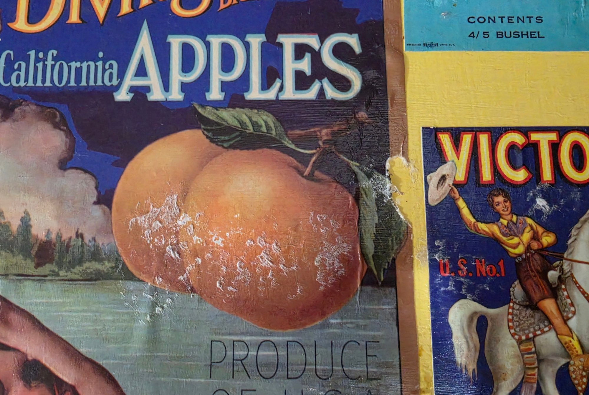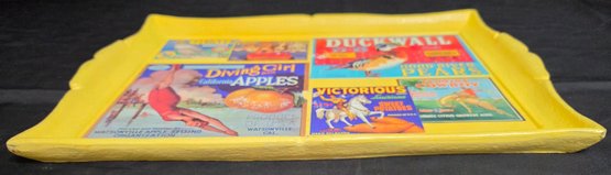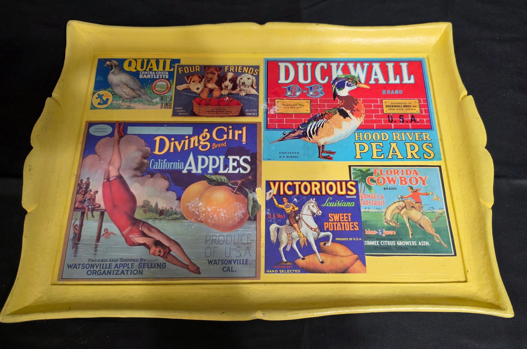 Decorative tray or platter featuring a collage of vintage agricultural crate labels, Some damage to stickers. Please see all pics for details