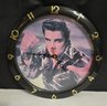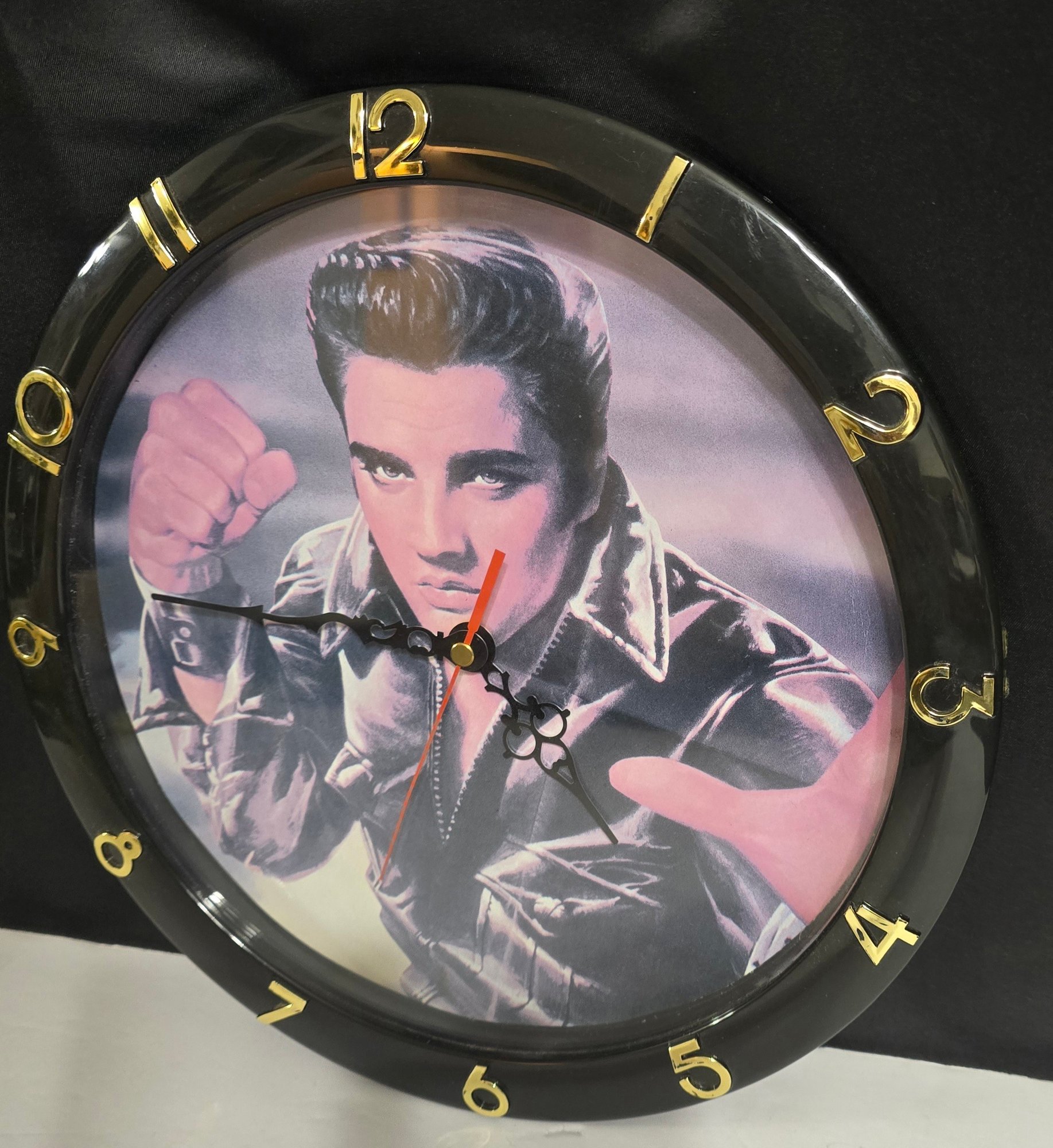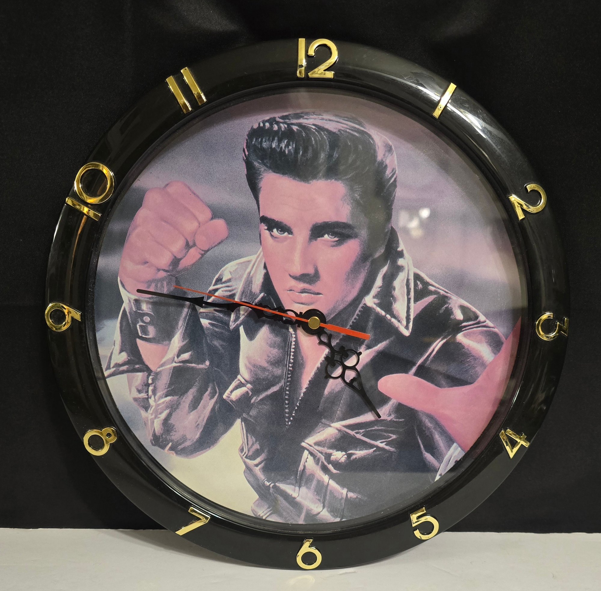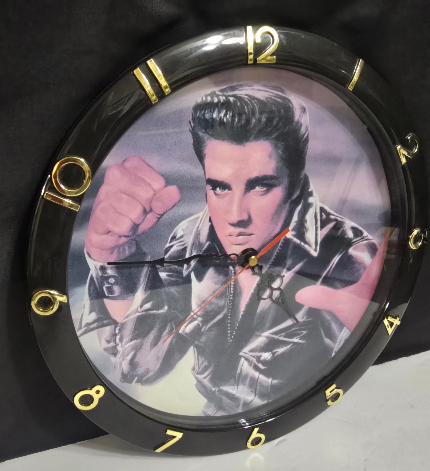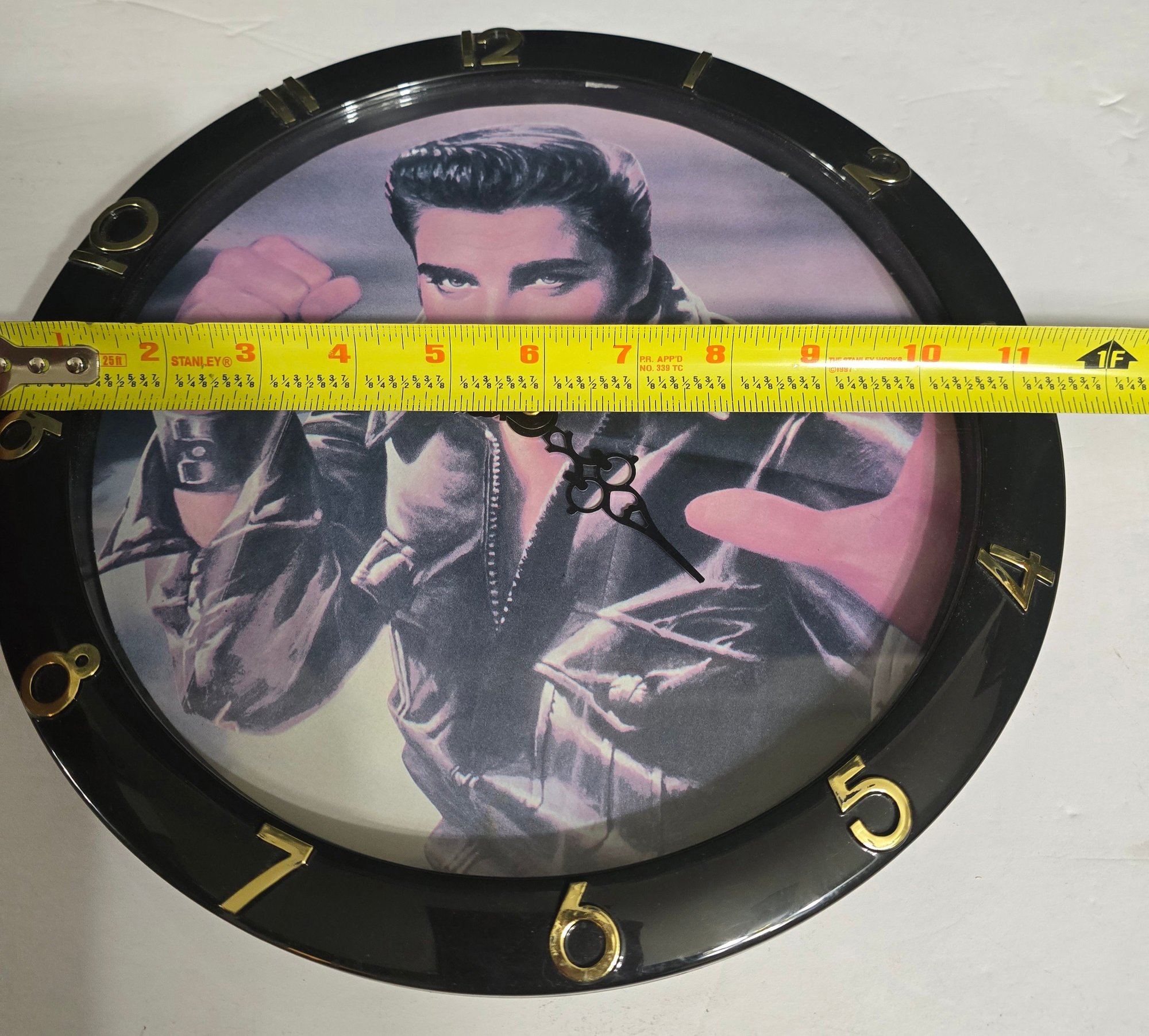 Decorative wall clock featuring a portrait of Elvis Presley, works. Please see all pics for details.