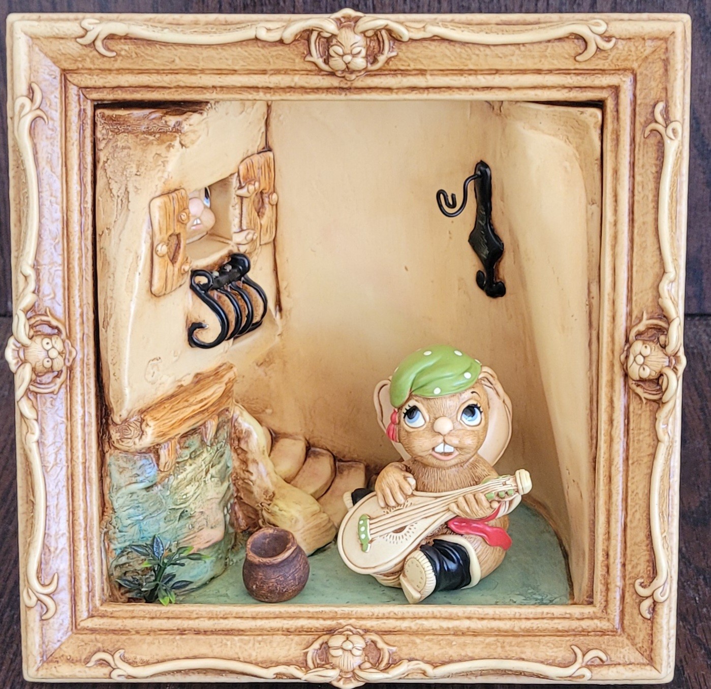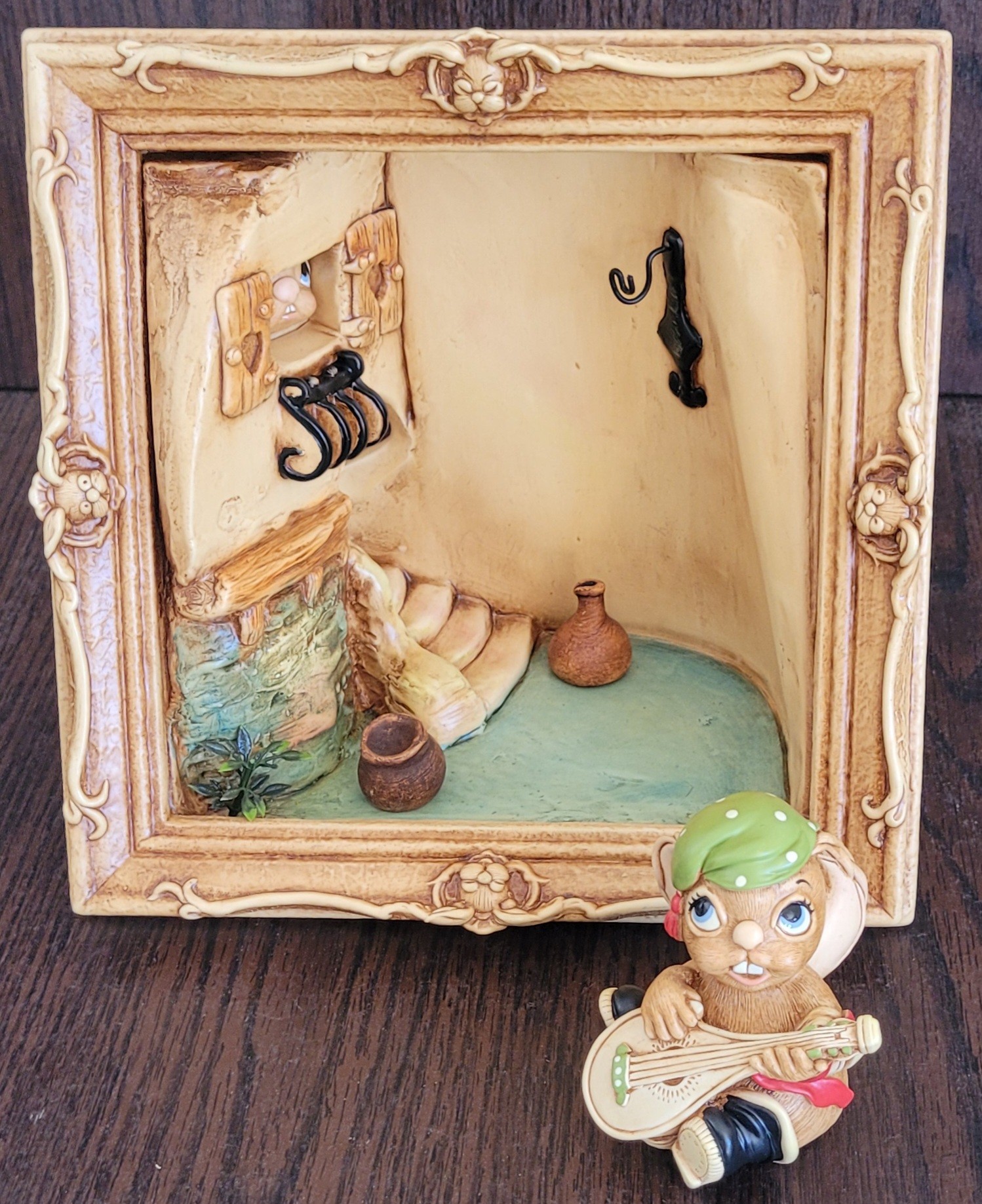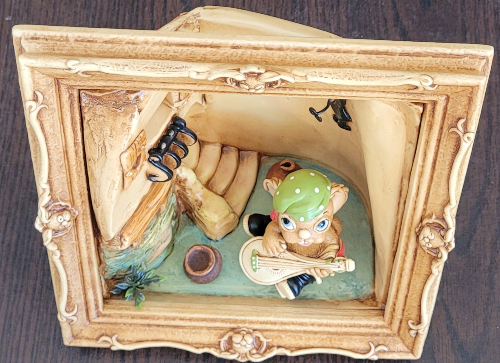 This measures 8.5" long by 8.5" tall by 5.5" deep. The bunny that it comes with is Casanova. There is a spot on the back of the scene that is missing some paint. See pictures for details.
