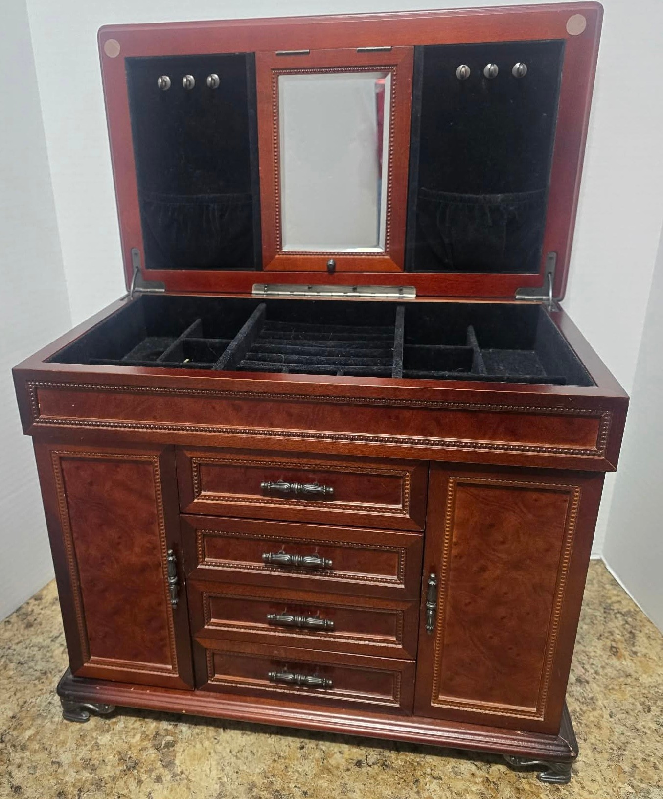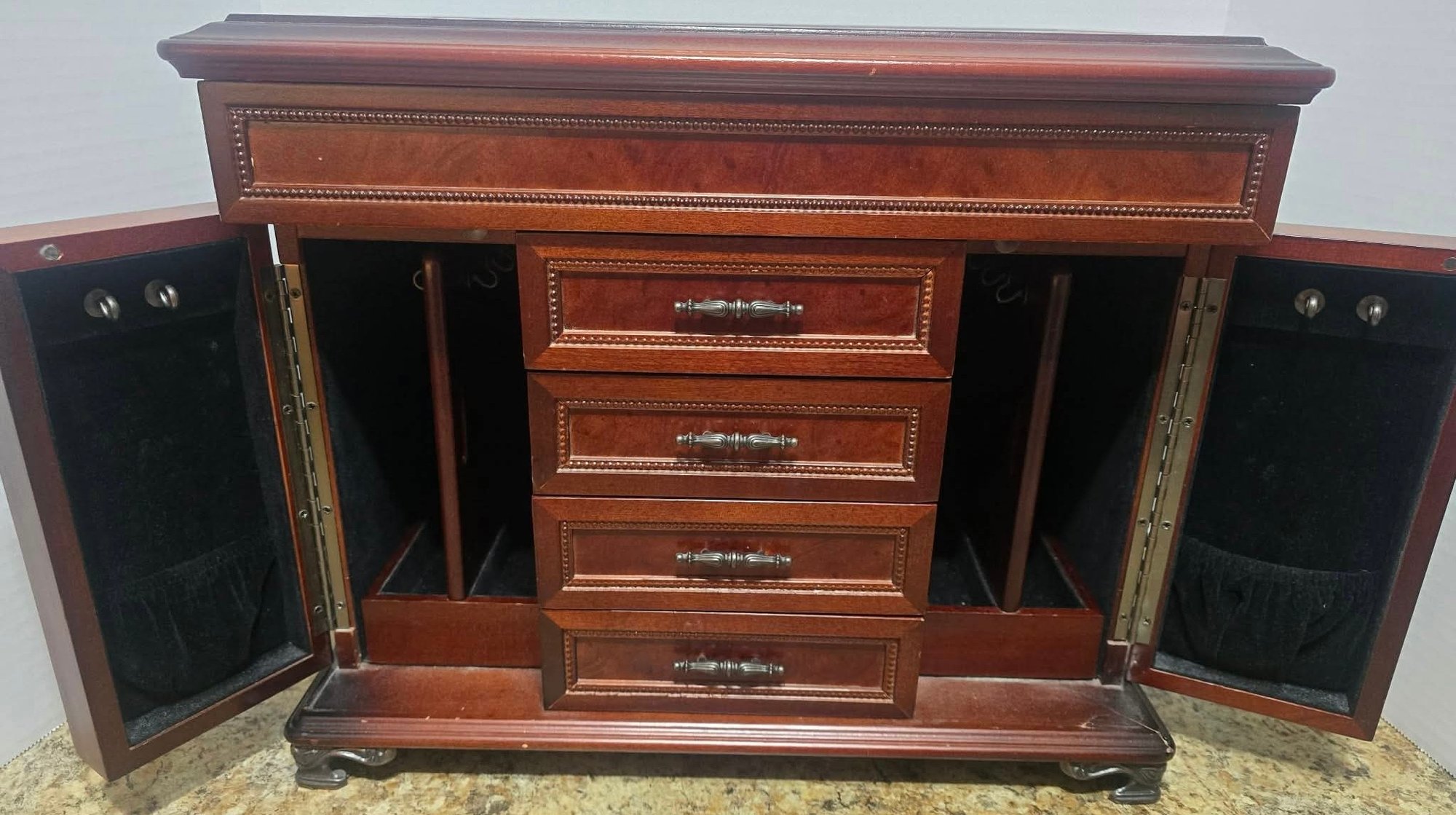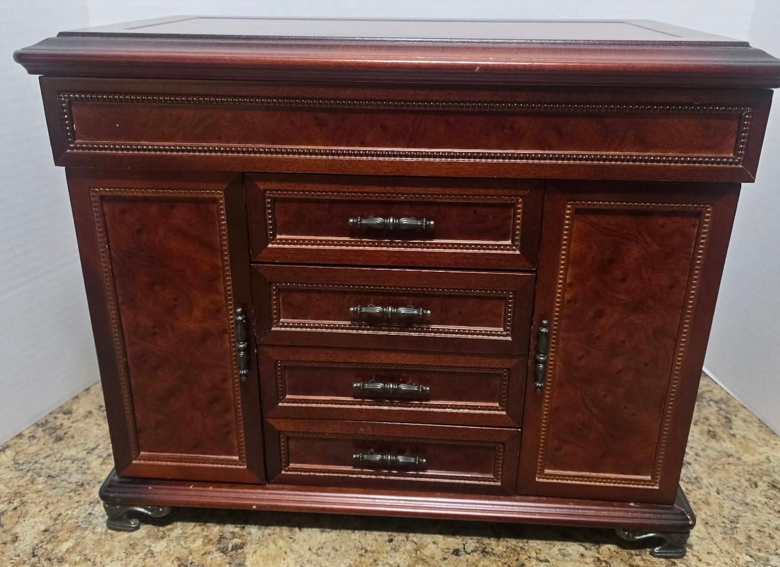 Neoclassical inspired jewelry chest. Good used condition. Measures 16 x 9.25 x 13.