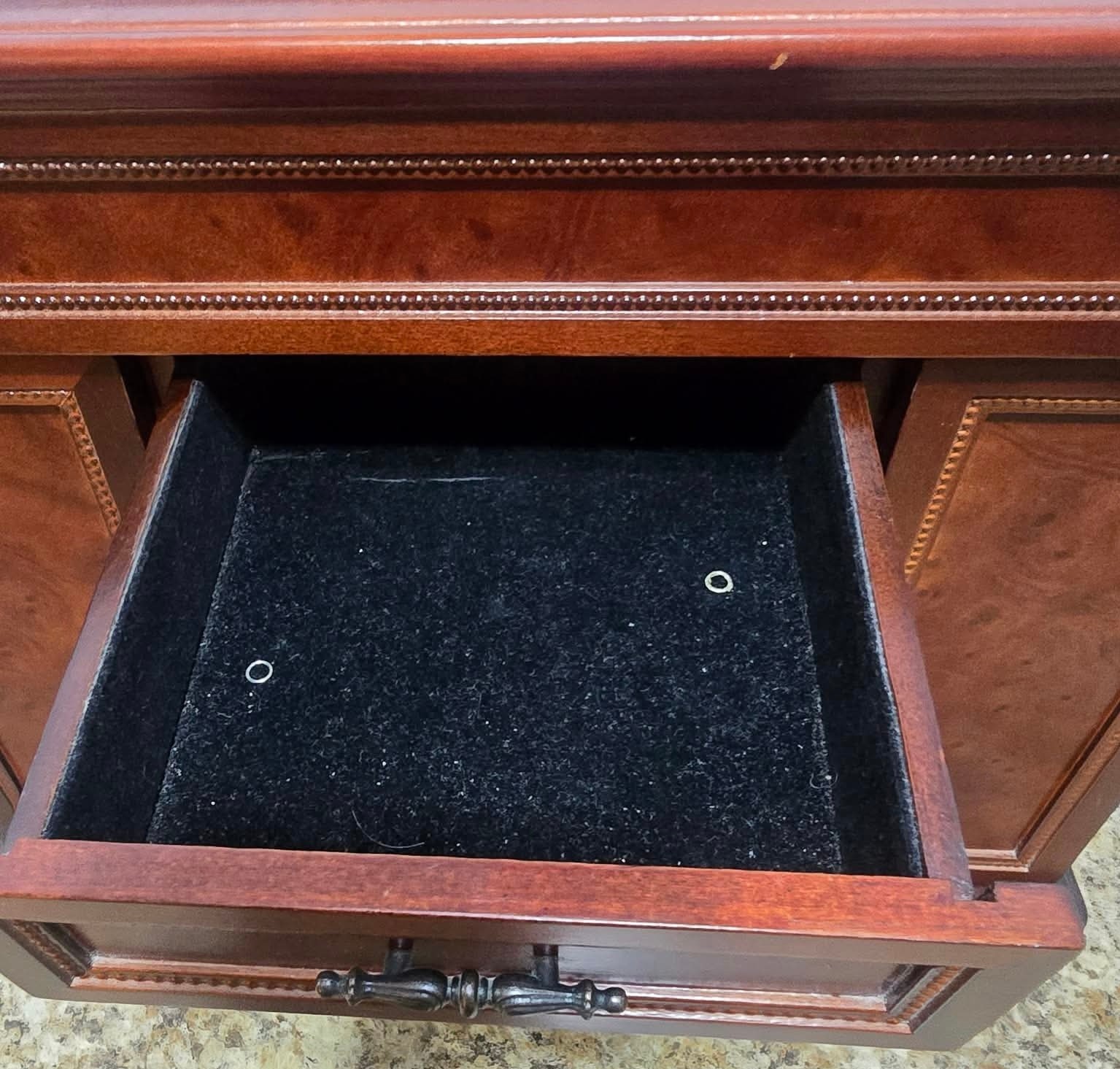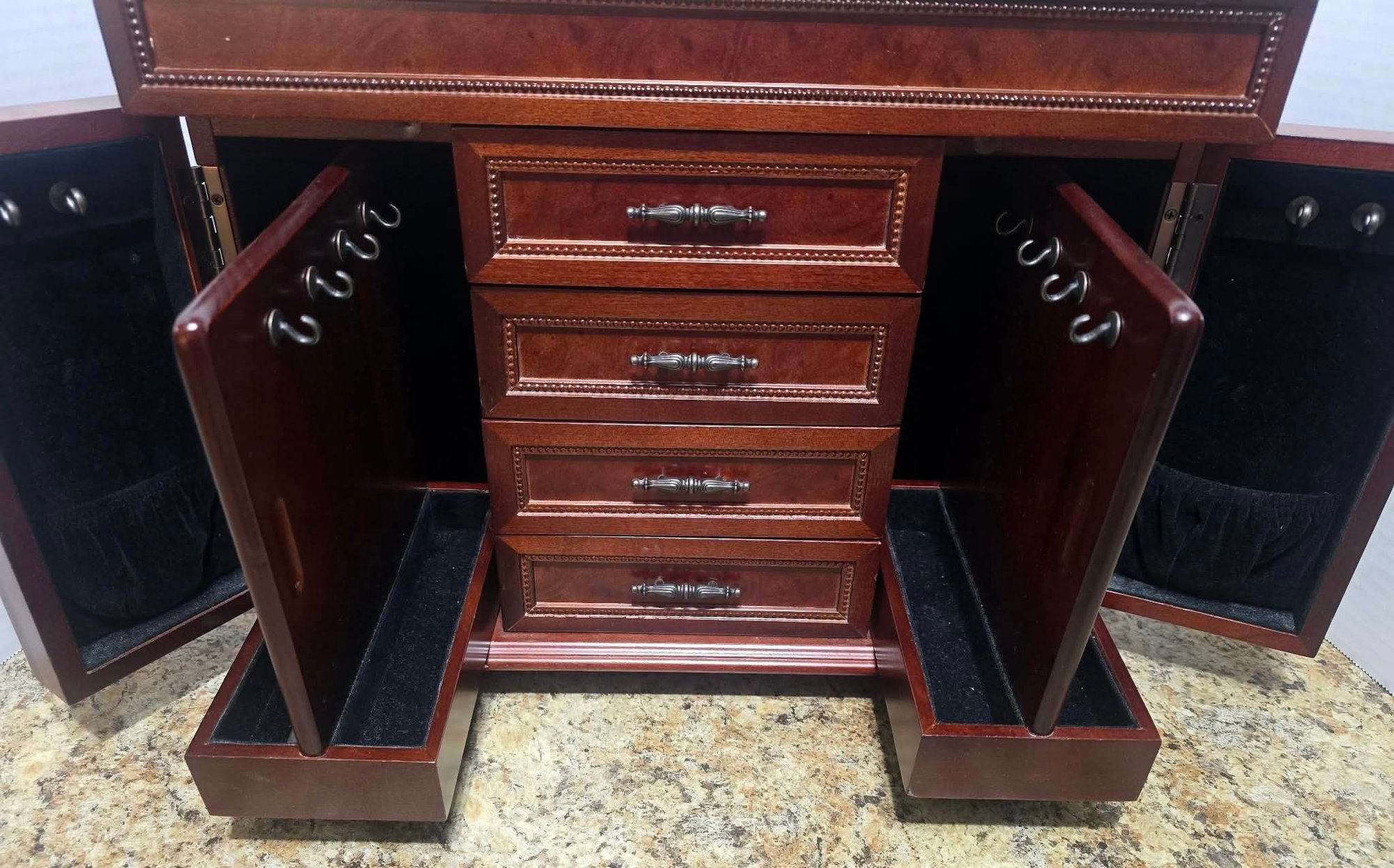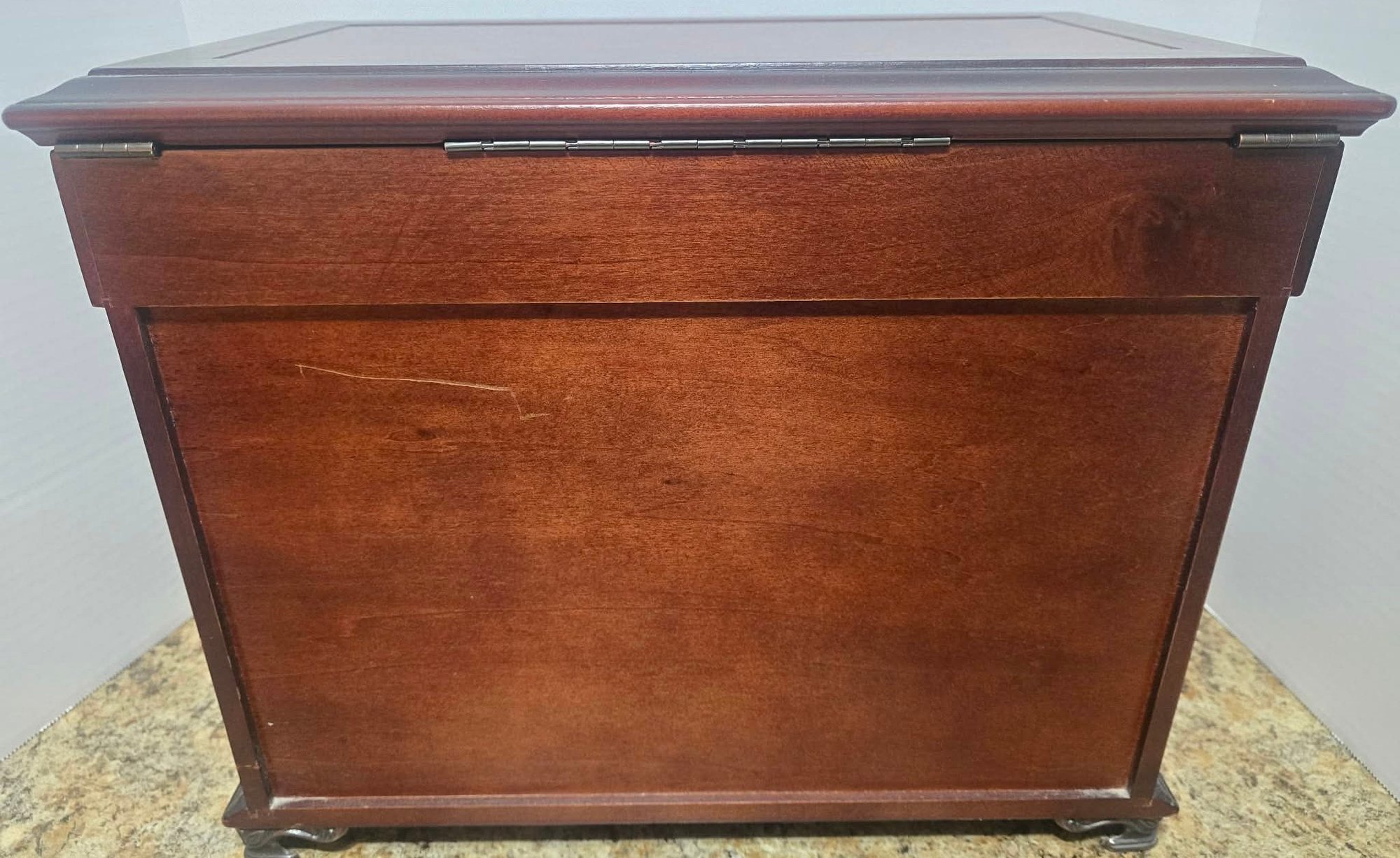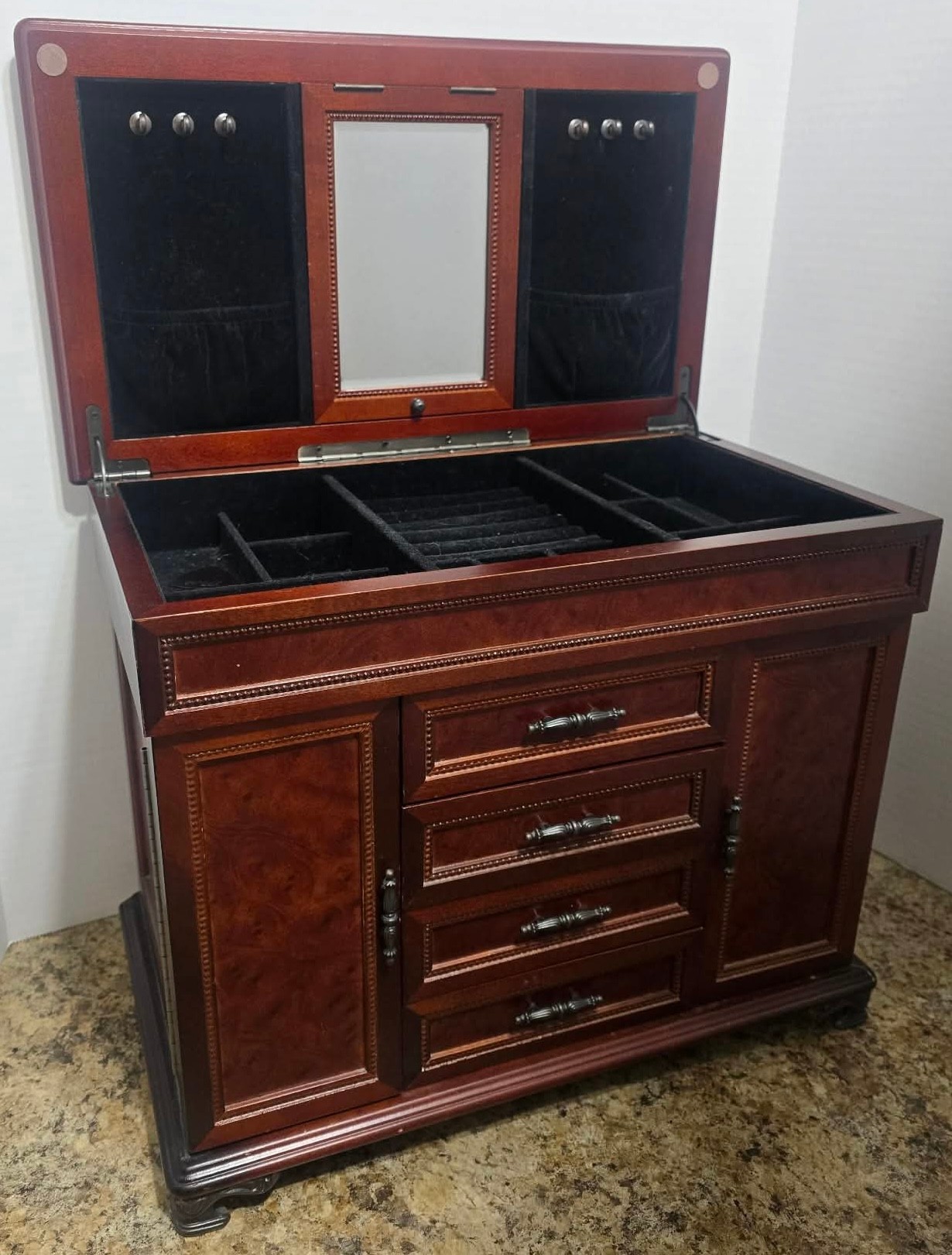 Neoclassical inspired jewelry chest. Good used condition. Measures 16 x 9.25 x 13.